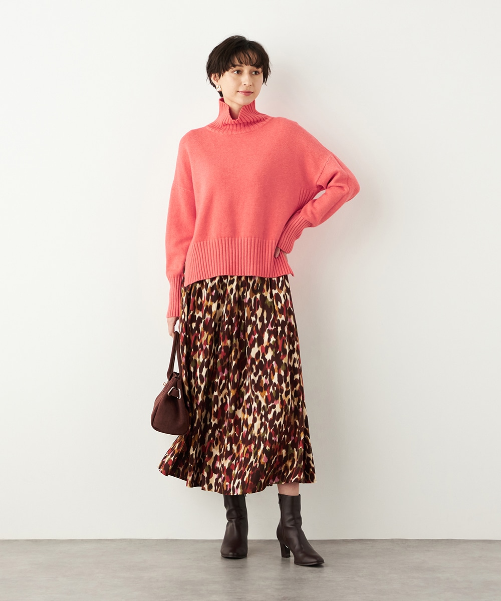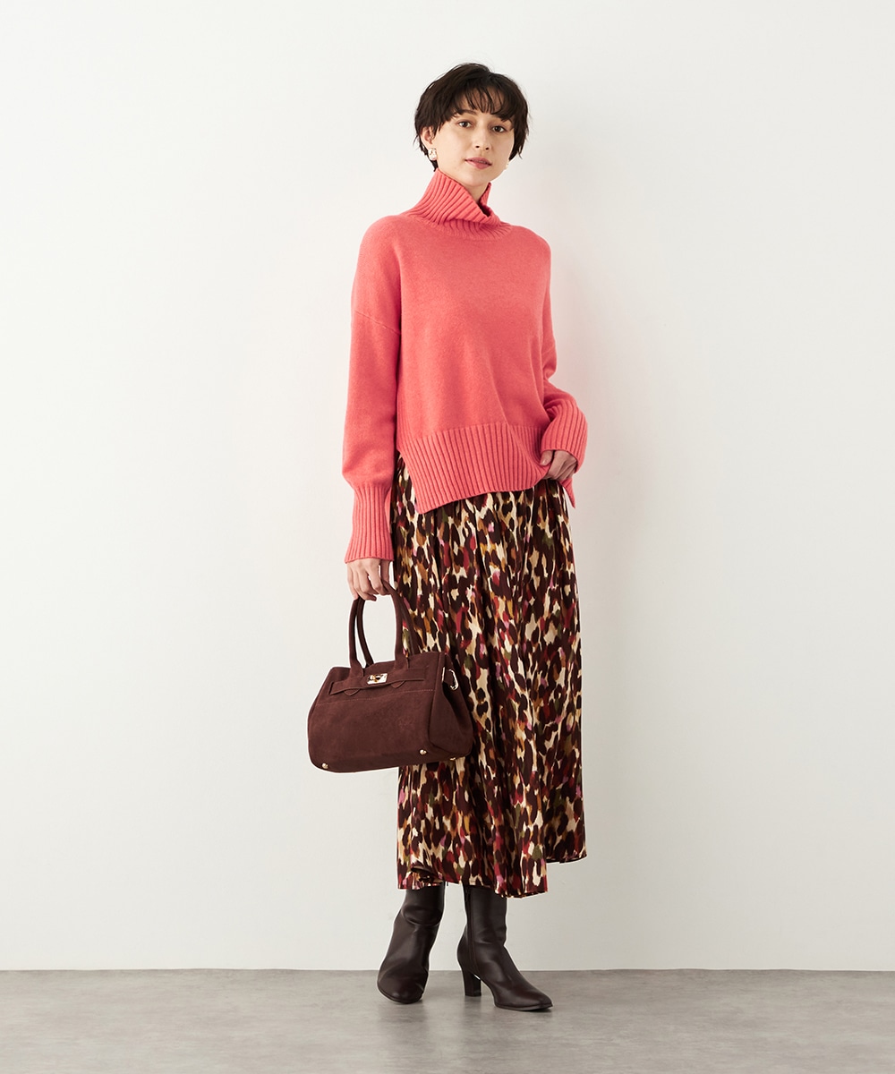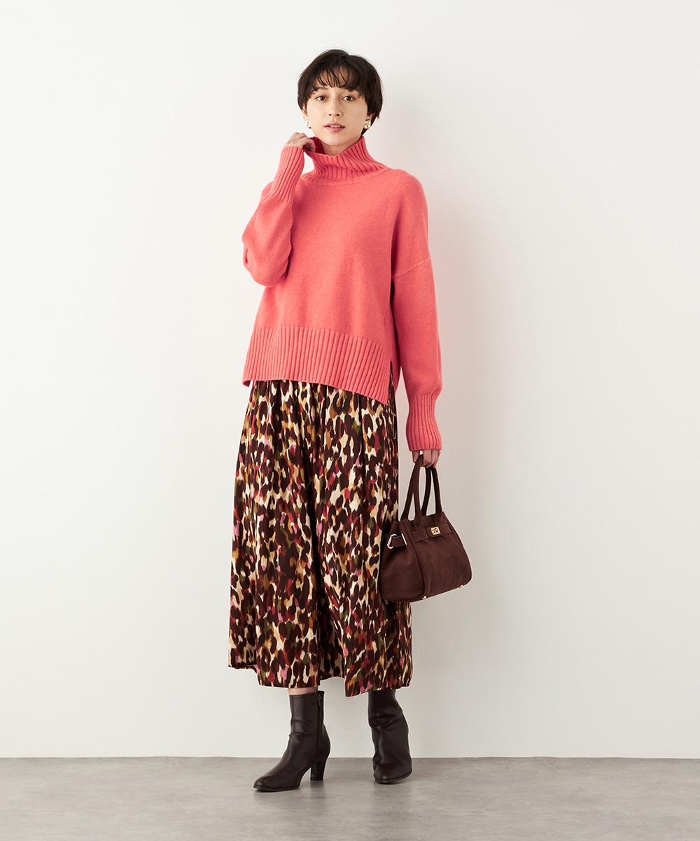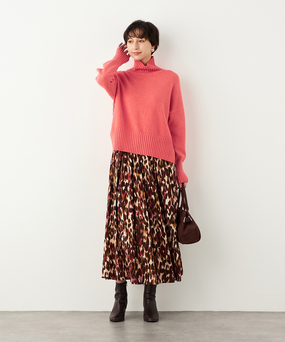 前後差のある着丈がモードな印象。秋冬コーディネートにおすすめのタートルニット。