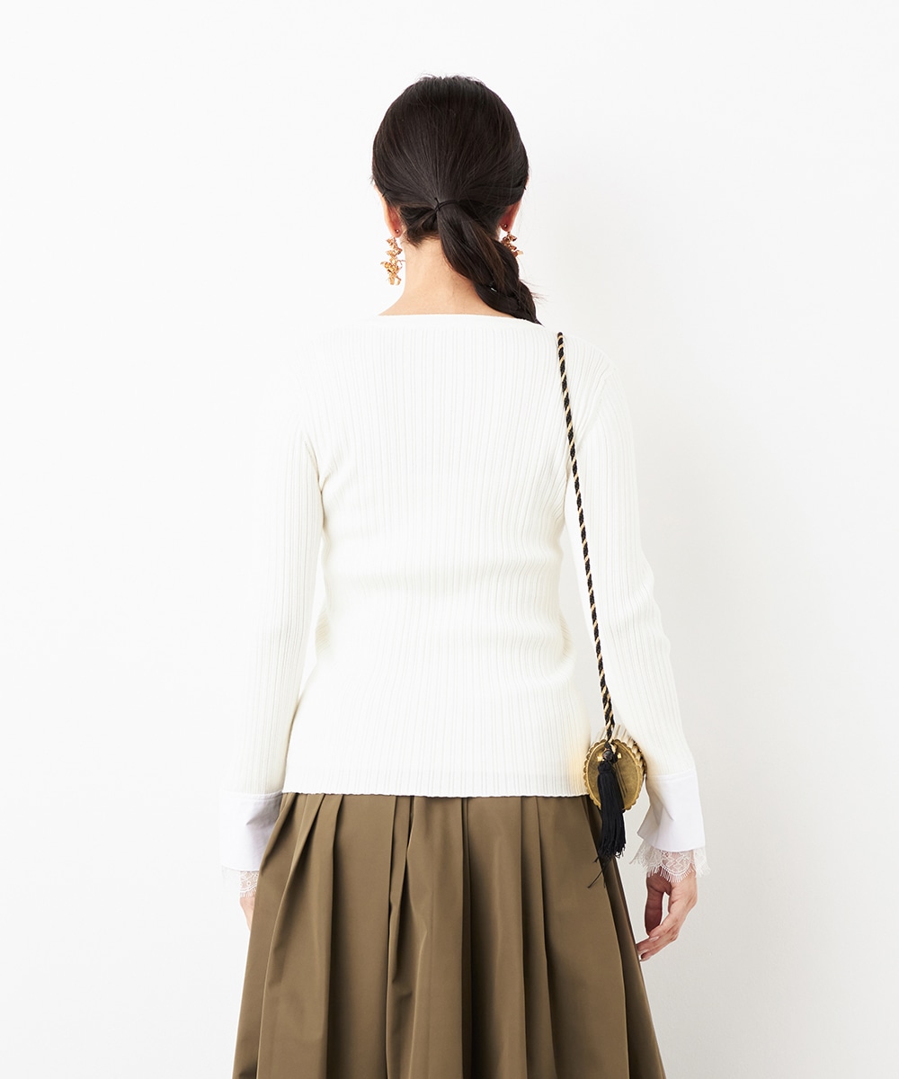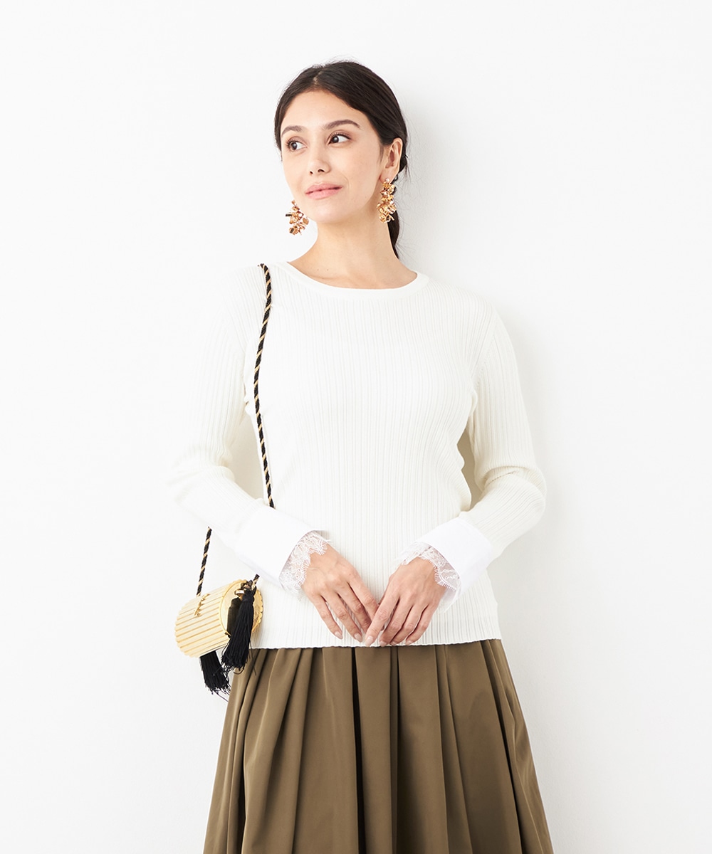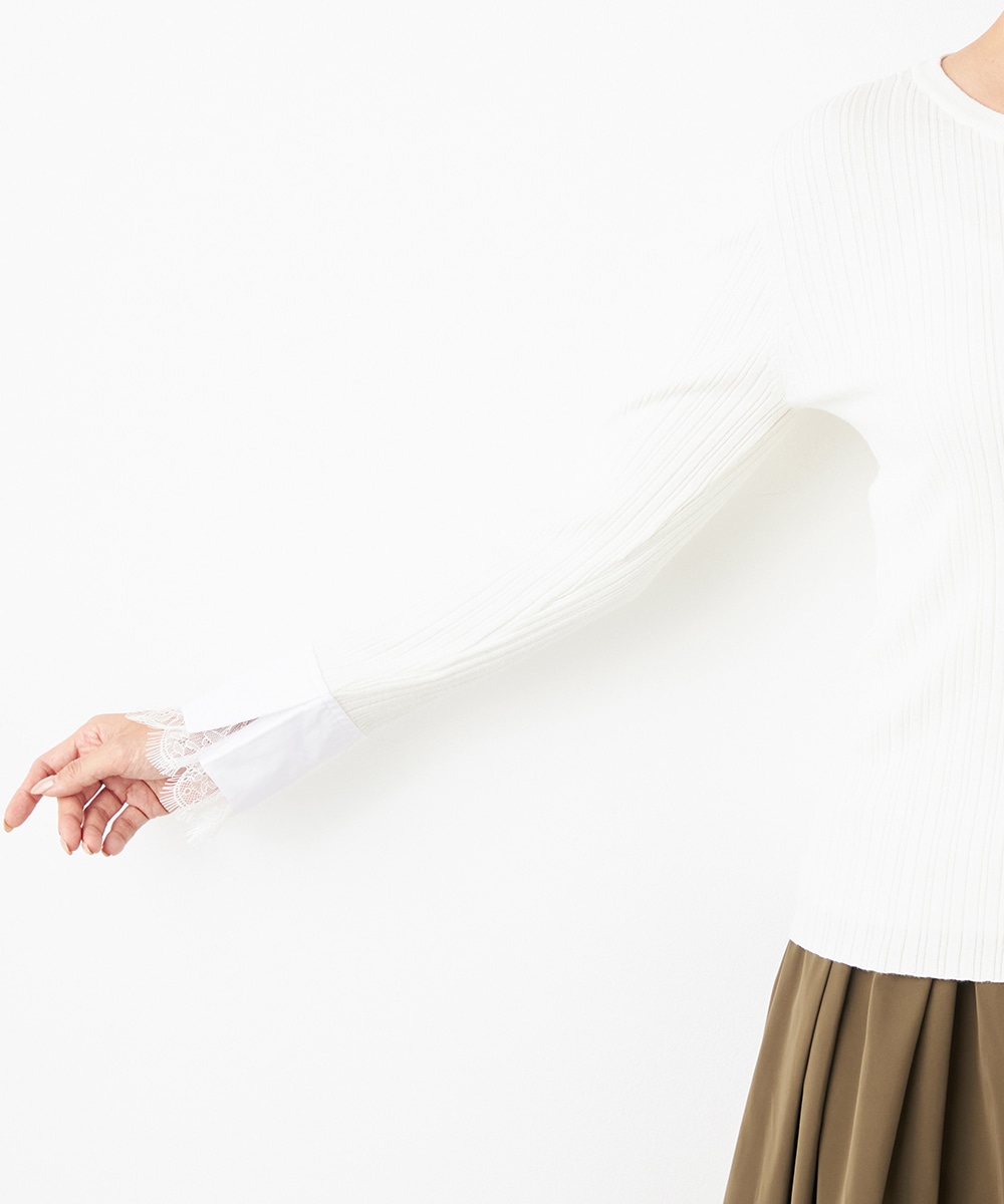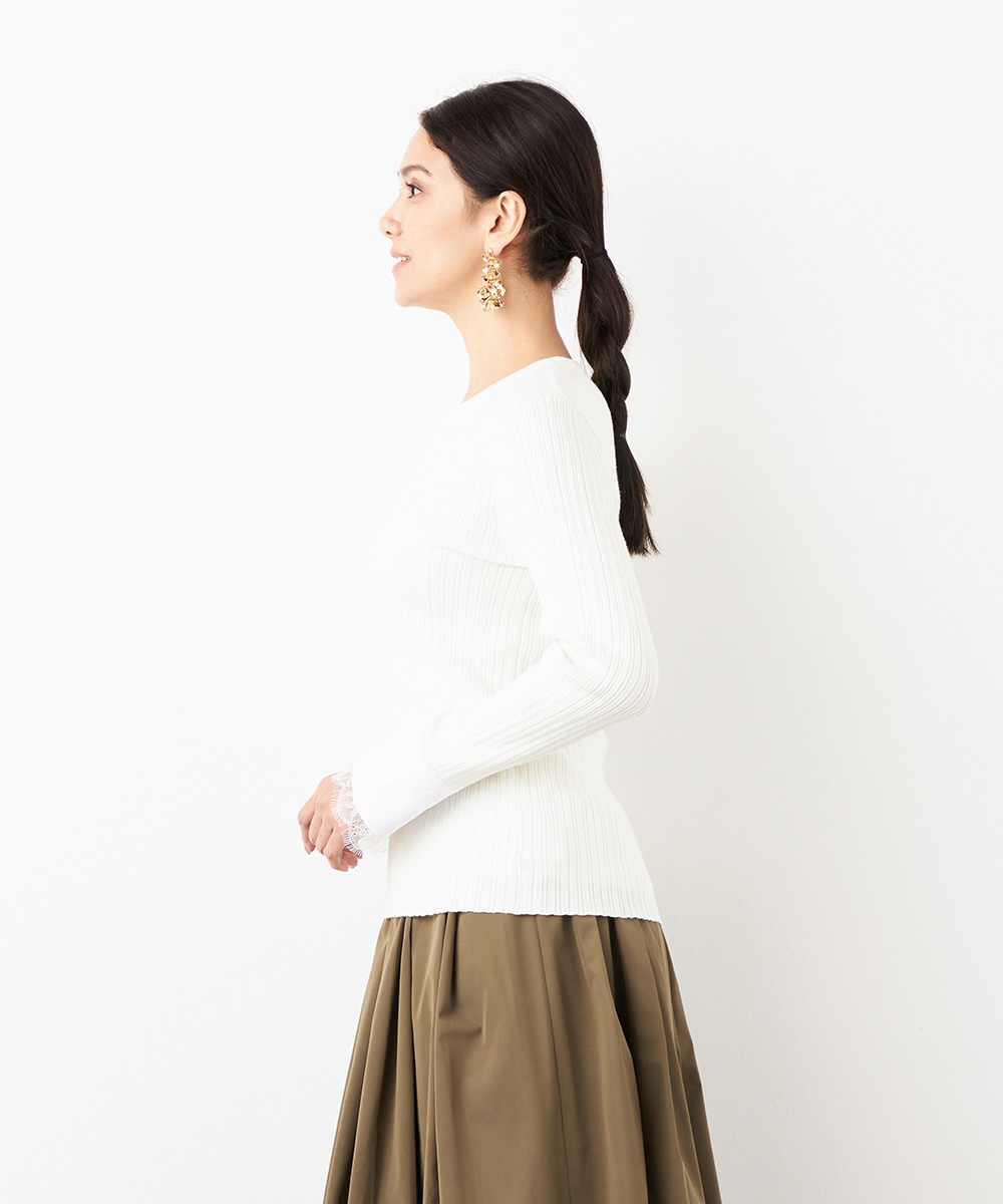 すっきりと着こなせるリブニット地にカフスデザインを取り入れて、シャツ風の袖口に仕上げています。内側には繊細なレースをあしらい、クラシカルな雰囲気をプラス。ほどよい存在感があり、一枚着としても活躍します。ボリュームのあるフレアスカートともバランス良く合わせられるアイテムです。