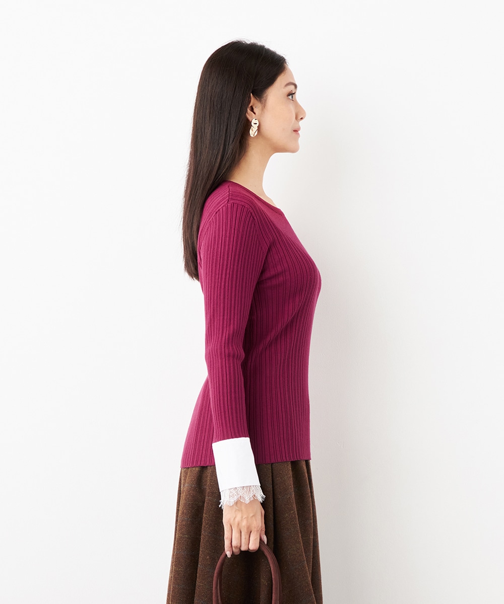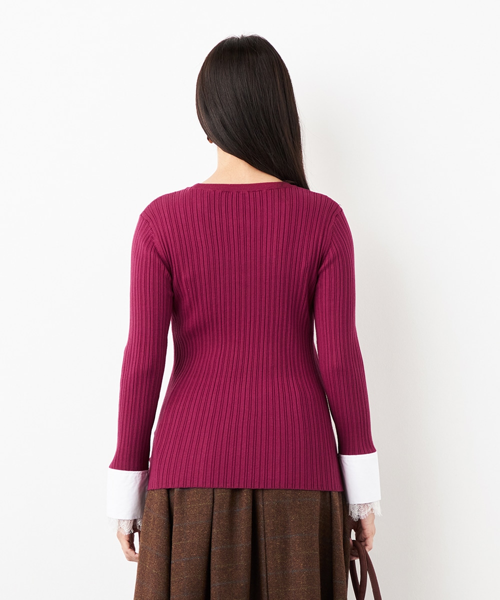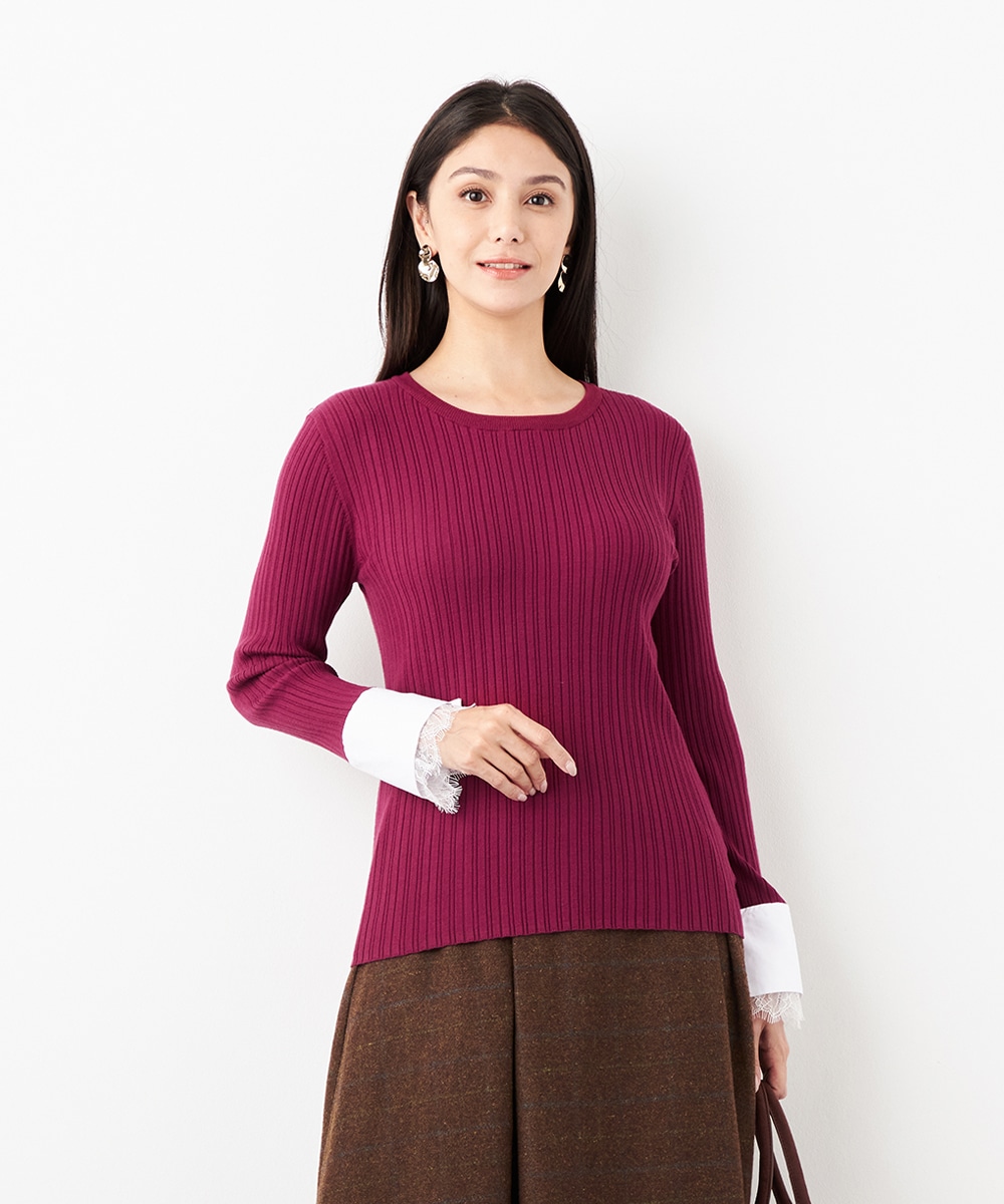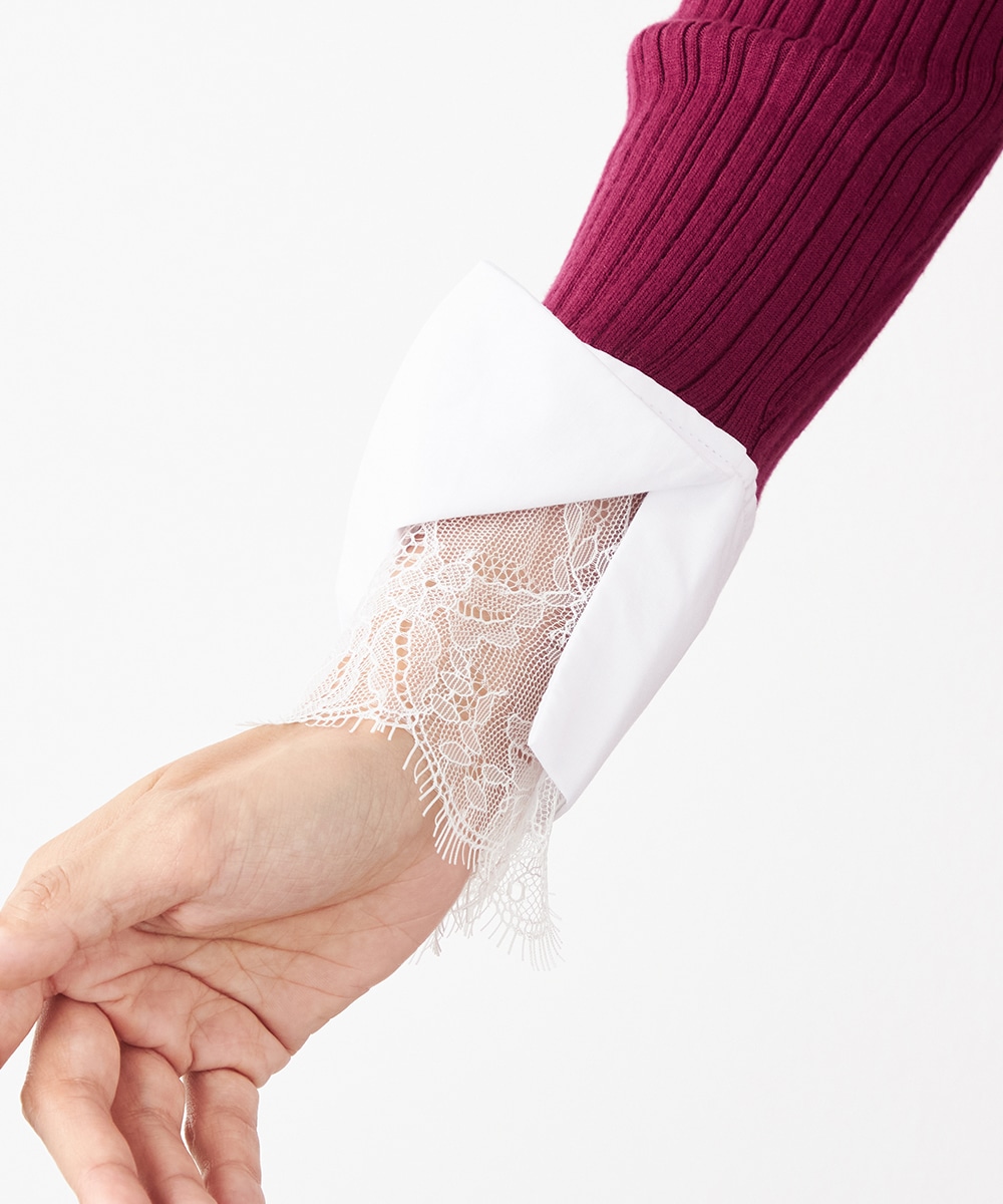 すっきりと着こなせるリブニット地にカフスデザインを取り入れて、シャツ風の袖口に仕上げています。内側には繊細なレースをあしらい、クラシカルな雰囲気をプラス。ほどよい存在感があり、一枚着としても活躍します。ボリュームのあるフレアスカートともバランス良く合わせられるアイテムです。
