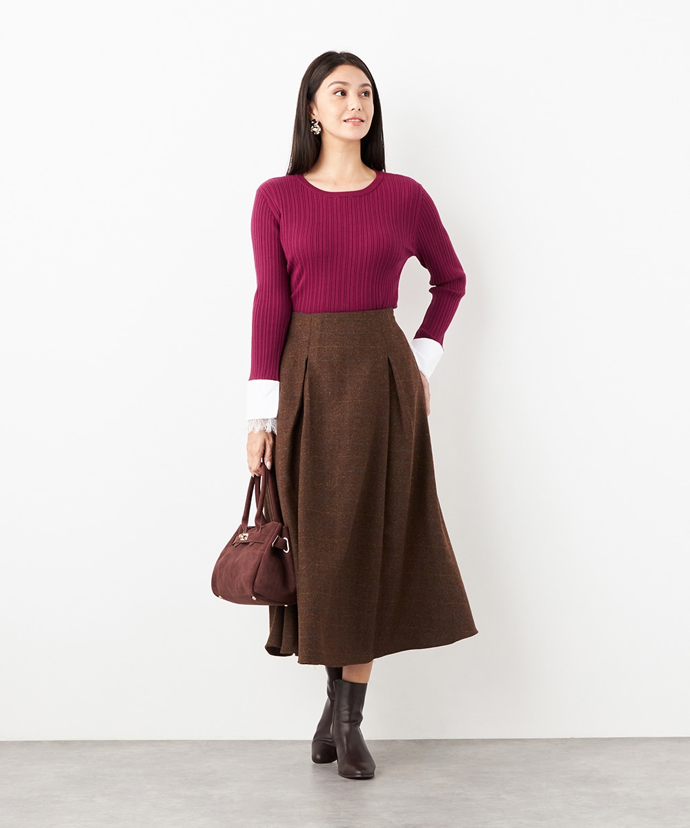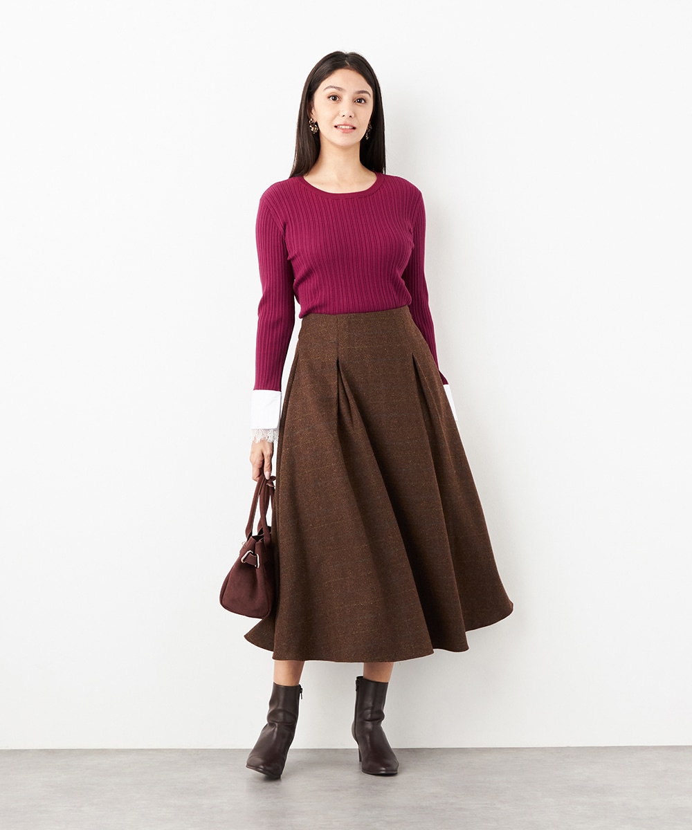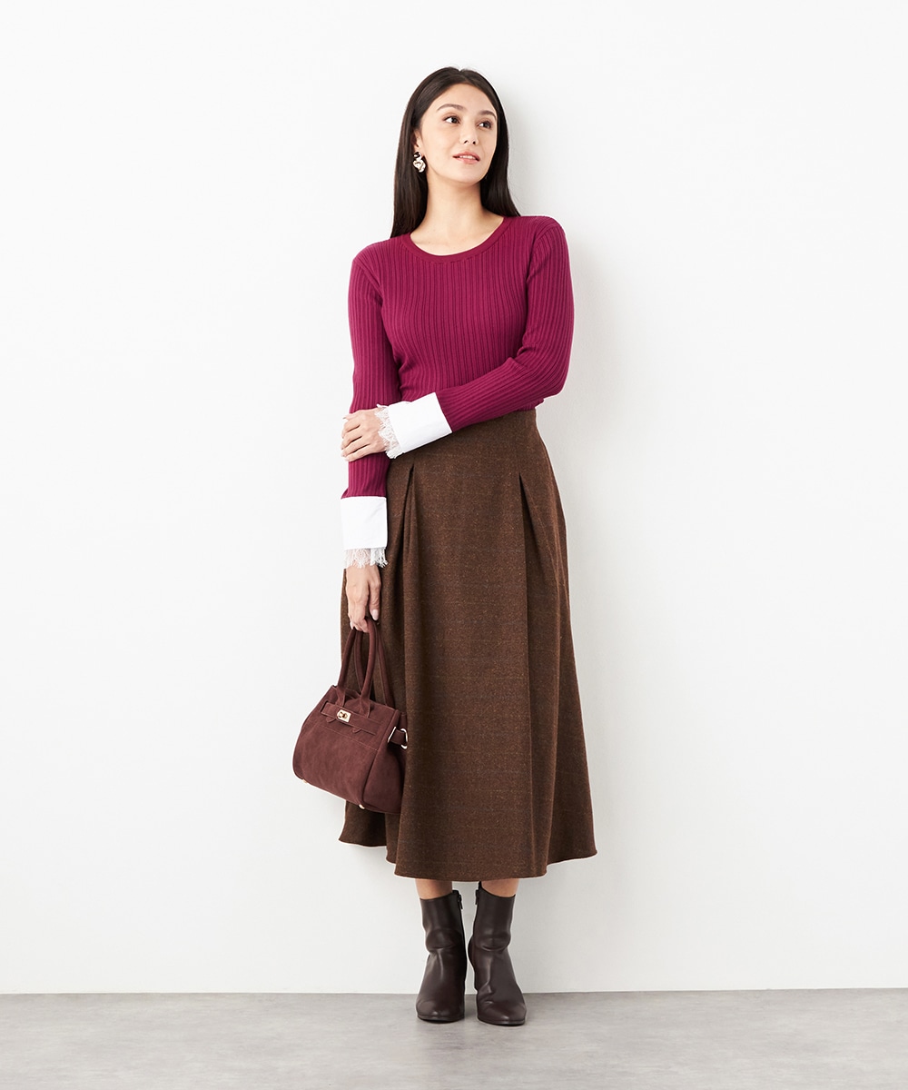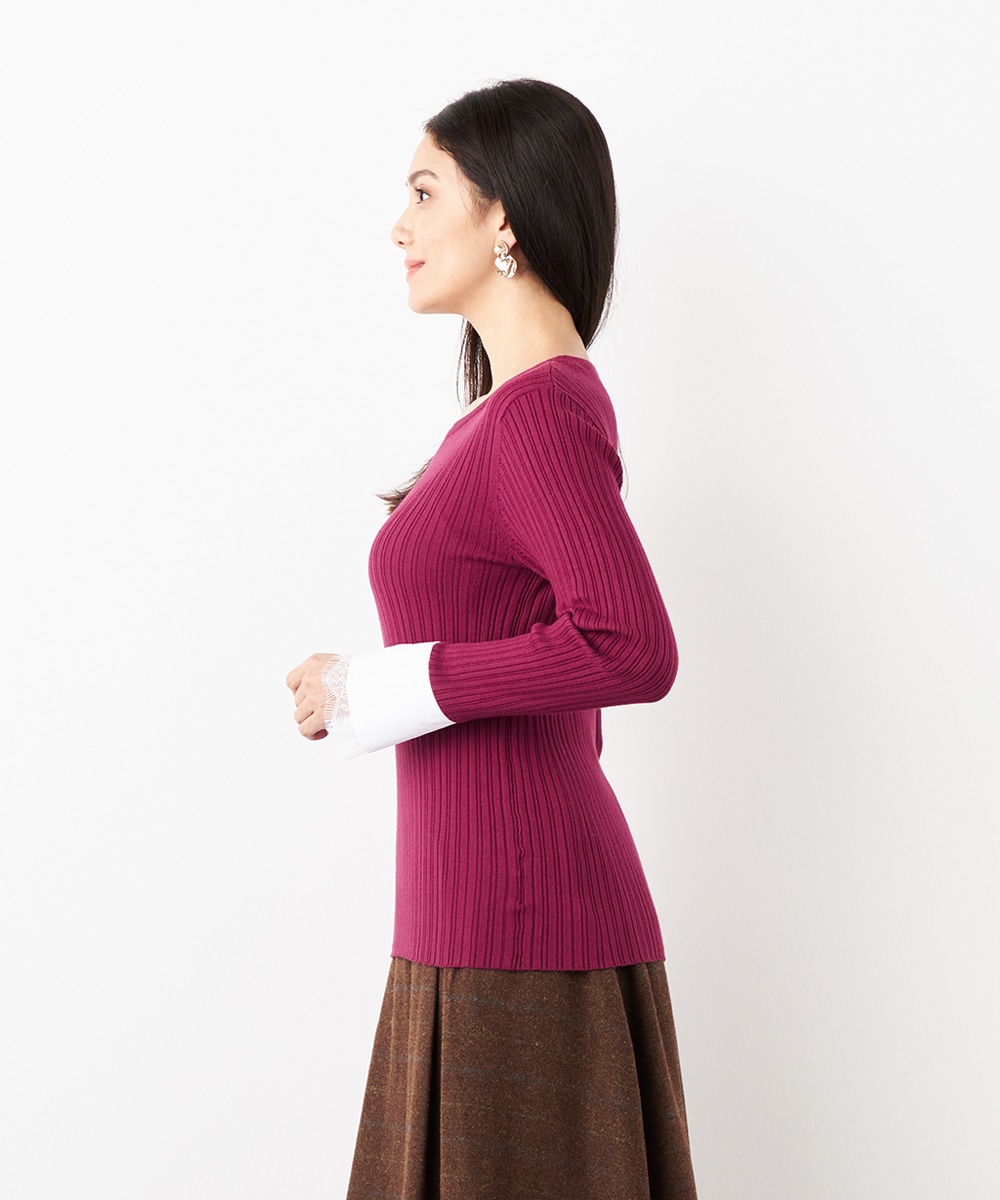 すっきりと着こなせるリブニット地にカフスデザインを取り入れて、シャツ風の袖口に仕上げています。内側には繊細なレースをあしらい、クラシカルな雰囲気をプラス。ほどよい存在感があり、一枚着としても活躍します。ボリュームのあるフレアスカートともバランス良く合わせられるアイテムです。