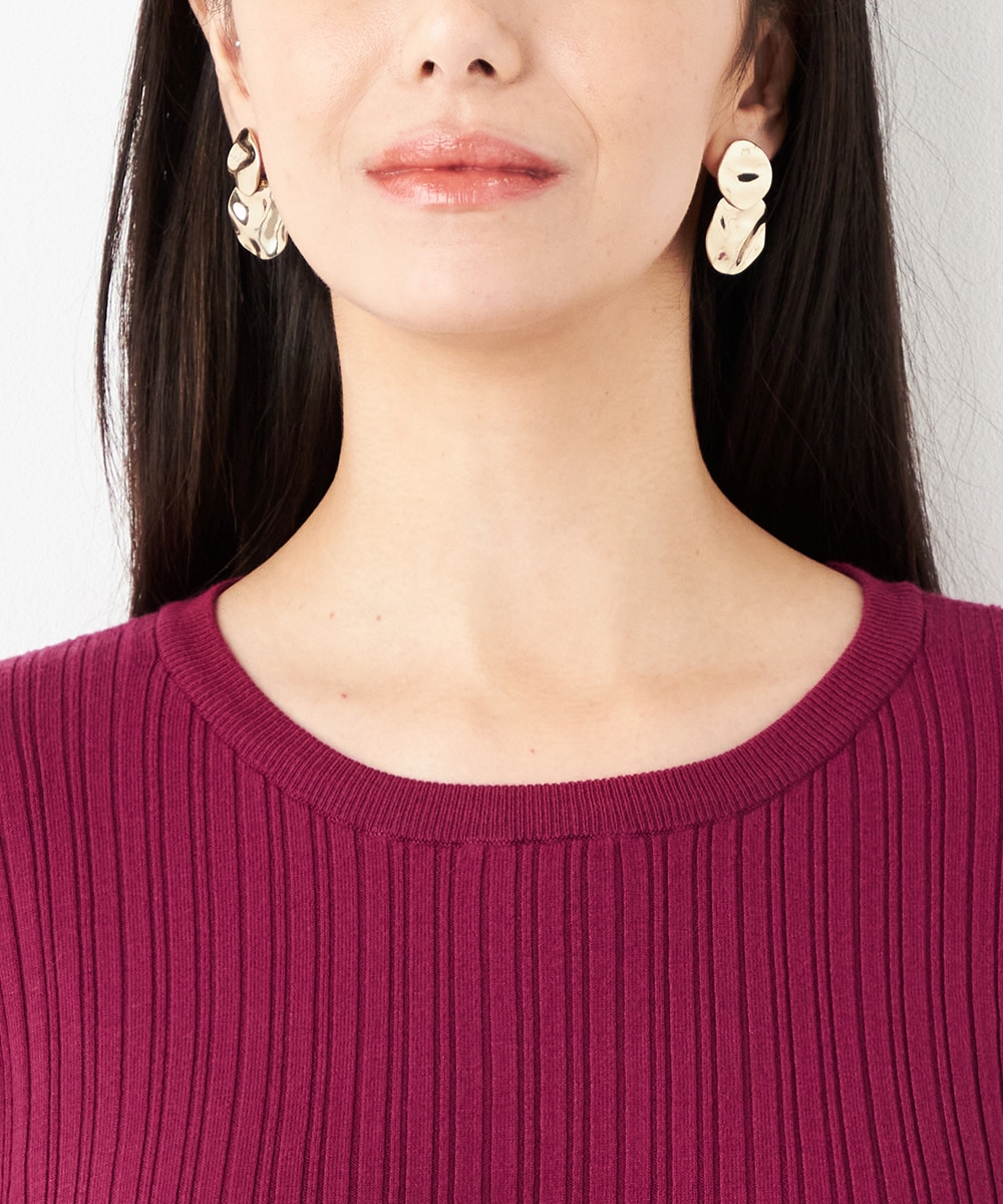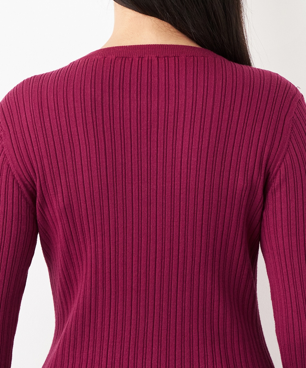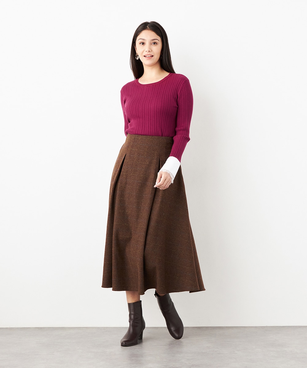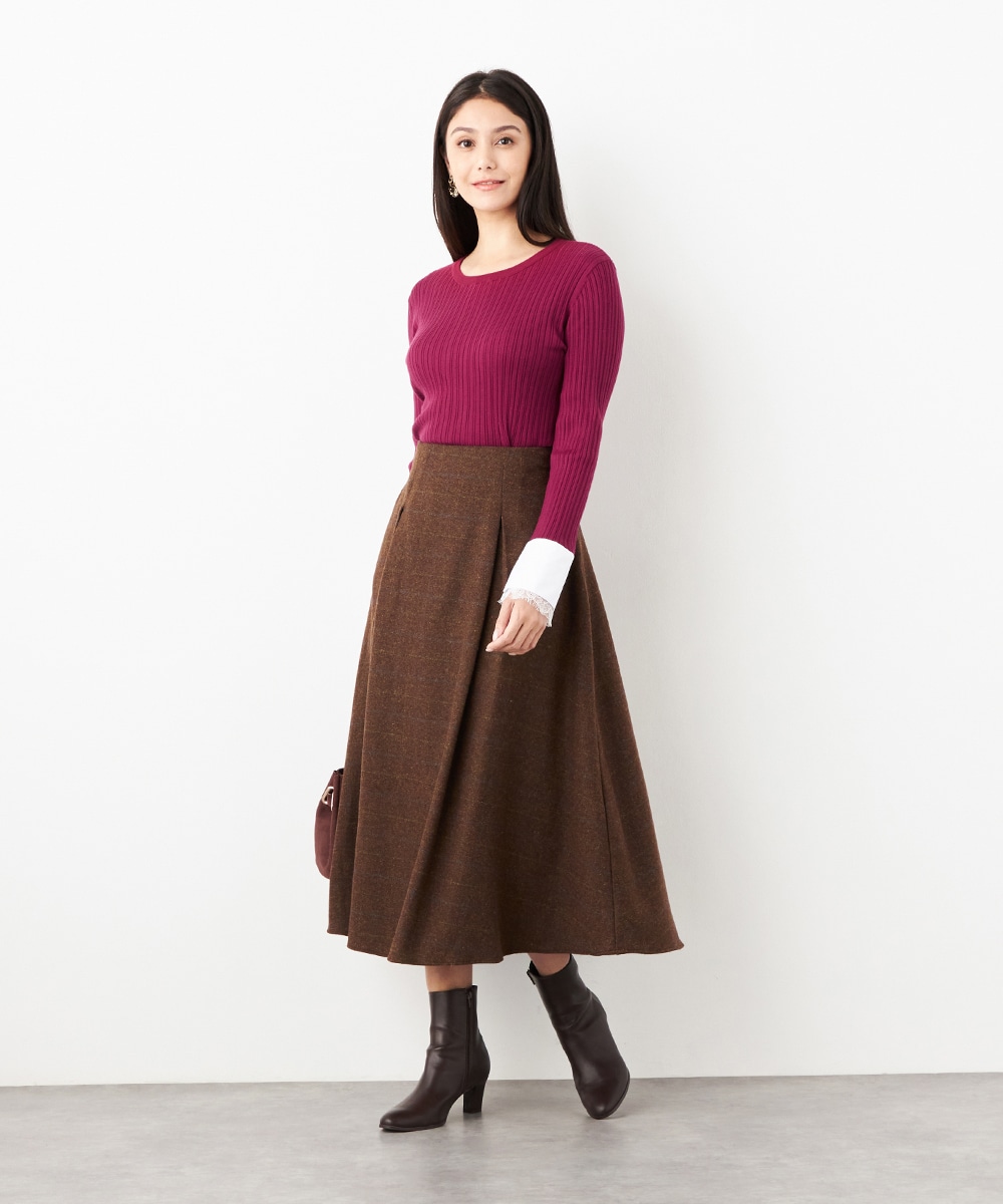 すっきりと着こなせるリブニット地にカフスデザインを取り入れて、シャツ風の袖口に仕上げています。内側には繊細なレースをあしらい、クラシカルな雰囲気をプラス。ほどよい存在感があり、一枚着としても活躍します。ボリュームのあるフレアスカートともバランス良く合わせられるアイテムです。