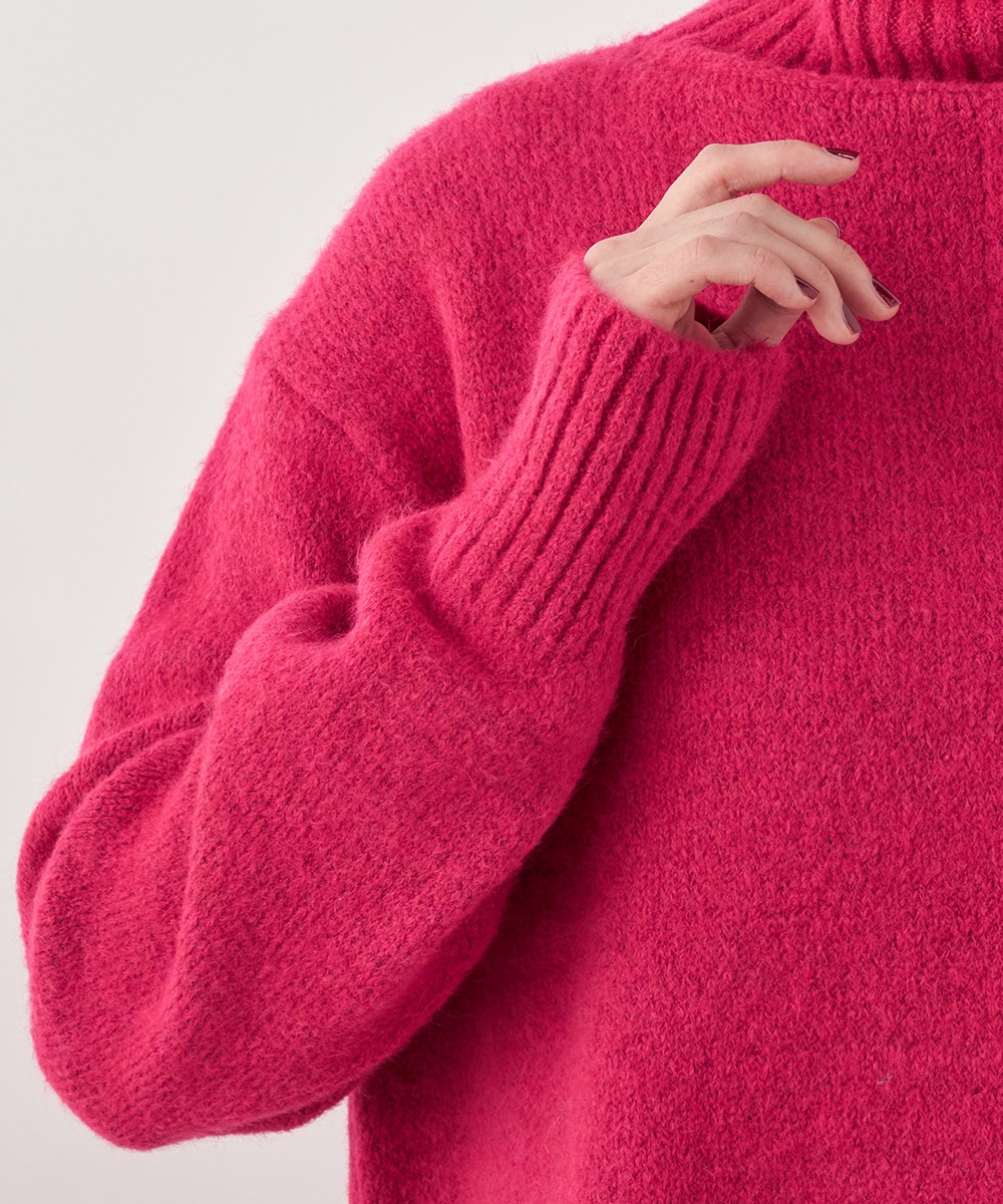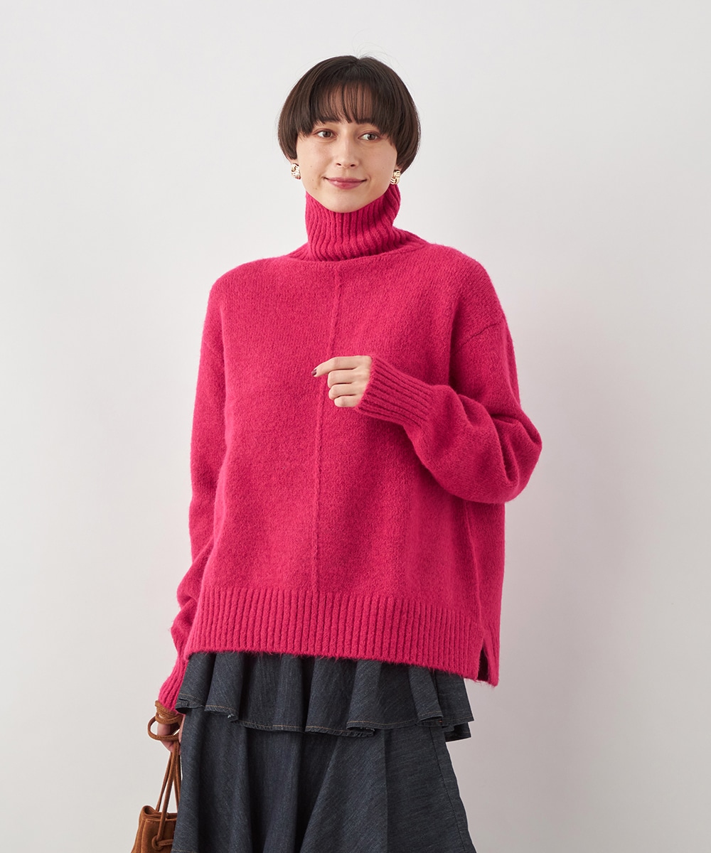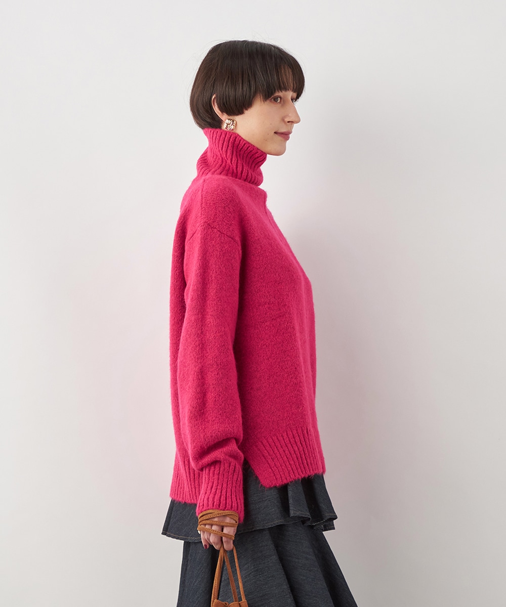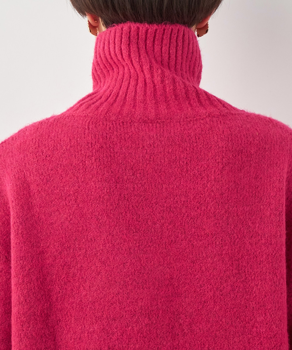ドロップショルダーのゆったりとしたシルエットがトレンドにマッチします。見た目も着心地も暖かなハイネックを採用。適度な毛羽感のある表情もぬくもりを印象付けます。ダークトーンにまとまりがちな秋冬コーディネートに、差し色感覚で取り入れるのもおすすめです。