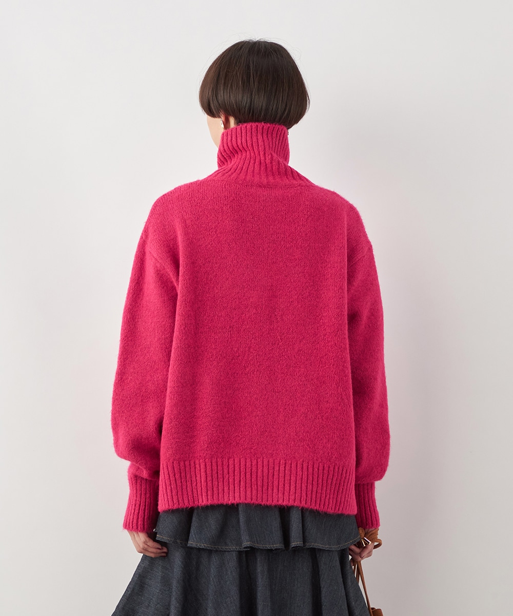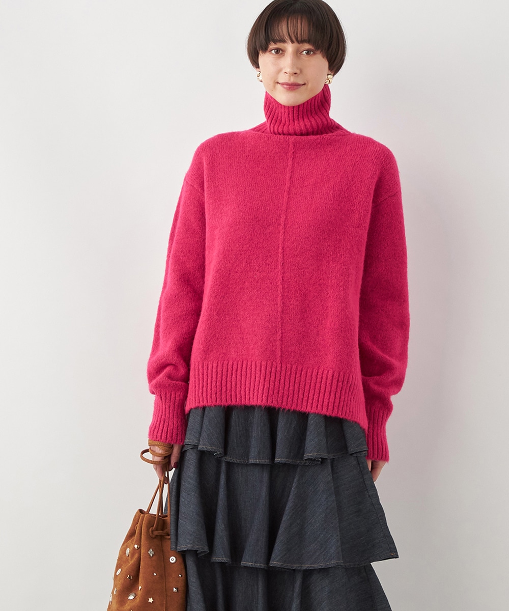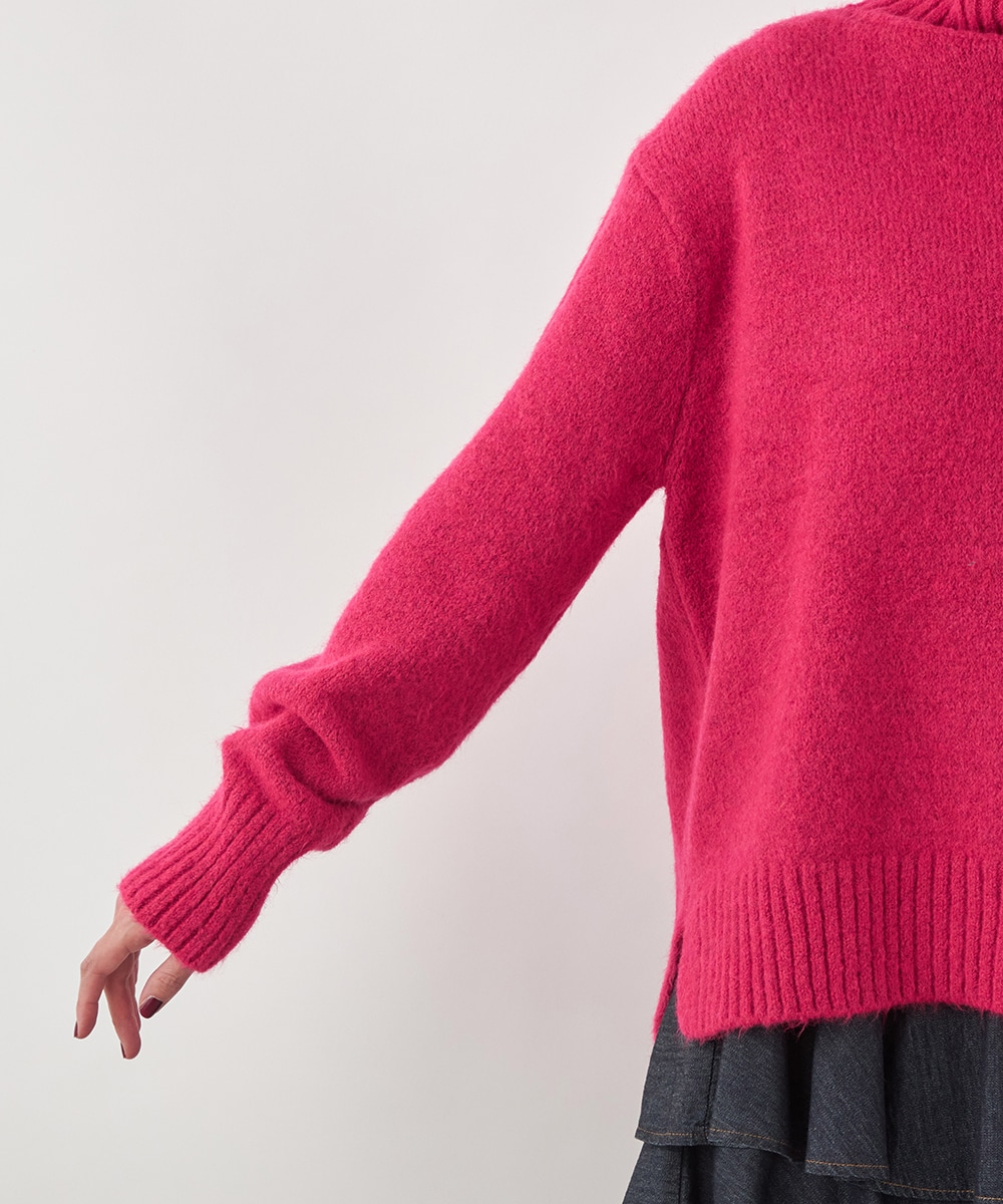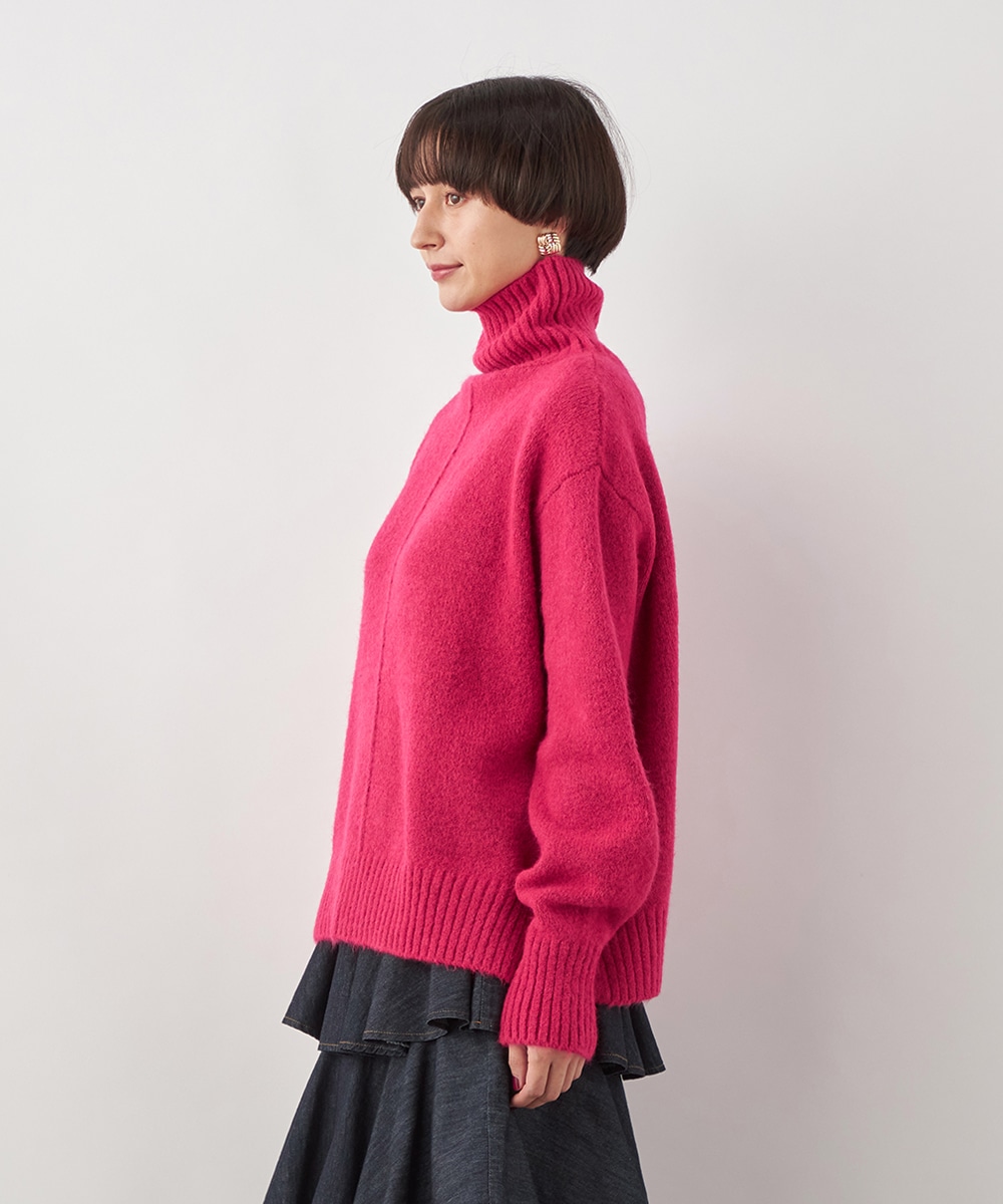 ドロップショルダーのゆったりとしたシルエットがトレンドにマッチします。見た目も着心地も暖かなハイネックを採用。適度な毛羽感のある表情もぬくもりを印象付けます。ダークトーンにまとまりがちな秋冬コーディネートに、差し色感覚で取り入れるのもおすすめです。