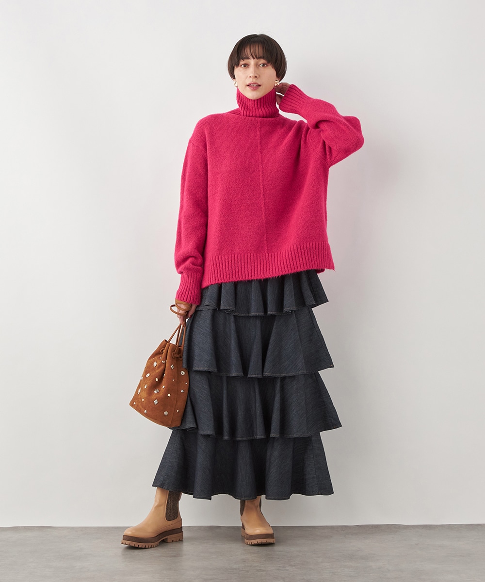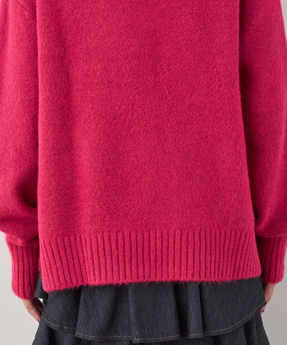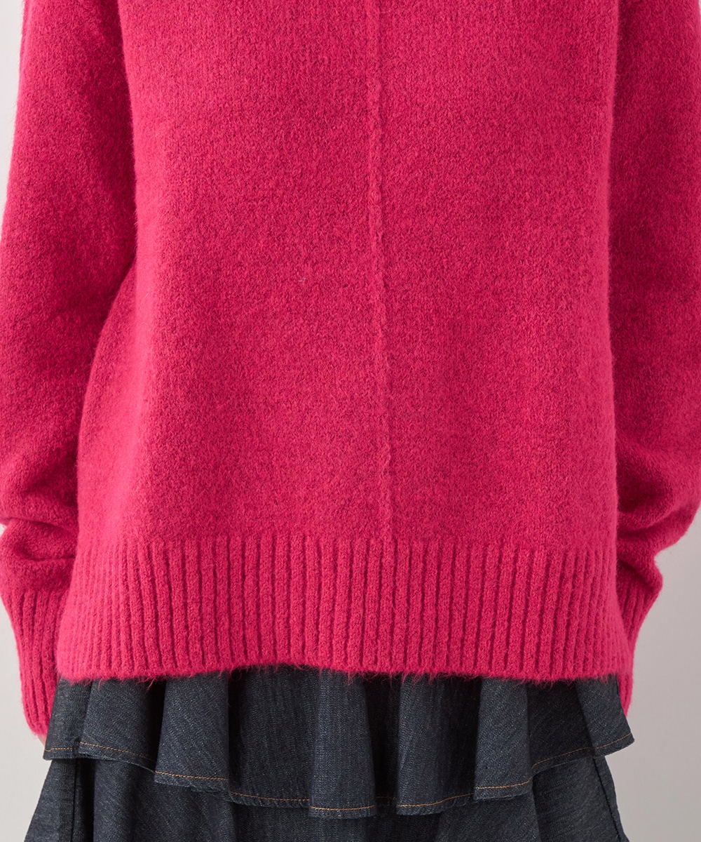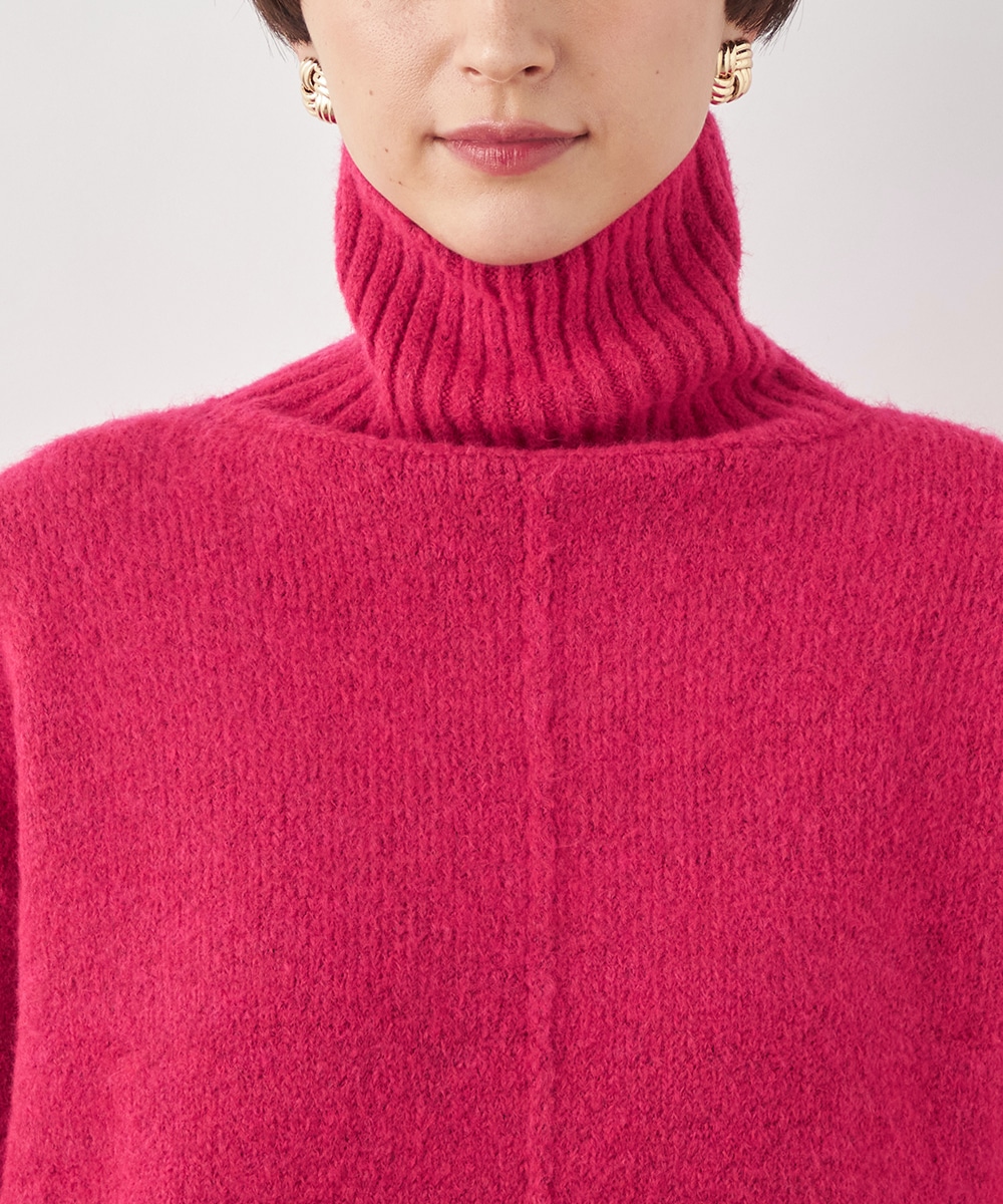 ドロップショルダーのゆったりとしたシルエットがトレンドにマッチします。見た目も着心地も暖かなハイネックを採用。適度な毛羽感のある表情もぬくもりを印象付けます。ダークトーンにまとまりがちな秋冬コーディネートに、差し色感覚で取り入れるのもおすすめです。