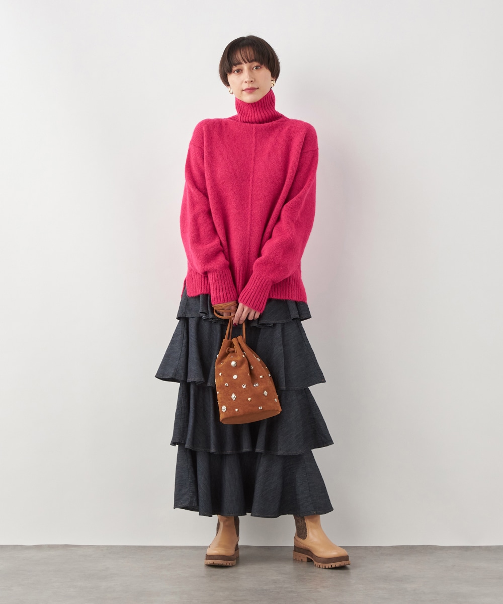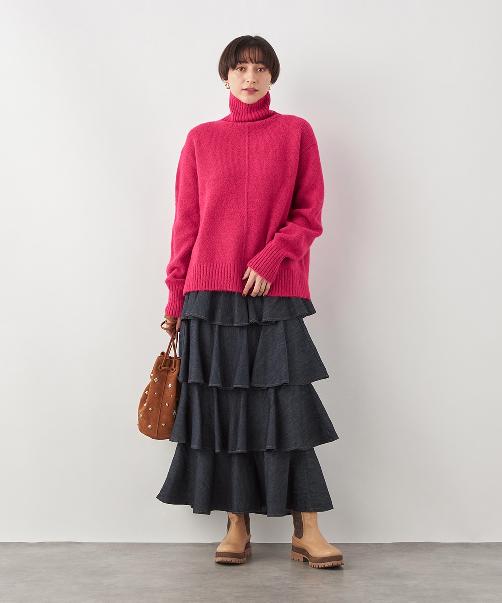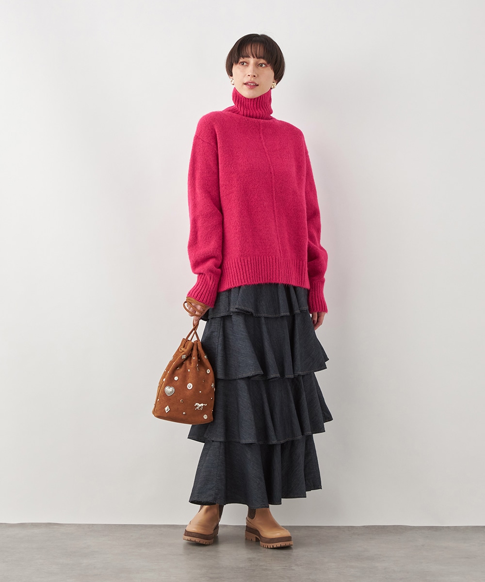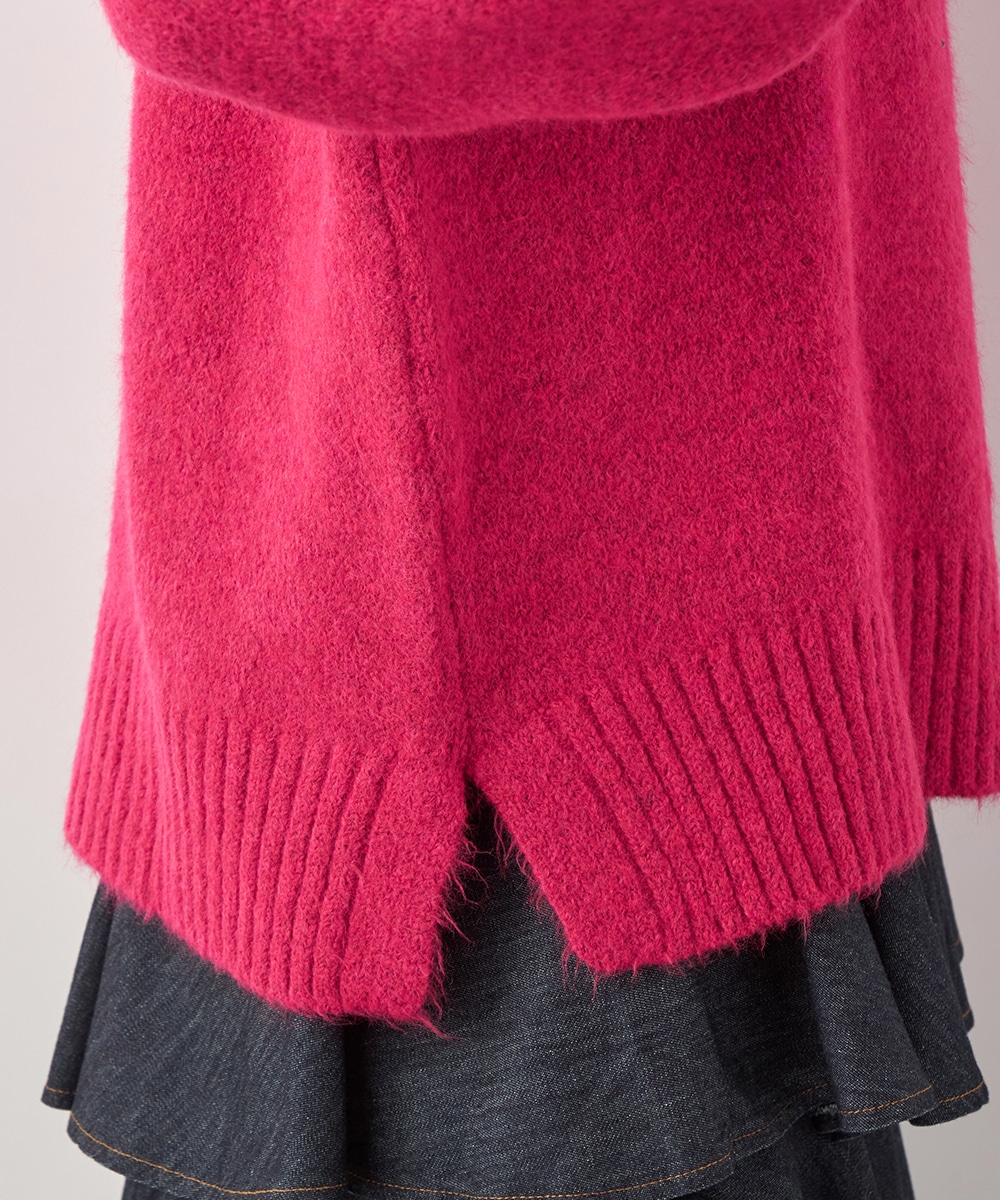 ドロップショルダーのゆったりとしたシルエットがトレンドにマッチします。見た目も着心地も暖かなハイネックを採用。適度な毛羽感のある表情もぬくもりを印象付けます。ダークトーンにまとまりがちな秋冬コーディネートに、差し色感覚で取り入れるのもおすすめです。