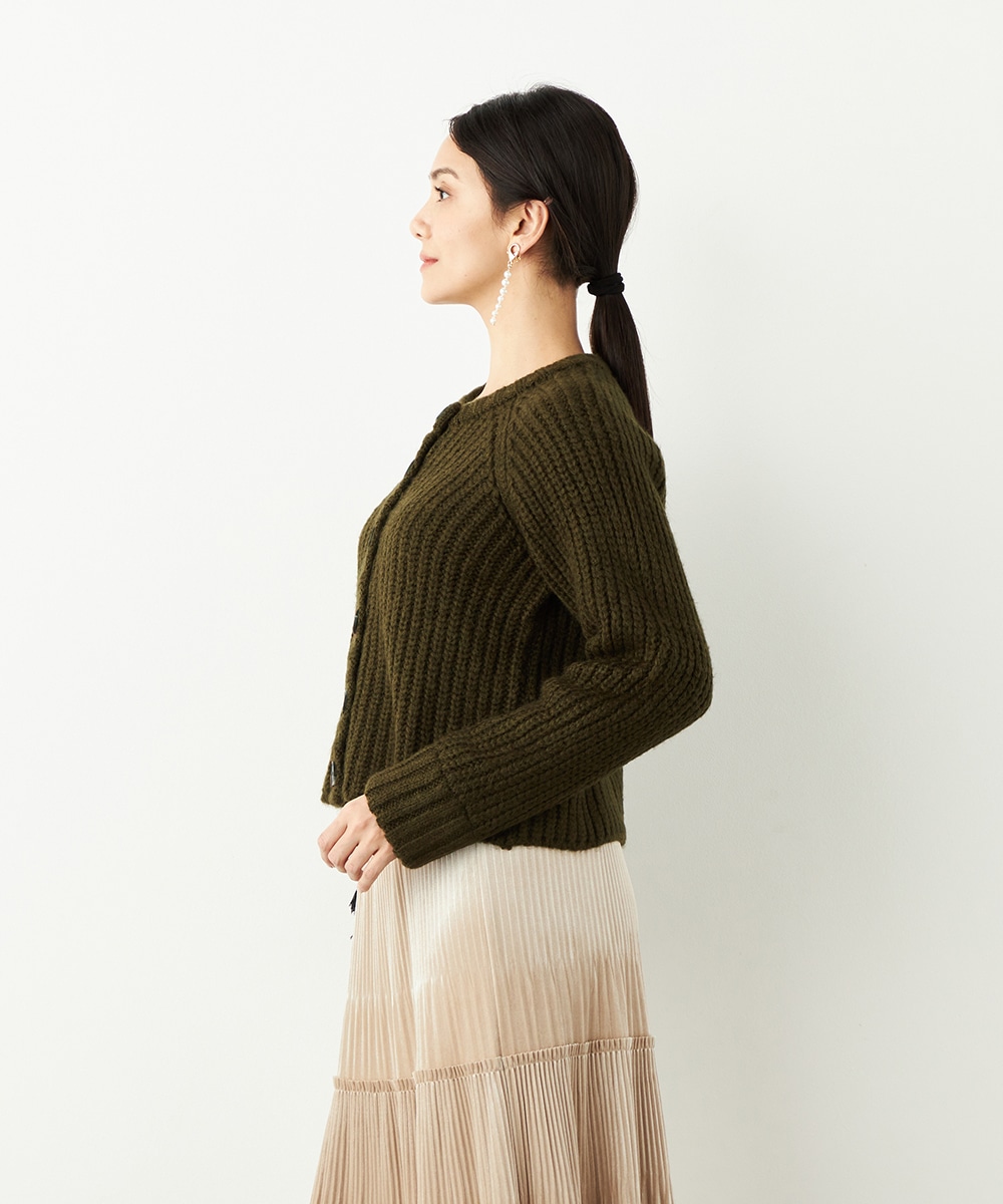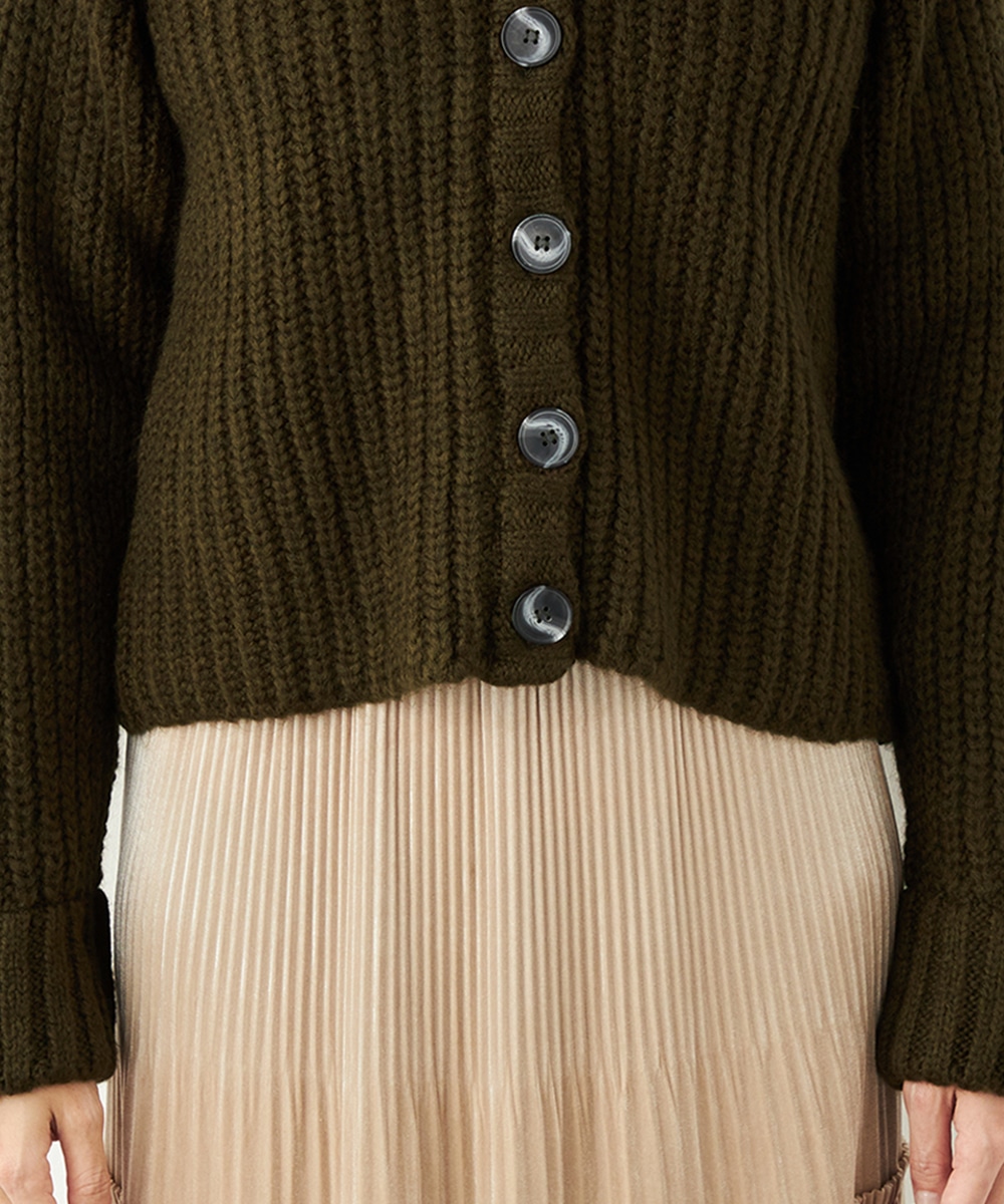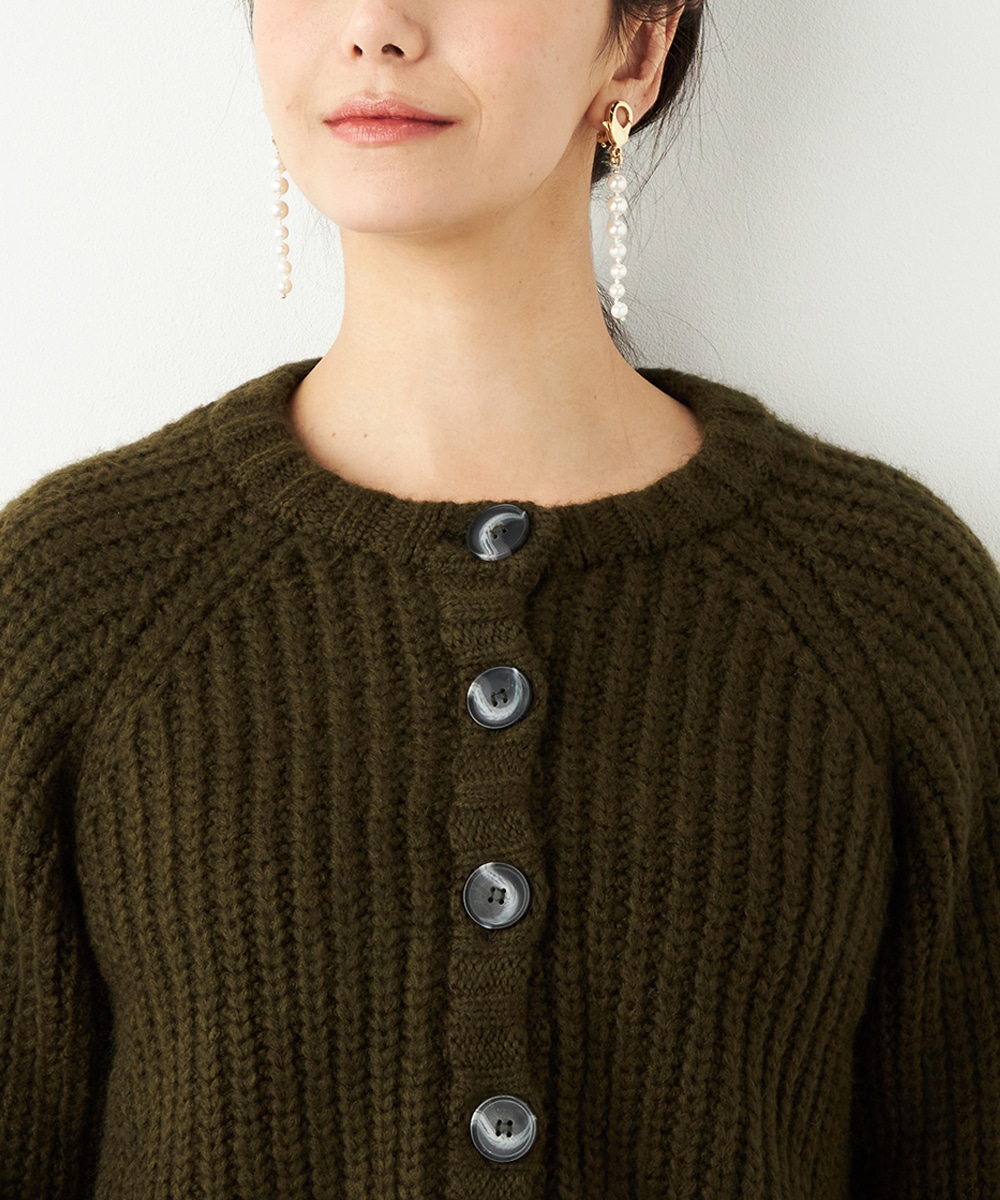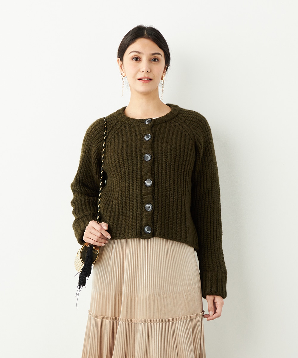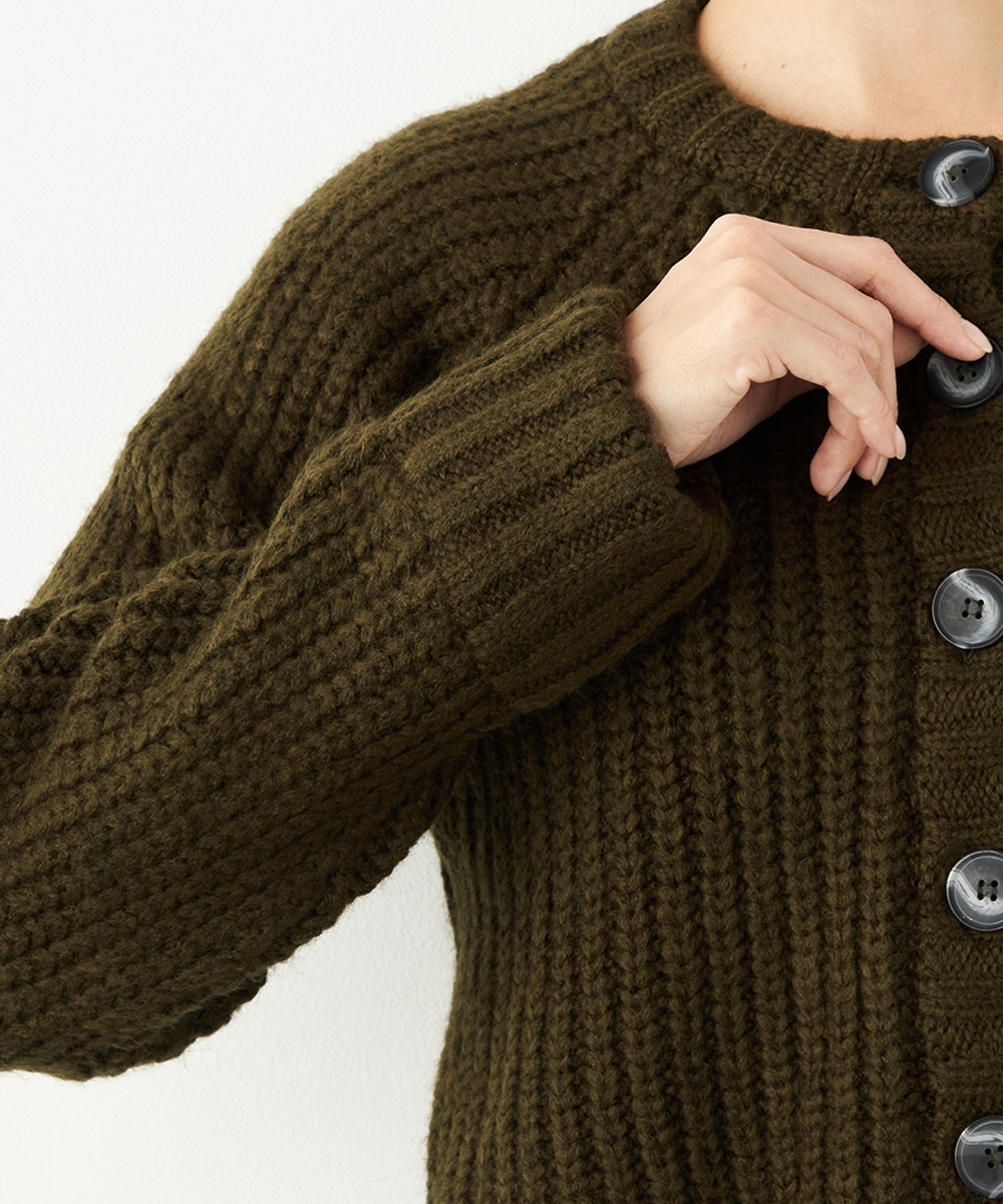 適度なゆとりのあるシルエットと短めの着丈のバランスが今年らしい印象です。大きめのボタンがアクセントとしても効いています。羽織にするのはもちろん、フロントを留めてプルオーバー風の一枚着として活用するのも素敵なアレンジ。さまざまなコーディネートに活用できます。