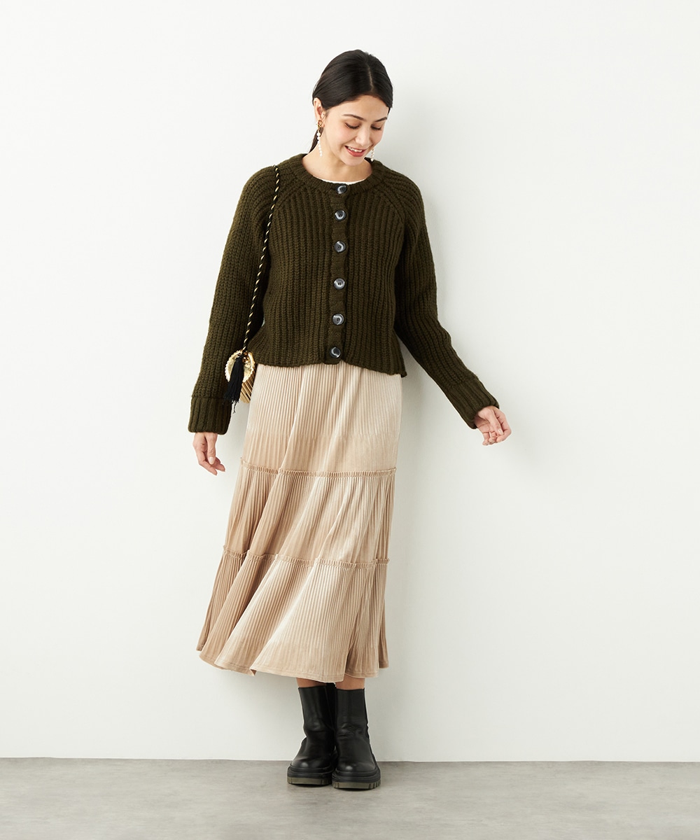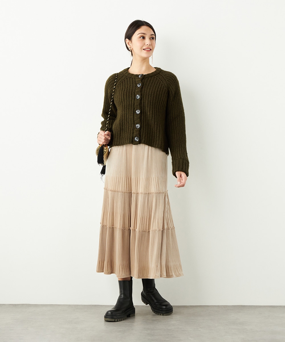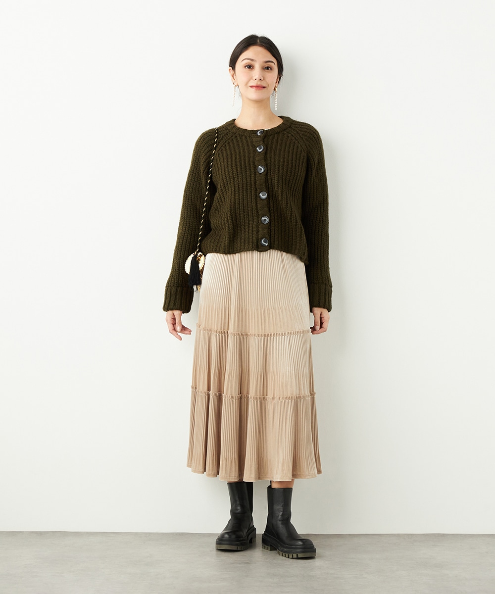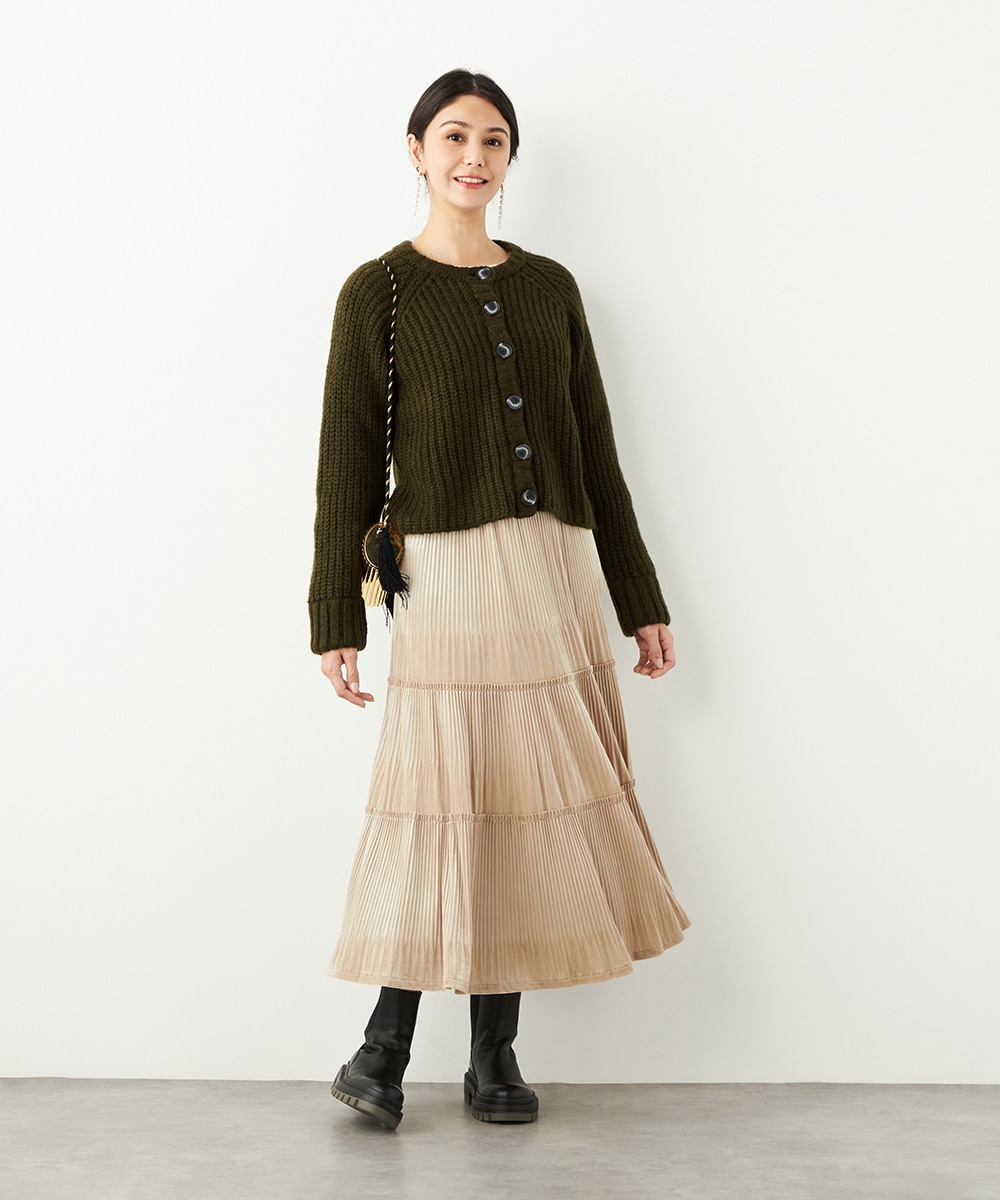 適度なゆとりのあるシルエットと短めの着丈のバランスが今年らしい印象です。大きめのボタンがアクセントとしても効いています。羽織にするのはもちろん、フロントを留めてプルオーバー風の一枚着として活用するのも素敵なアレンジ。さまざまなコーディネートに活用できます。