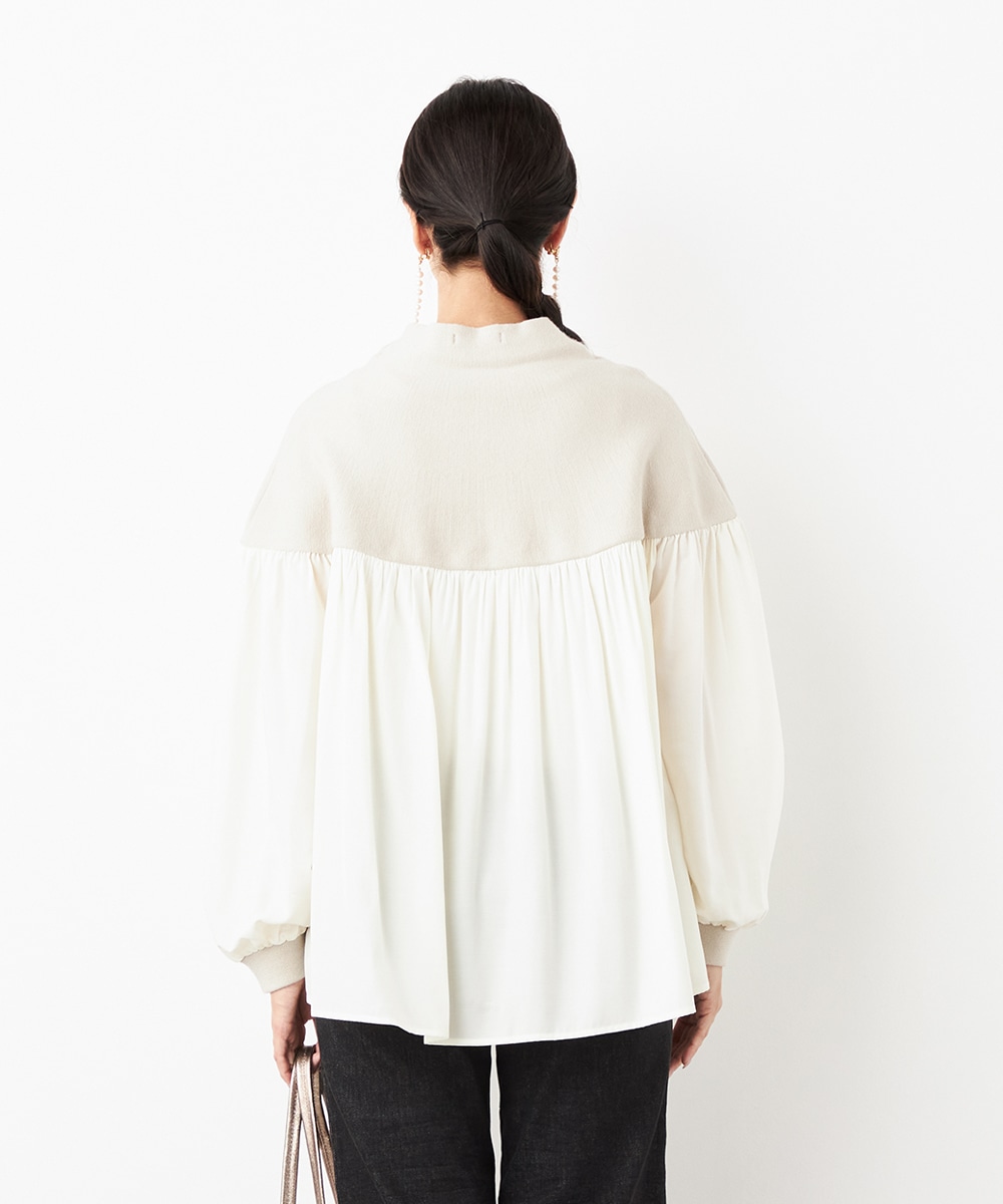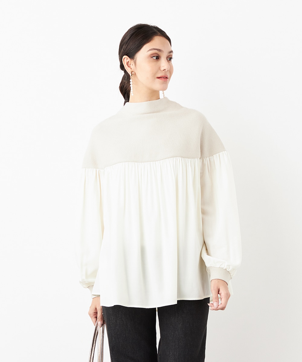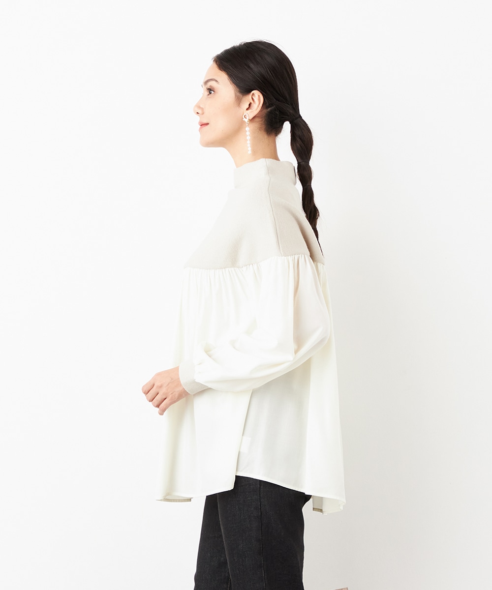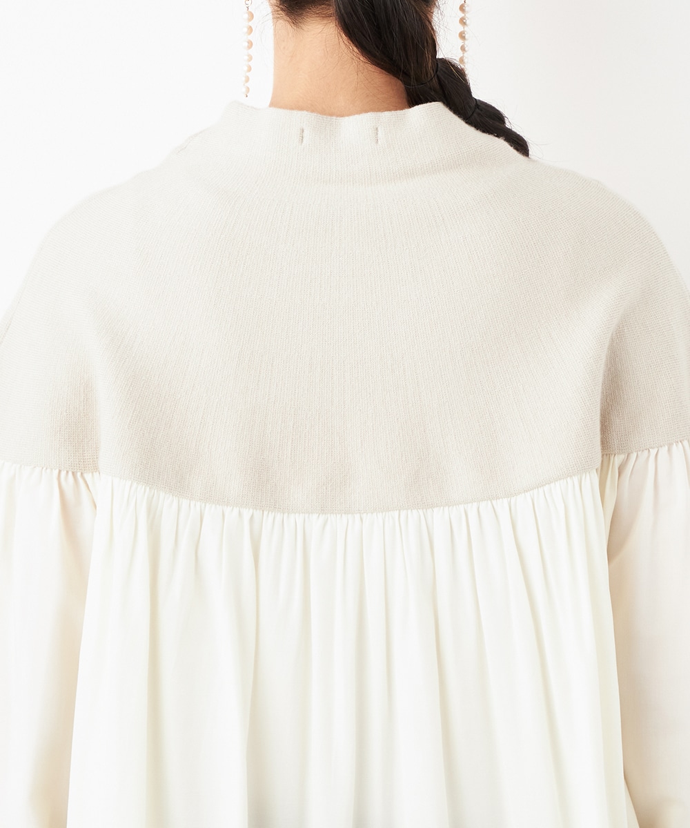 ニット部分は適度な厚みで目面もきれいに仕上がり、上品な表情です。布帛にはたっぷりのギャザーを施して、フェミニンな印象を演出しています。大人っぽく落ち着いたコーディネートを楽しめるハイネックを採用。切り替えを肩下にデザインしたことで、シルエットに今年らしいゆる感があります。
