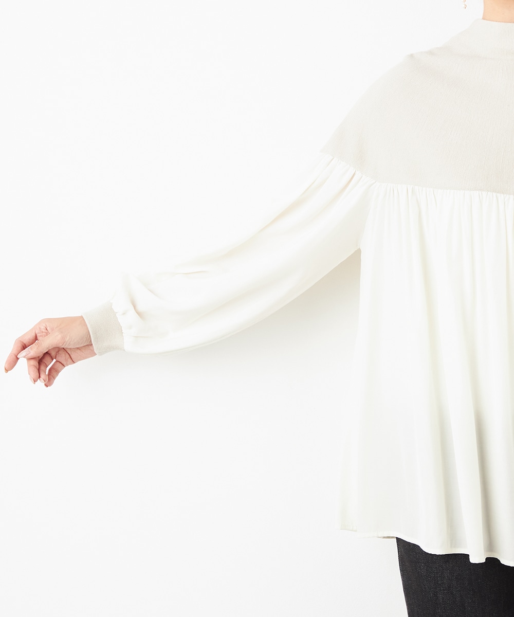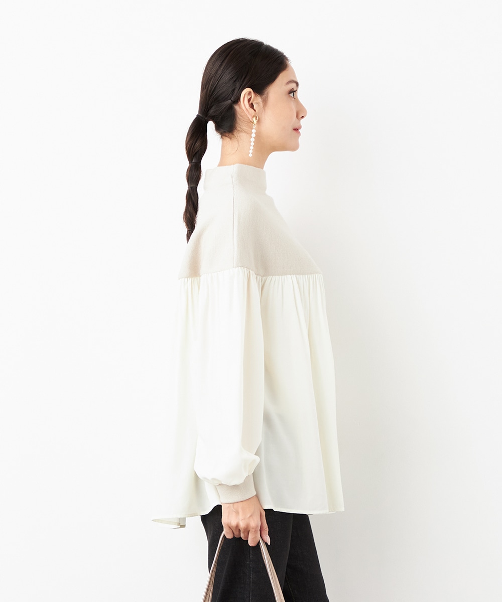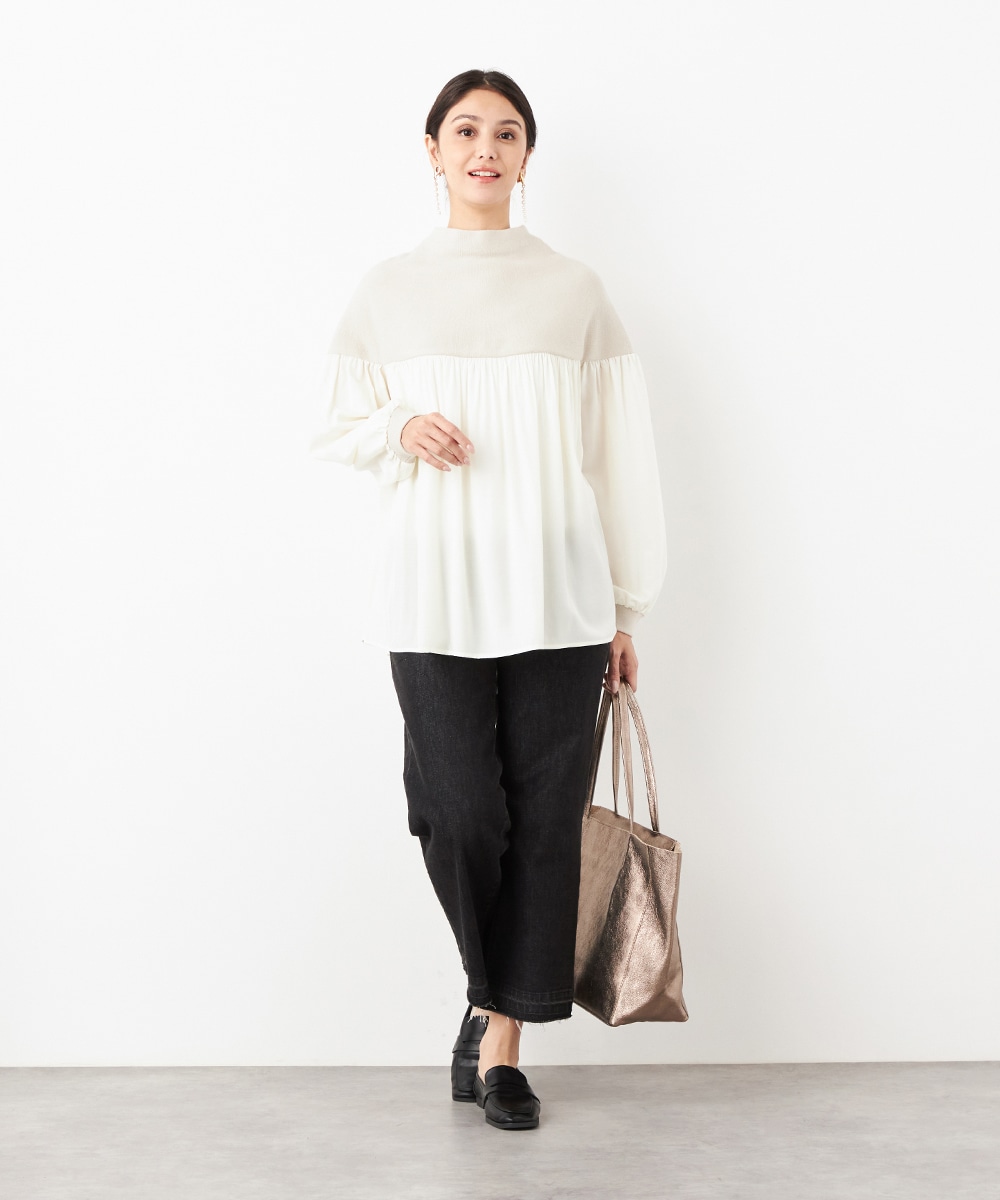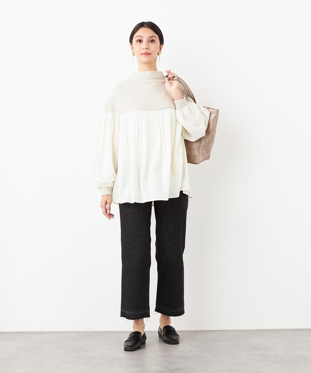 ニット部分は適度な厚みで目面もきれいに仕上がり、上品な表情です。布帛にはたっぷりのギャザーを施して、フェミニンな印象を演出しています。大人っぽく落ち着いたコーディネートを楽しめるハイネックを採用。切り替えを肩下にデザインしたことで、シルエットに今年らしいゆる感があります。