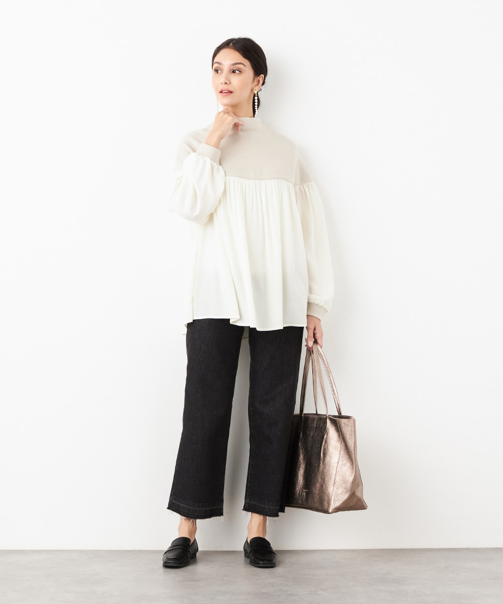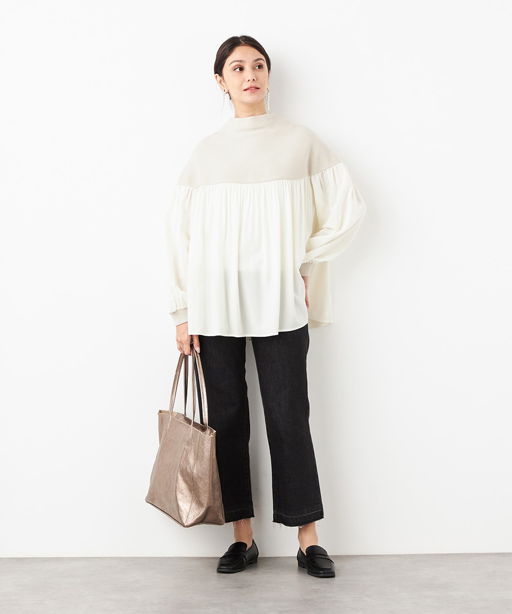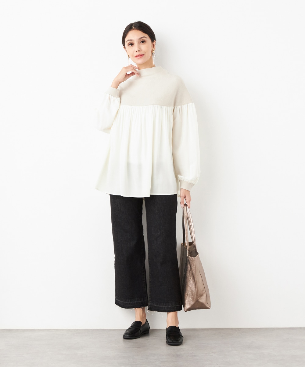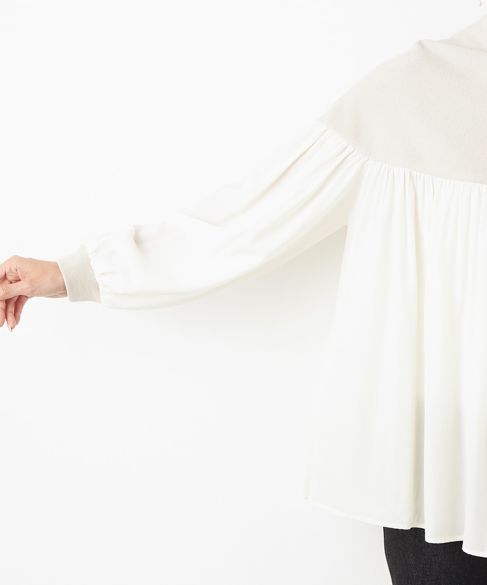 ニット部分は適度な厚みで目面もきれいに仕上がり、上品な表情です。布帛にはたっぷりのギャザーを施して、フェミニンな印象を演出しています。大人っぽく落ち着いたコーディネートを楽しめるハイネックを採用。切り替えを肩下にデザインしたことで、シルエットに今年らしいゆる感があります。