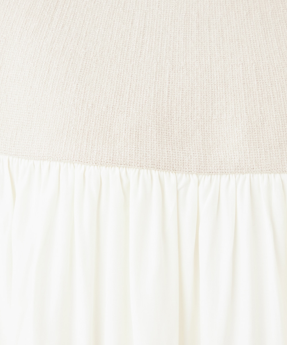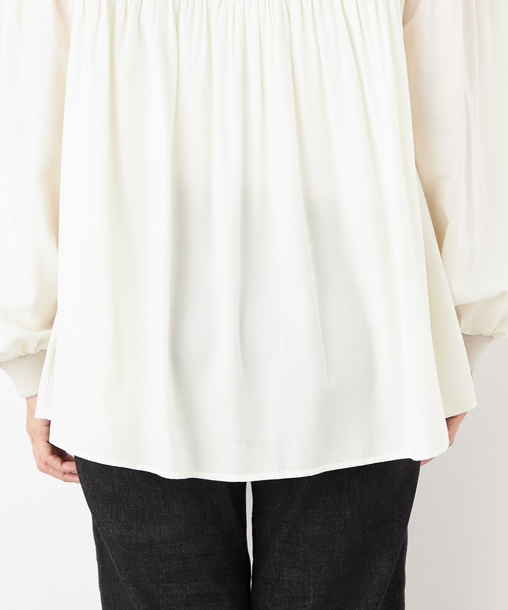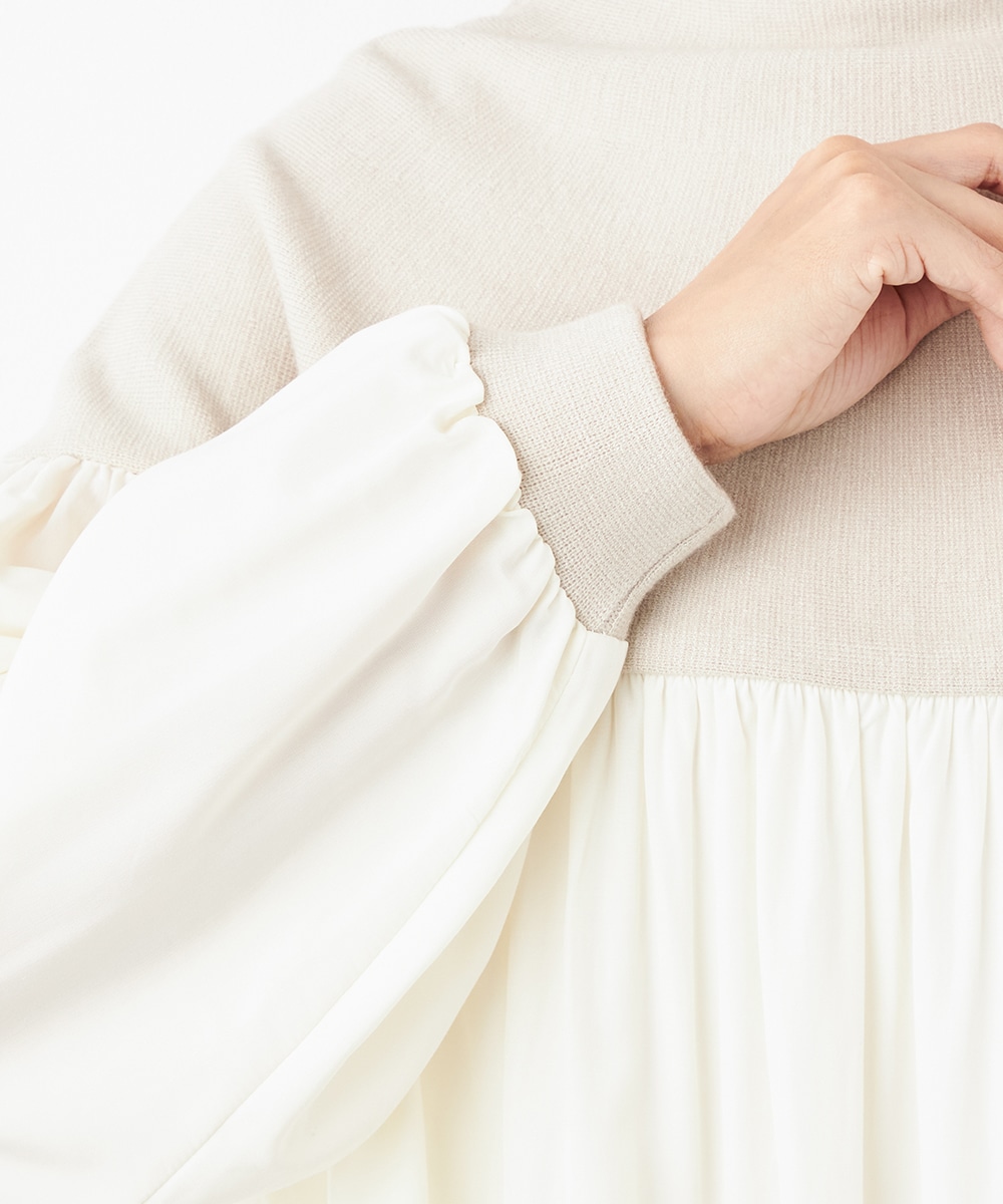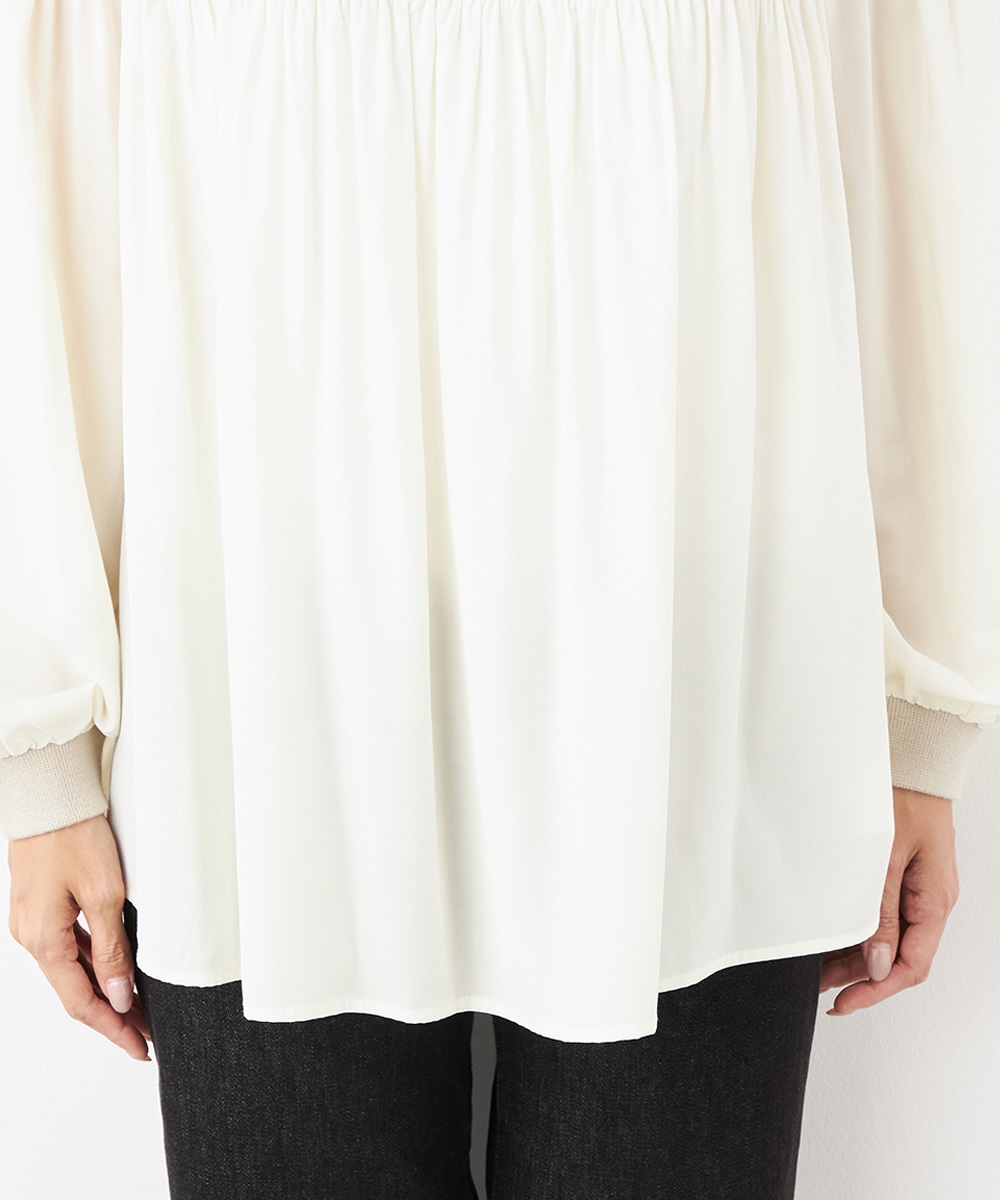 ニット部分は適度な厚みで目面もきれいに仕上がり、上品な表情です。布帛にはたっぷりのギャザーを施して、フェミニンな印象を演出しています。大人っぽく落ち着いたコーディネートを楽しめるハイネックを採用。切り替えを肩下にデザインしたことで、シルエットに今年らしいゆる感があります。