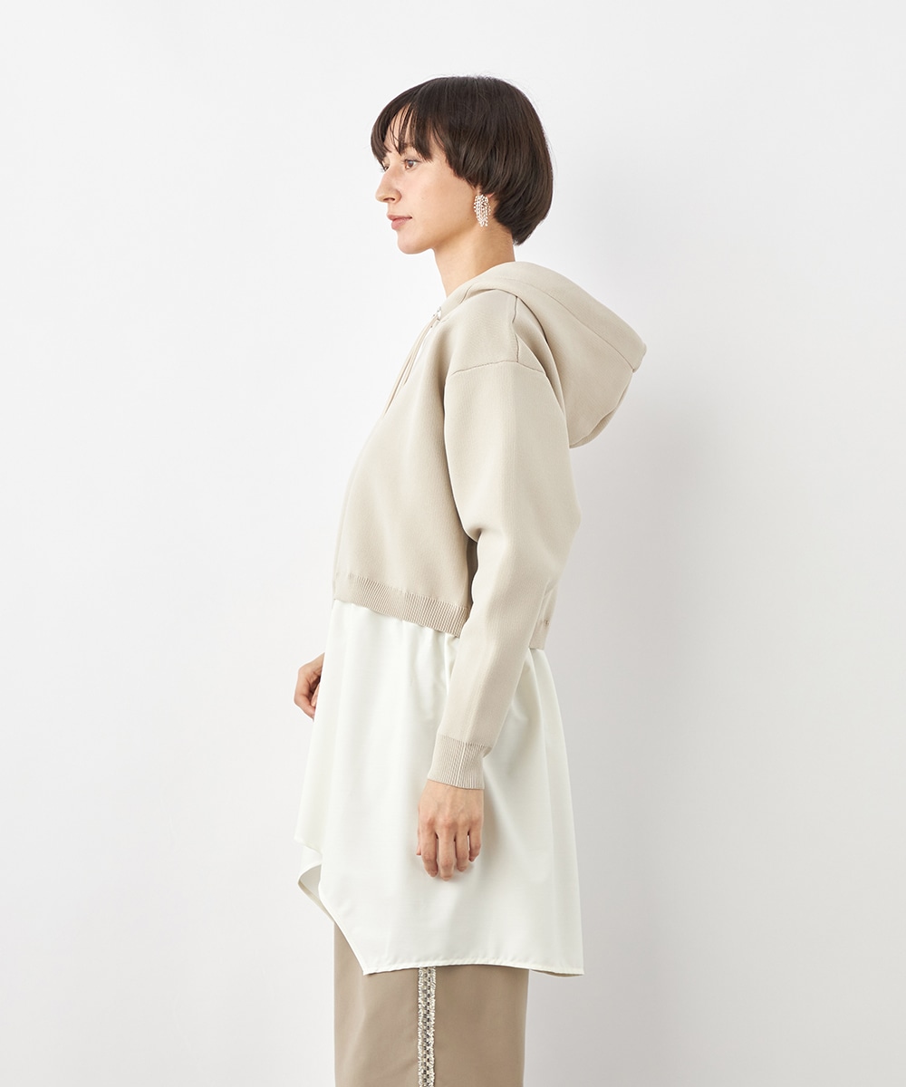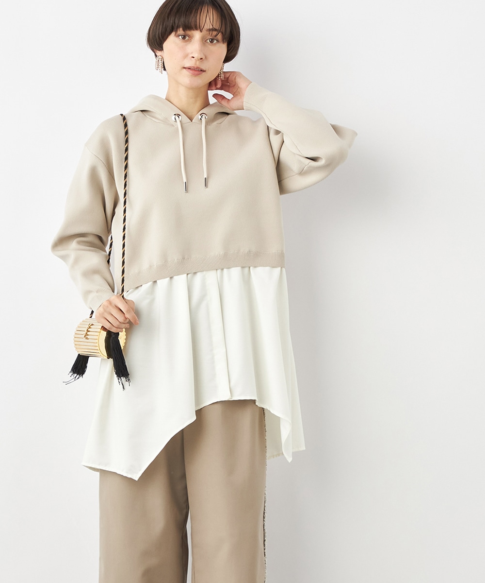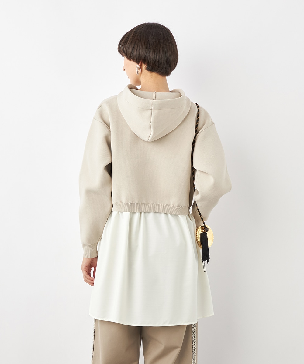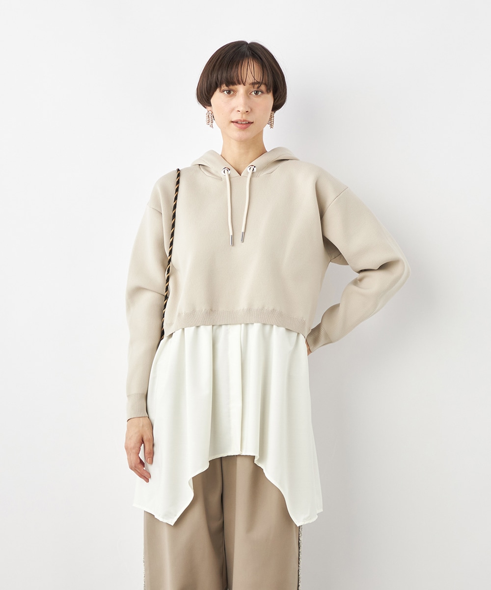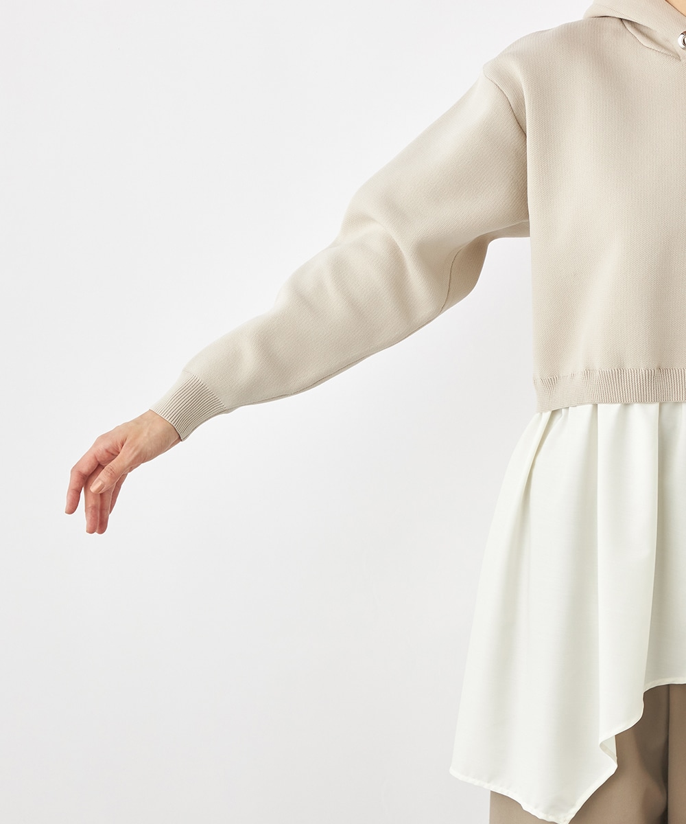 ニットパーカー×シャツのレイヤードルックを1枚で楽しめるドッキングデザインです。ドロップショルダーのゆったりとしたシルエットがトレンドのリラックス感を印象付けるポイント。ポリエステル素材を使用しており、重くなりがちなフードも軽やかな着心地に仕上がっています。