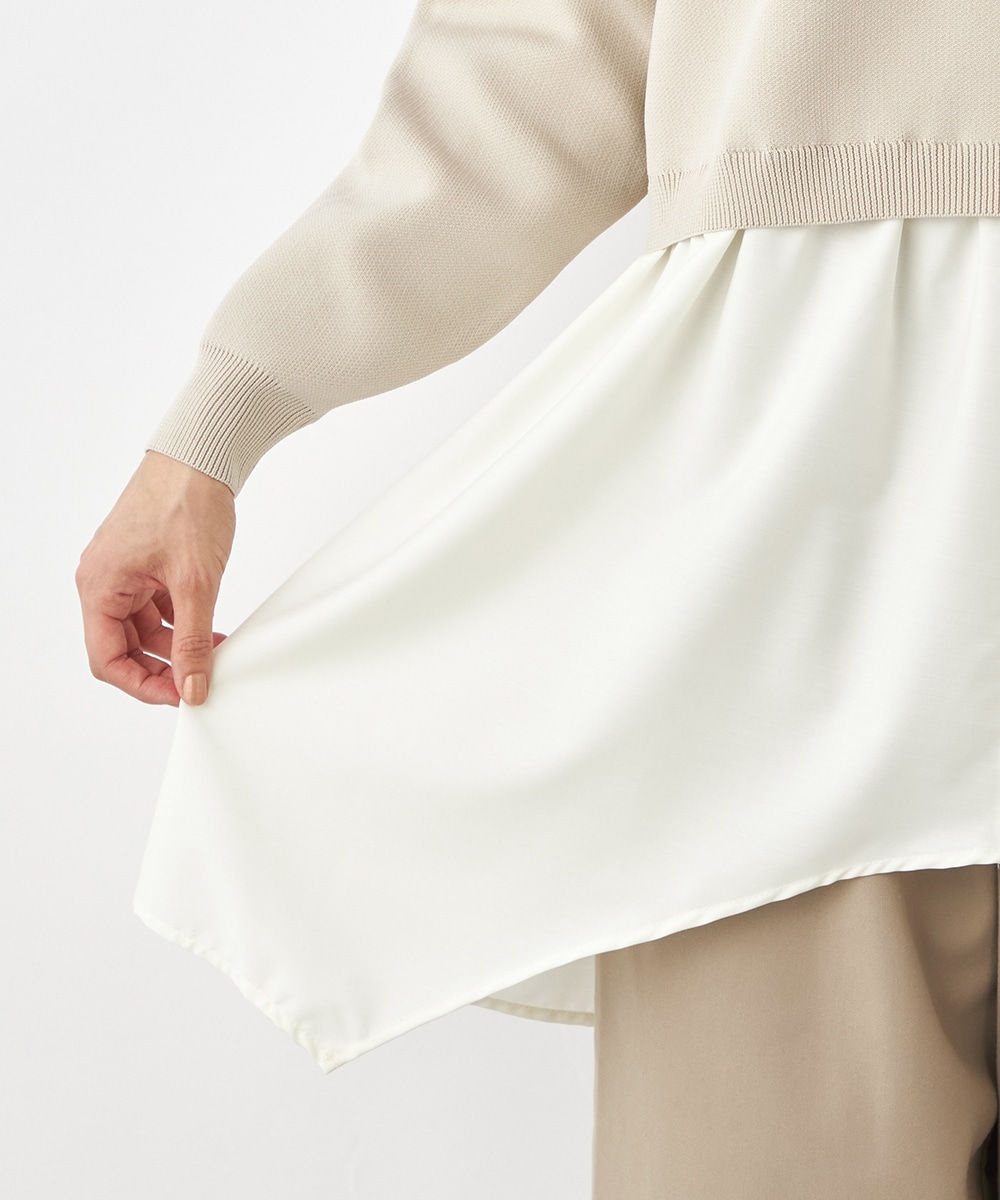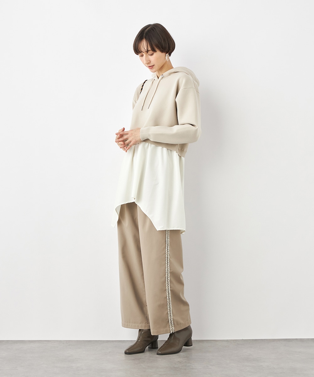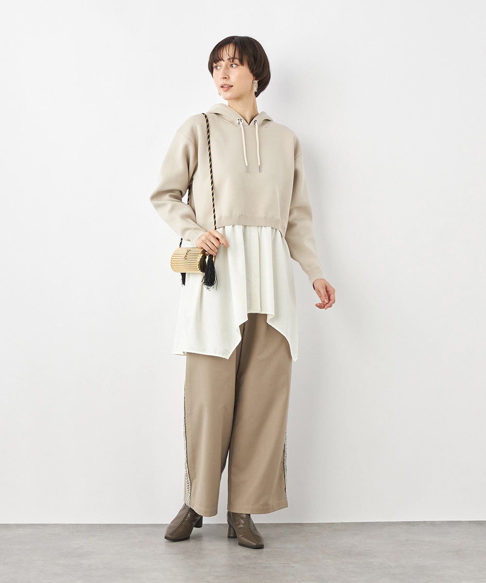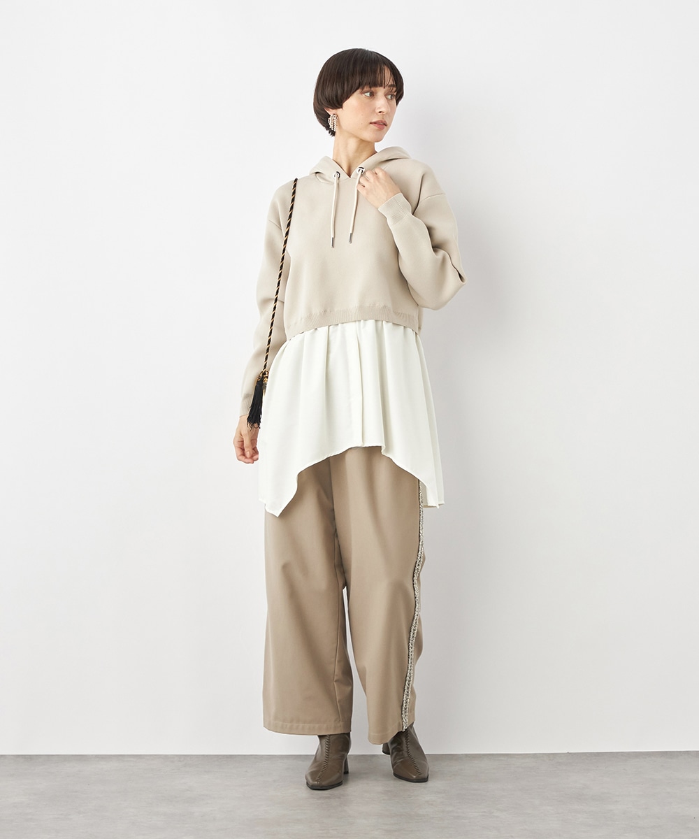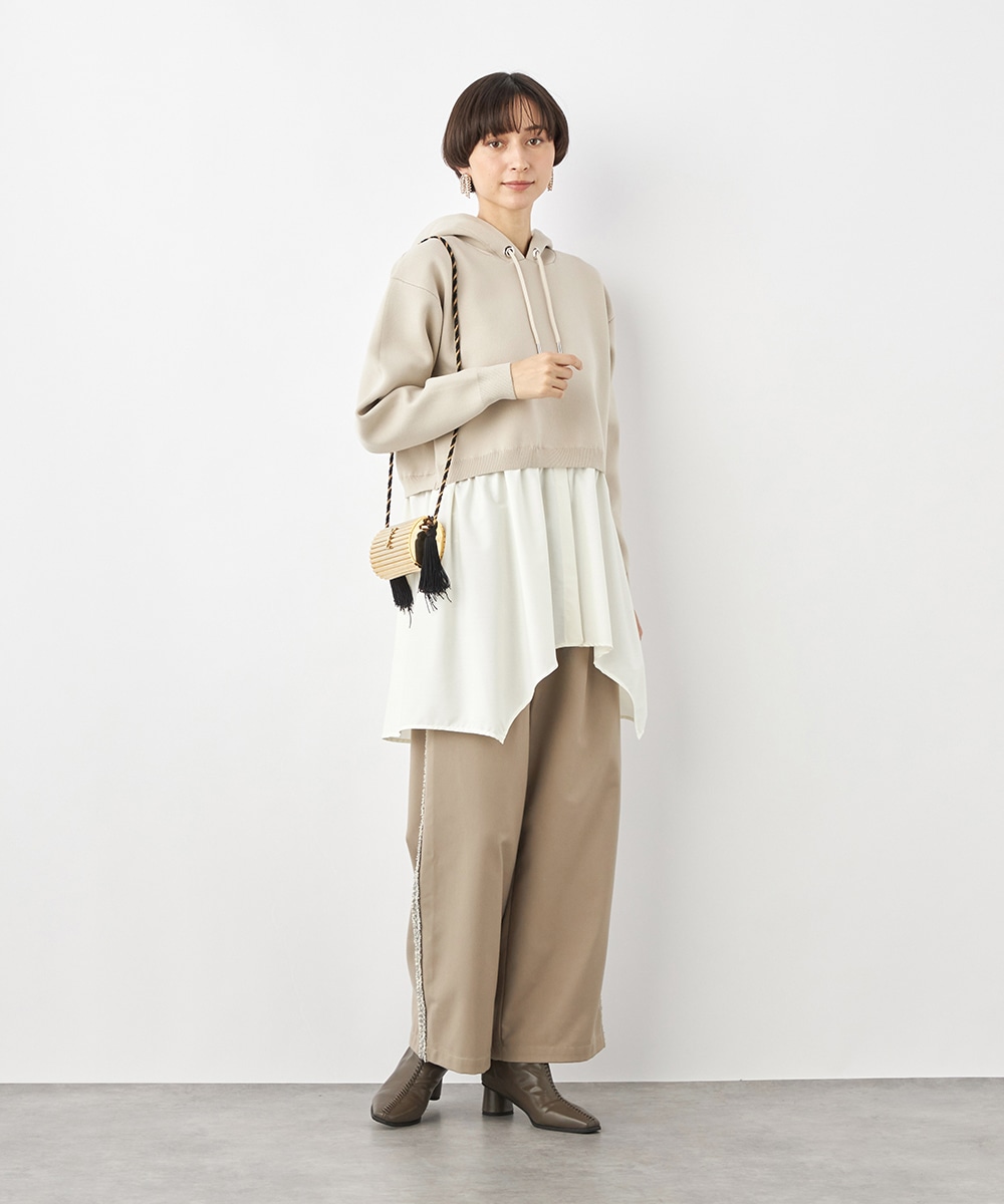 ニットパーカー×シャツのレイヤードルックを1枚で楽しめるドッキングデザインです。ドロップショルダーのゆったりとしたシルエットがトレンドのリラックス感を印象付けるポイント。ポリエステル素材を使用しており、重くなりがちなフードも軽やかな着心地に仕上がっています。