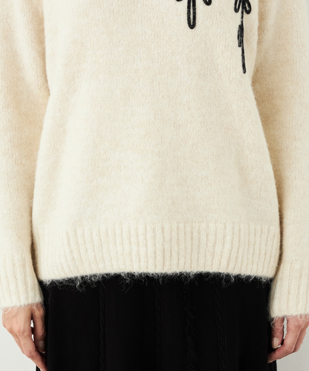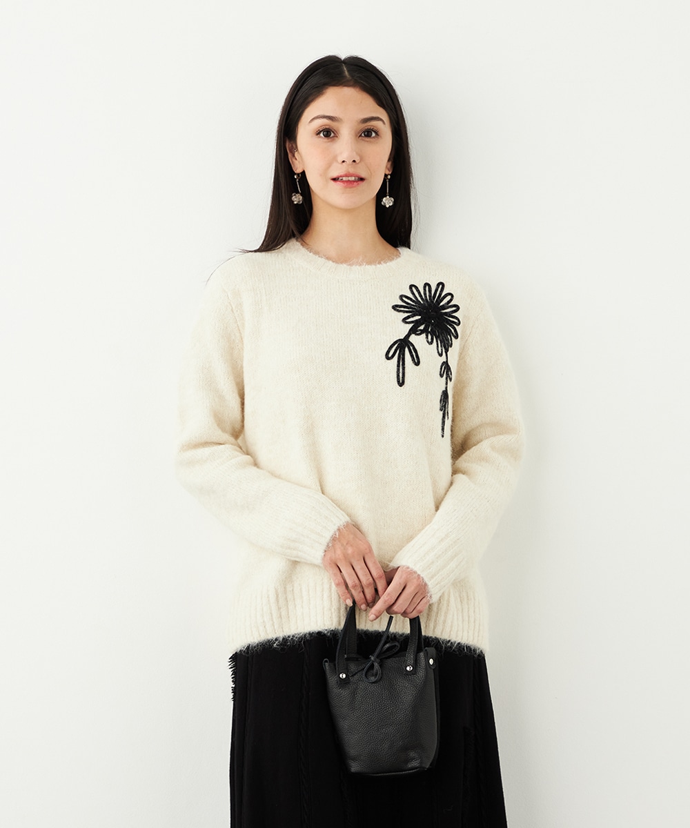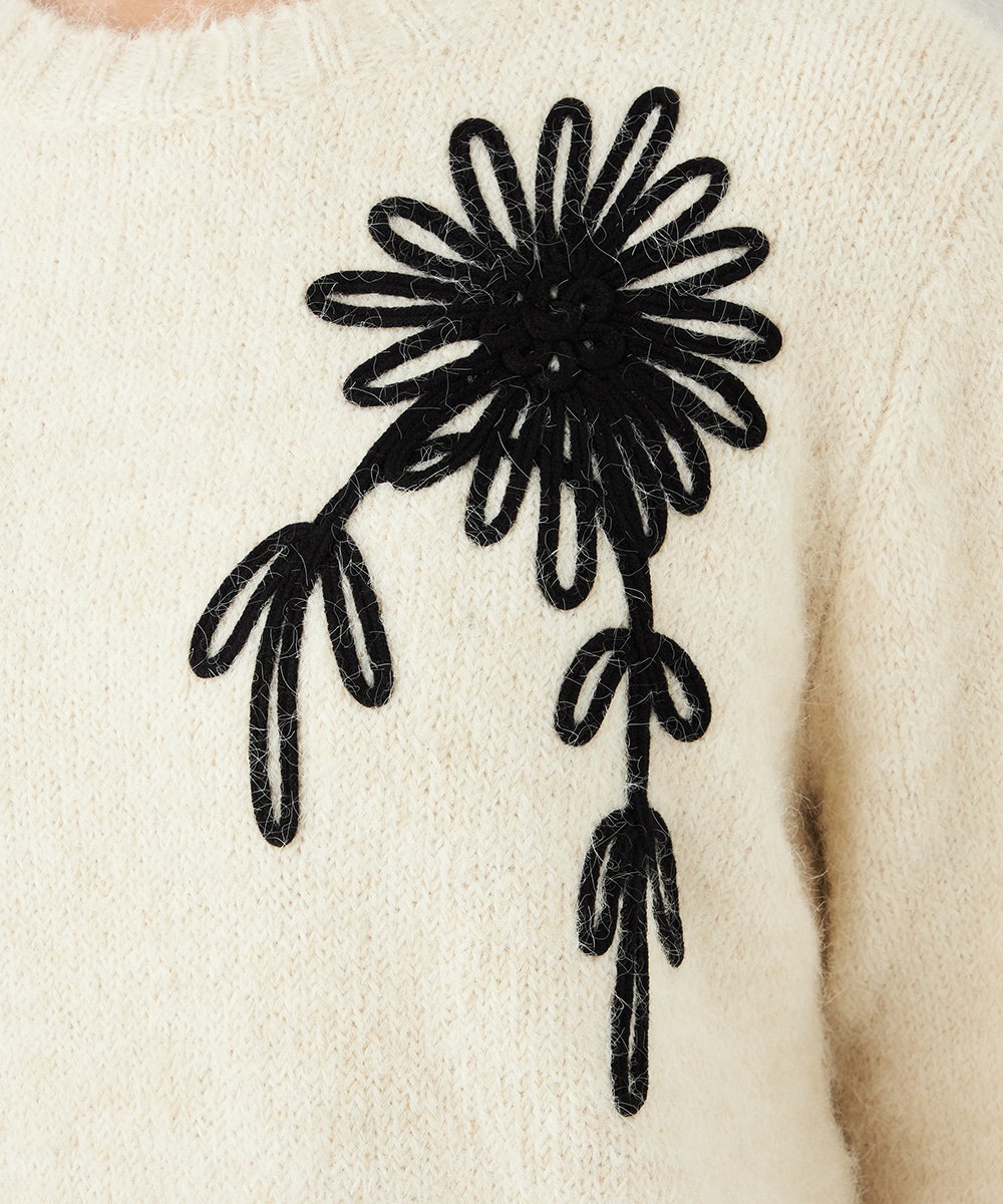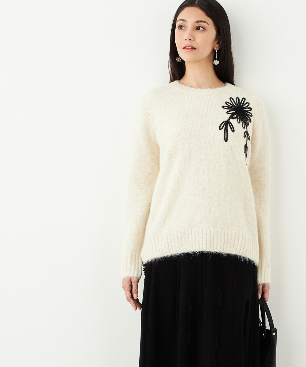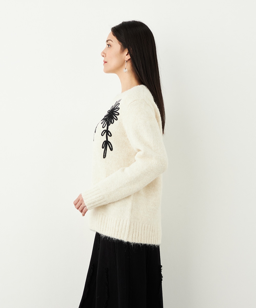 胸上にモチーフがデザインされることで、顔回りが華やぎます。ふわふわとした毛羽感のある表情もキュートさを引き立てるポイント。モノトーンカラーで甘くなりすぎず、着こなしやすい1枚に仕上がっています。着丈はほどよく、さまざまなボトムスと好相性のアイテムです。