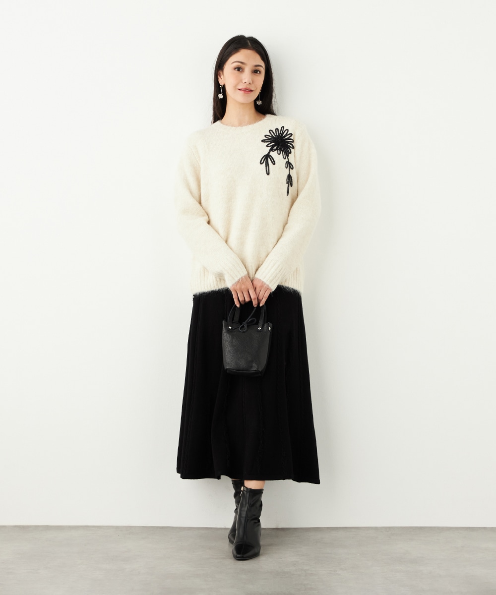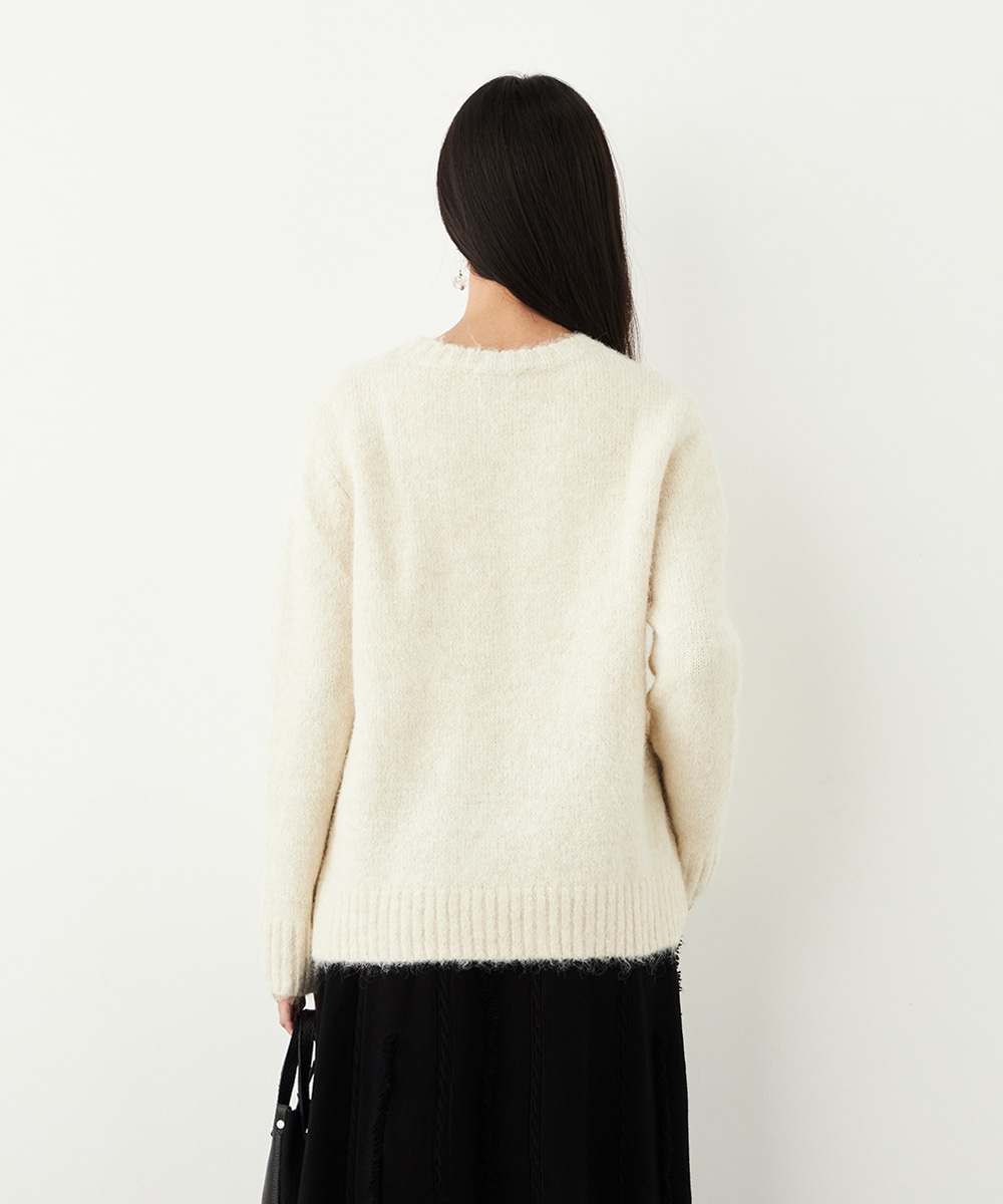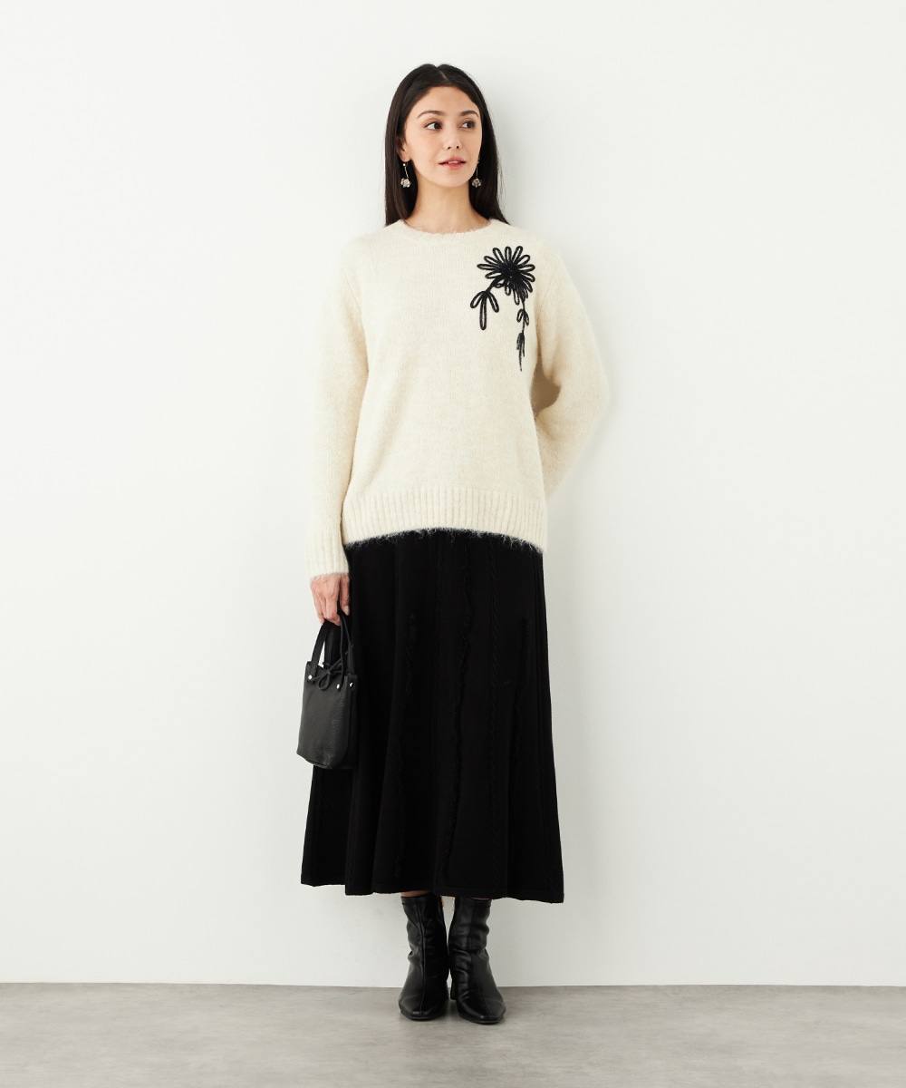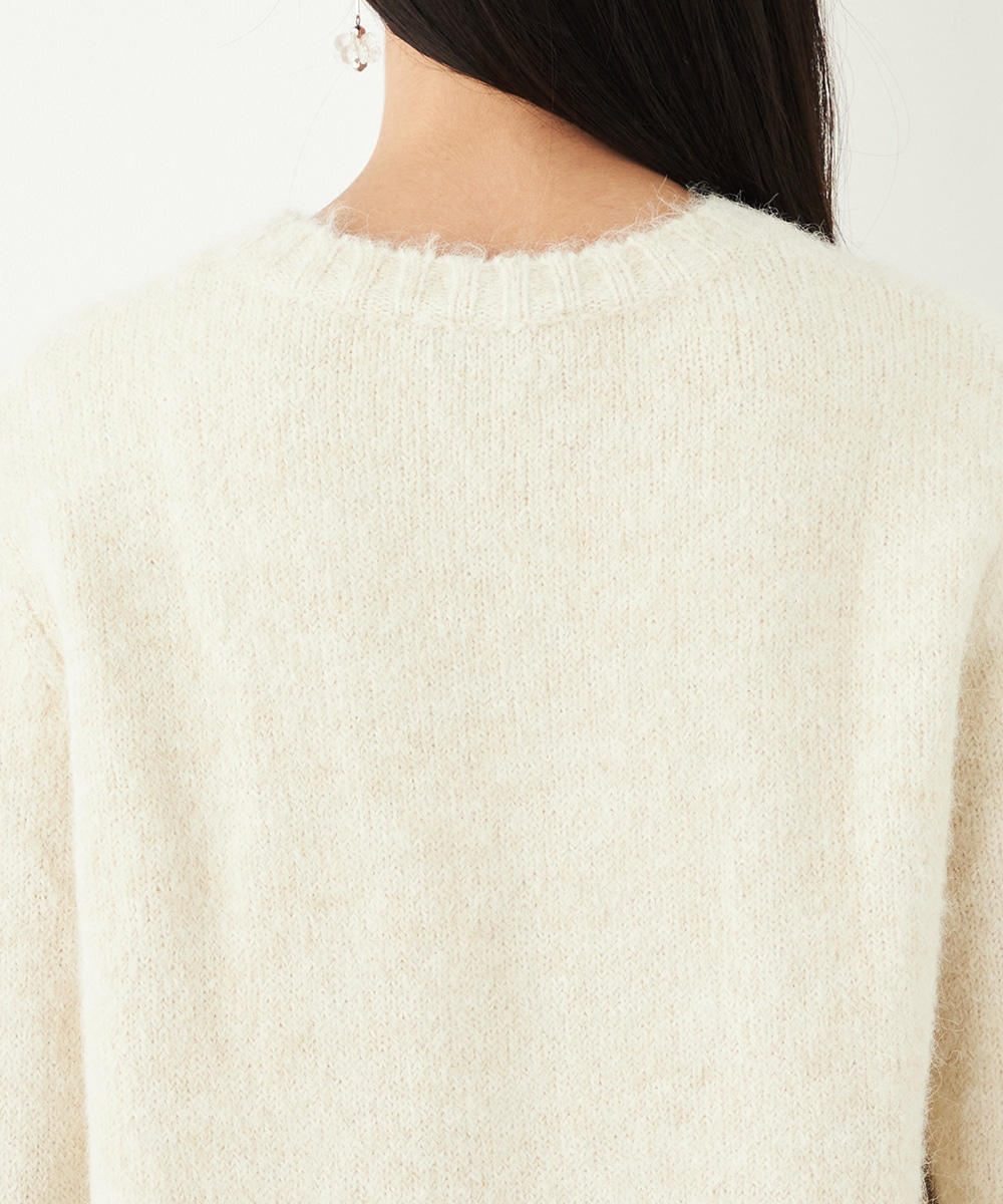 胸上にモチーフがデザインされることで、顔回りが華やぎます。ふわふわとした毛羽感のある表情もキュートさを引き立てるポイント。モノトーンカラーで甘くなりすぎず、着こなしやすい1枚に仕上がっています。着丈はほどよく、さまざまなボトムスと好相性のアイテムです。