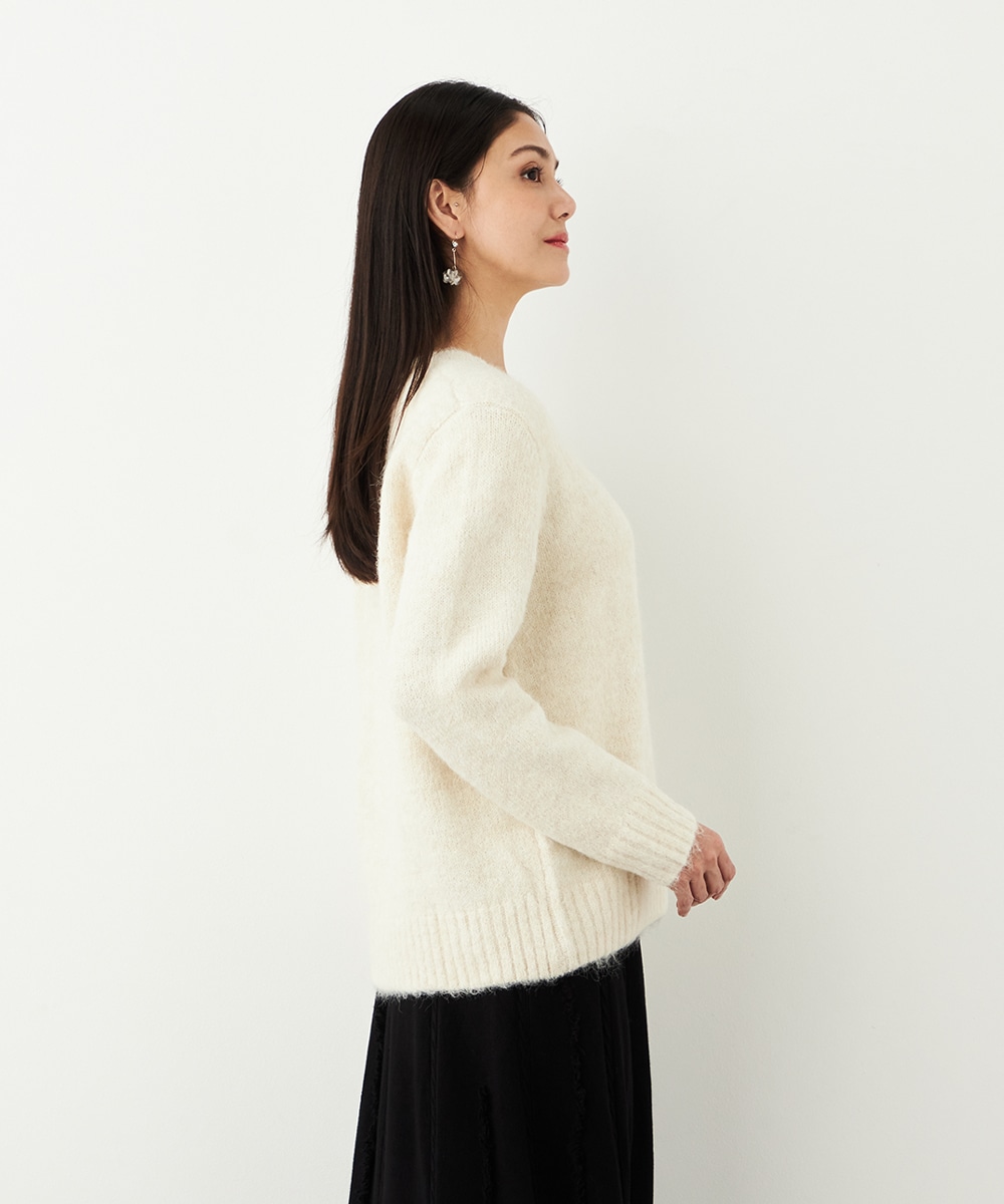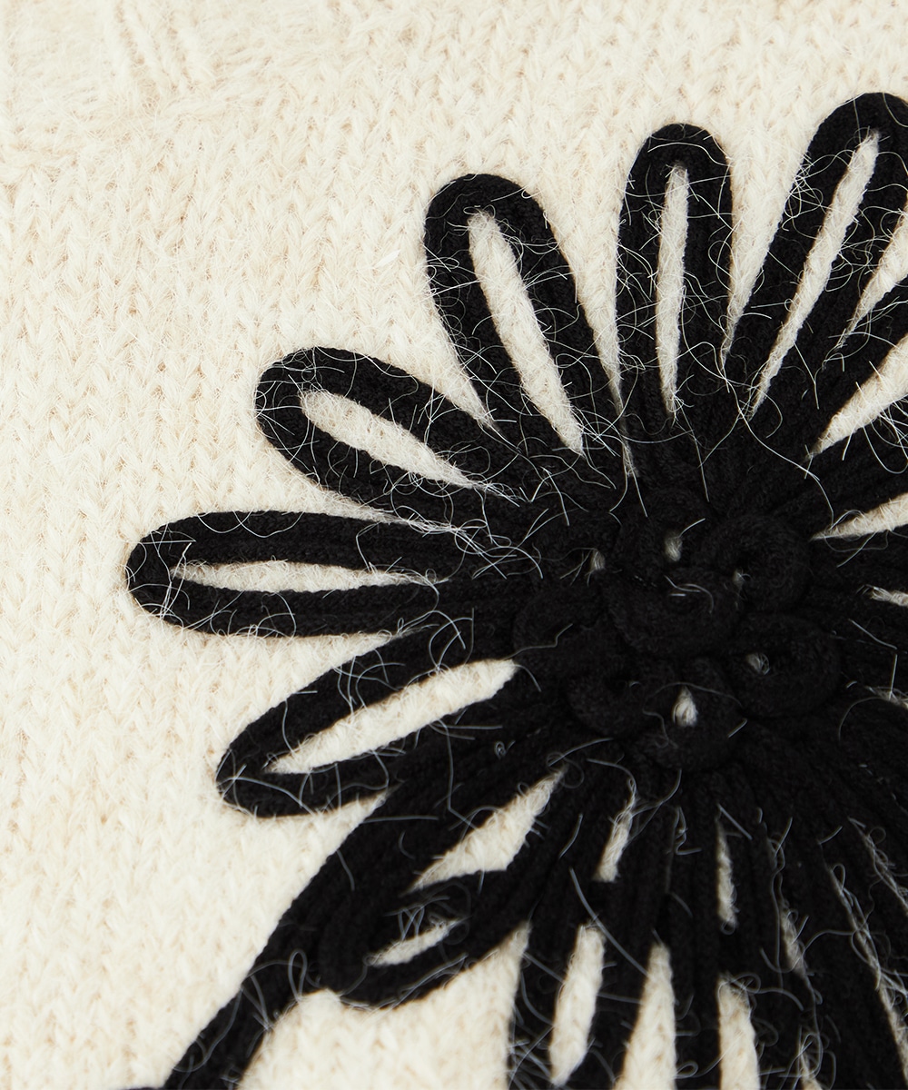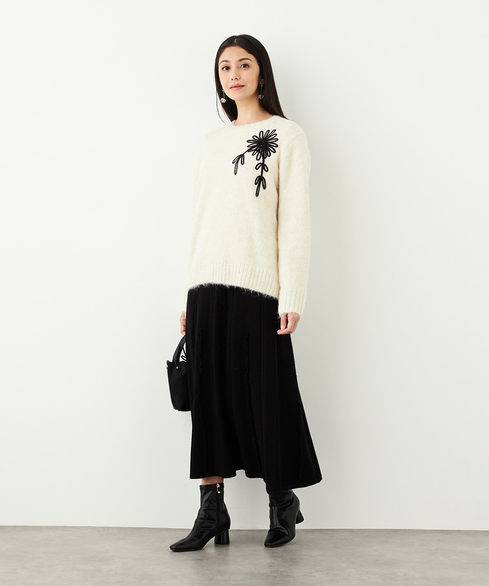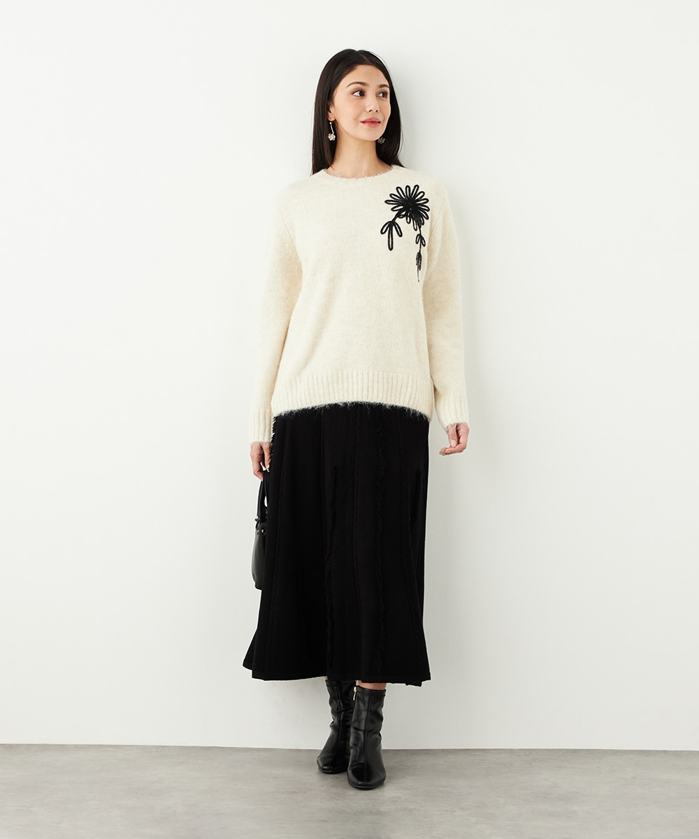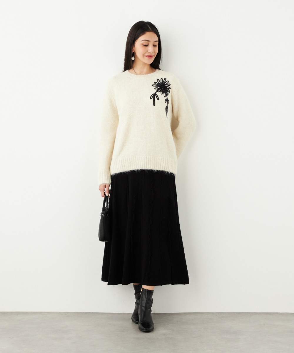 胸上にモチーフがデザインされることで、顔回りが華やぎます。ふわふわとした毛羽感のある表情もキュートさを引き立てるポイント。モノトーンカラーで甘くなりすぎず、着こなしやすい1枚に仕上がっています。着丈はほどよく、さまざまなボトムスと好相性のアイテムです。