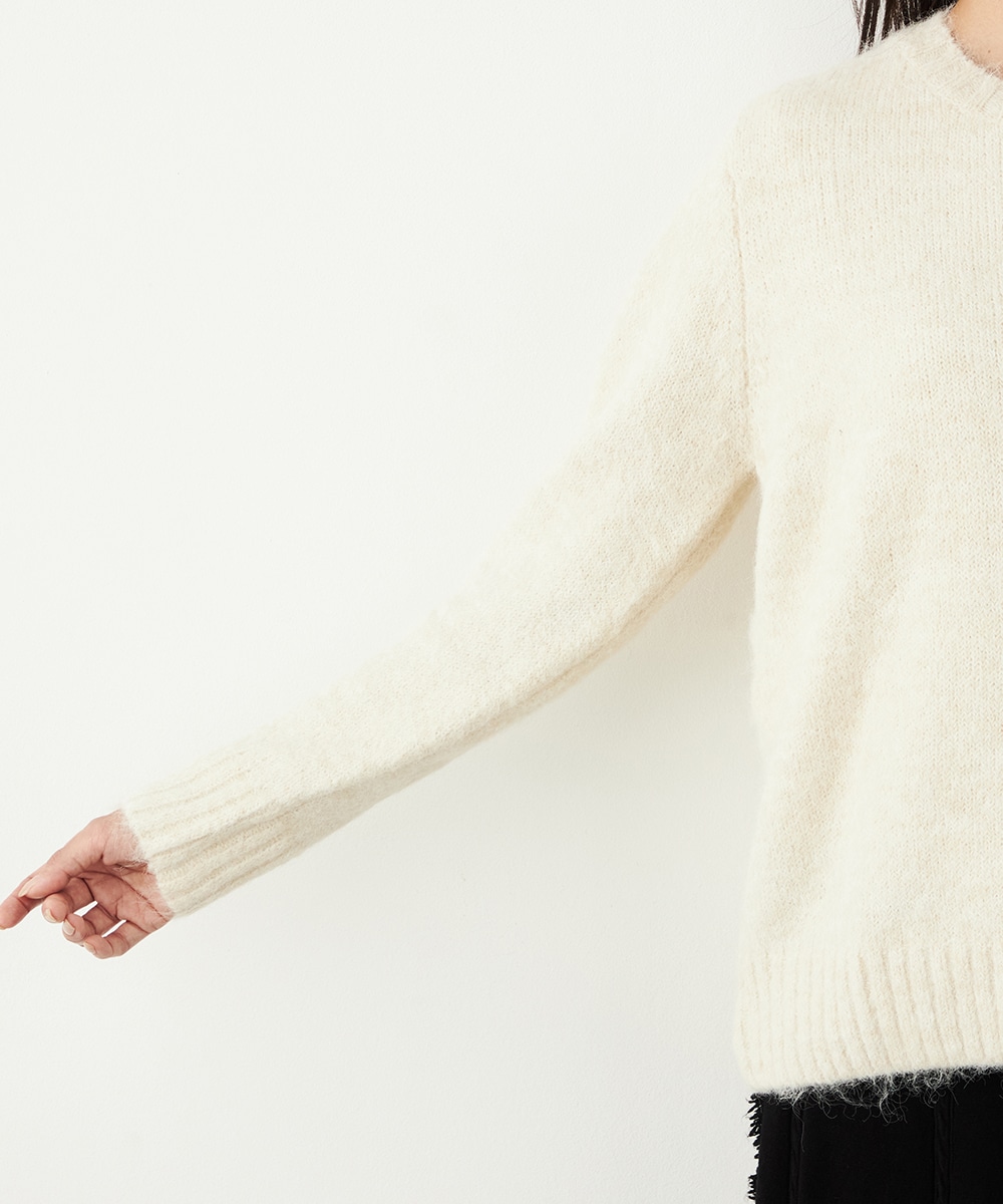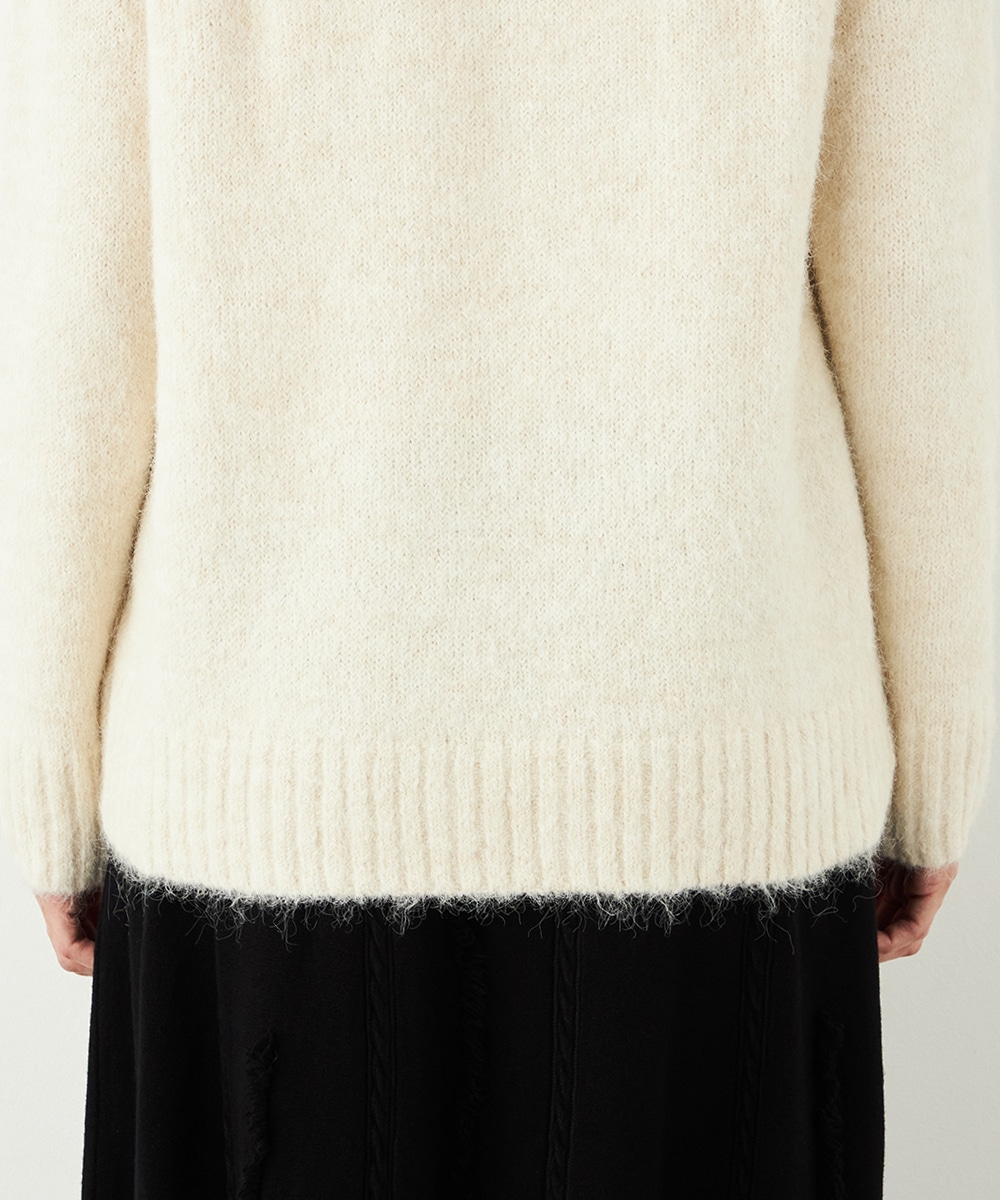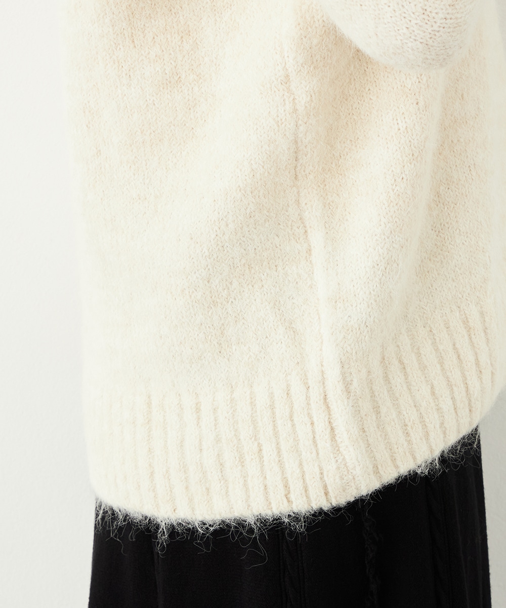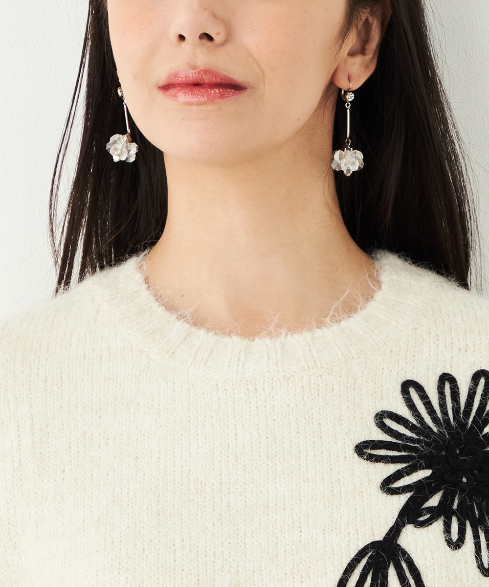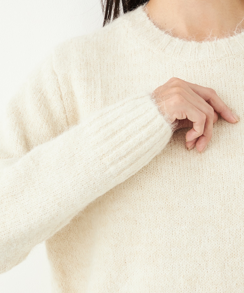 胸上にモチーフがデザインされることで、顔回りが華やぎます。ふわふわとした毛羽感のある表情もキュートさを引き立てるポイント。モノトーンカラーで甘くなりすぎず、着こなしやすい1枚に仕上がっています。着丈はほどよく、さまざまなボトムスと好相性のアイテムです。