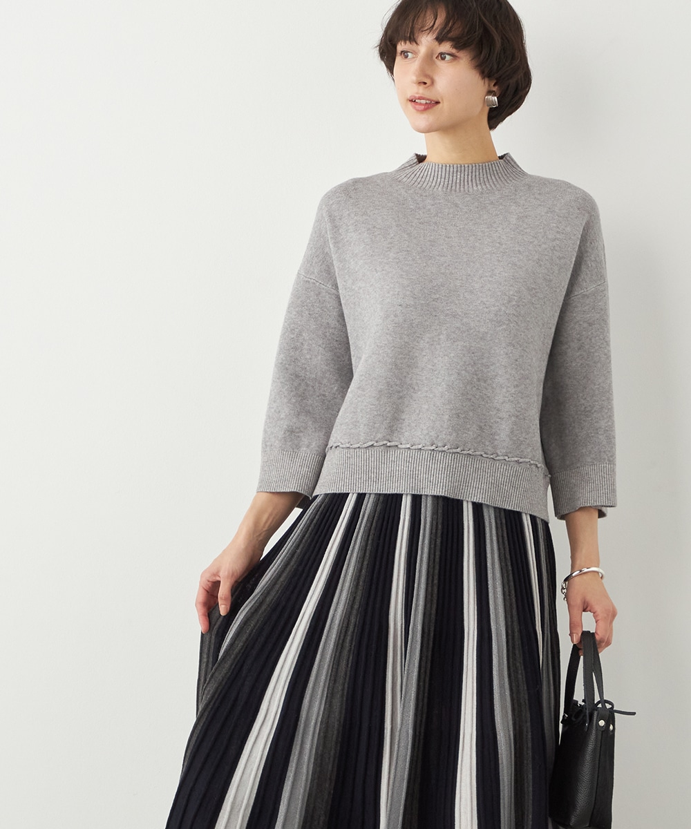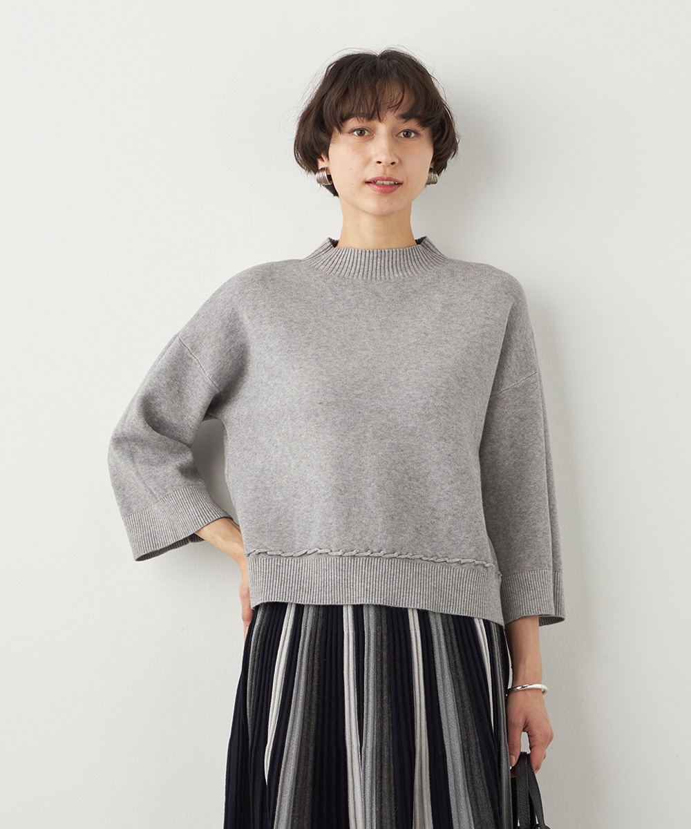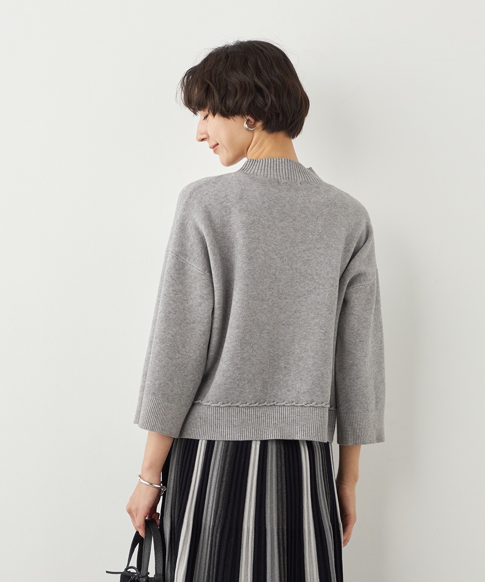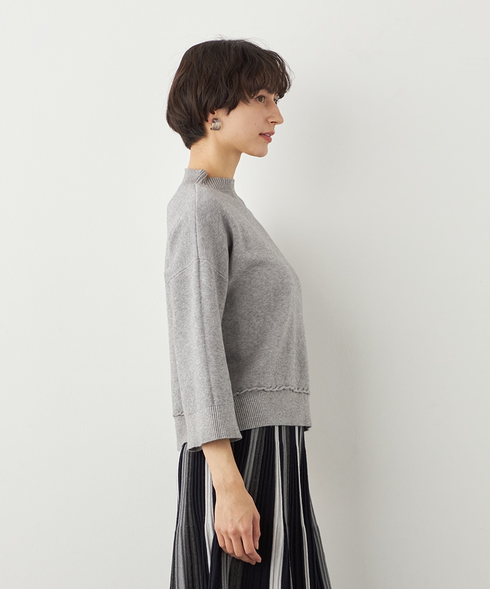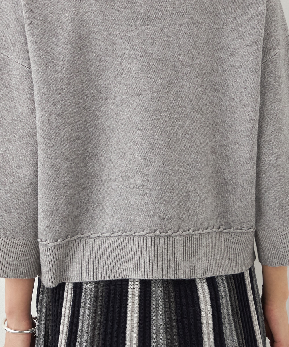 短めの着丈でコンパクトな印象にまとまり、ボトムスを選ばず多彩なコーディネートを楽しめます。手首が覗く七分袖の軽やかさも魅力です。ドロップショルダーのゆったりとしたシルエットはトレンドのリラックス感を演出します。使い勝手が良いベーシックな単色デザインです。