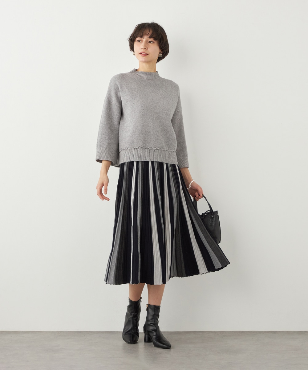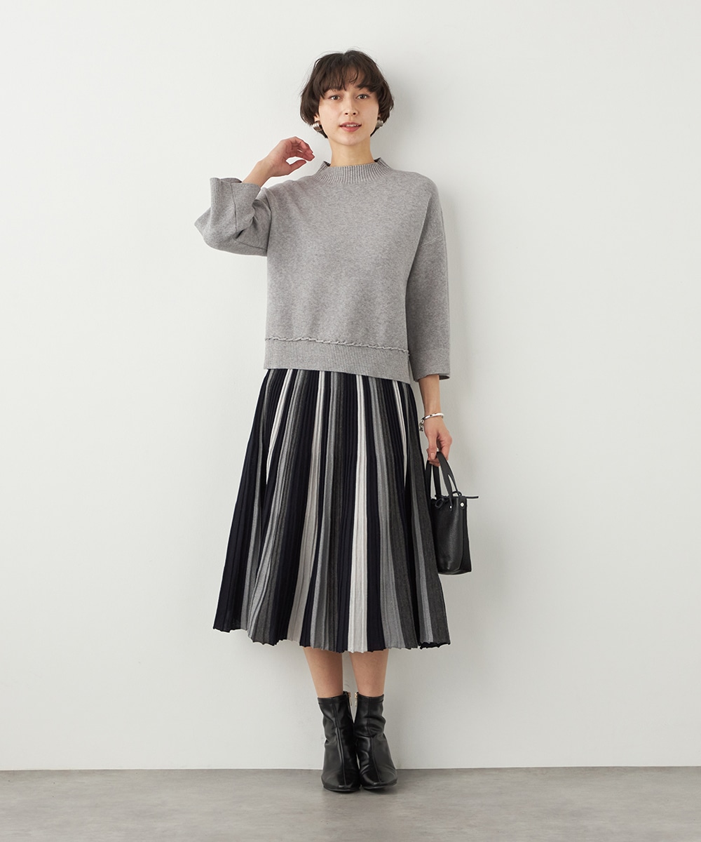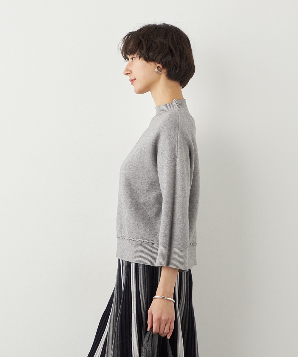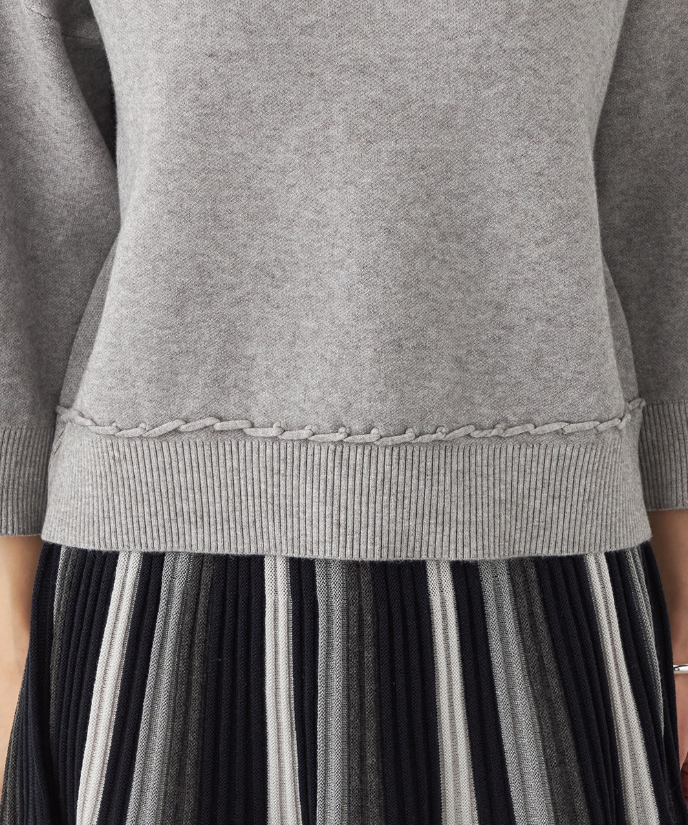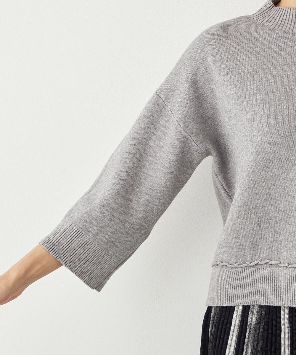 短めの着丈でコンパクトな印象にまとまり、ボトムスを選ばず多彩なコーディネートを楽しめます。手首が覗く七分袖の軽やかさも魅力です。ドロップショルダーのゆったりとしたシルエットはトレンドのリラックス感を演出します。使い勝手が良いベーシックな単色デザインです。