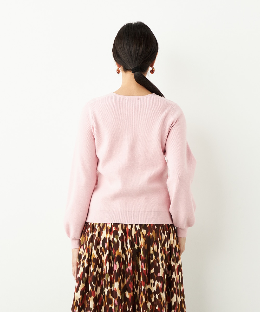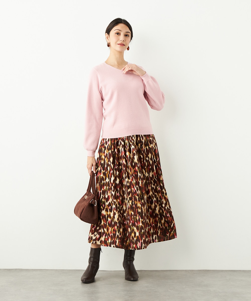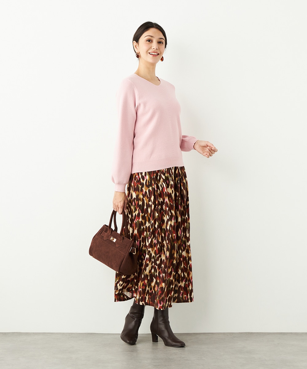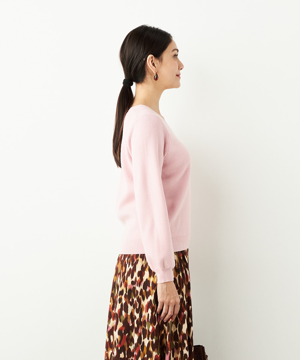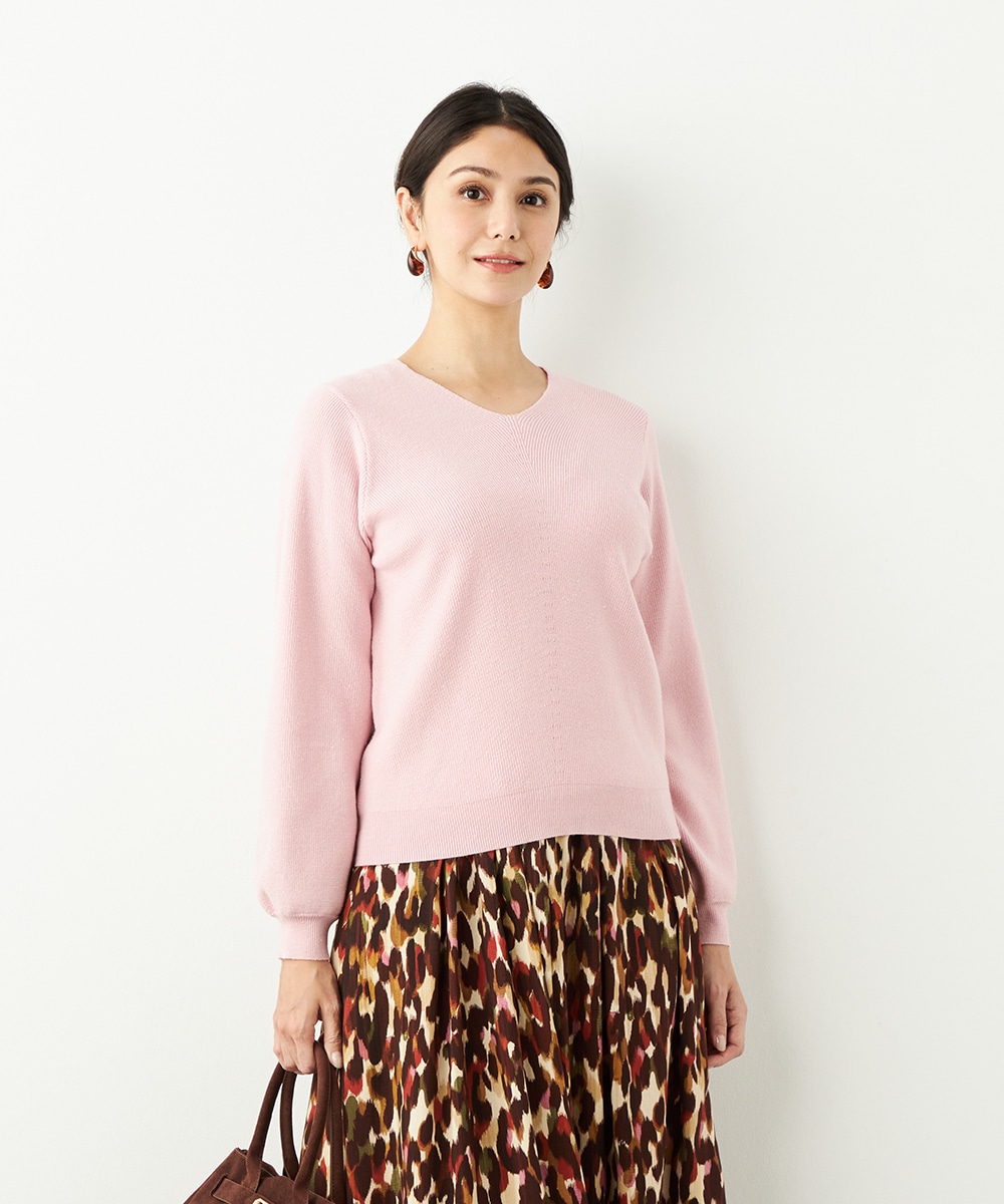 ソフトな風合いで繊細な煌めきが見られる糸を使用しています。シンプルなデザインが素材の持ち味を引き立てるポイントです。一部カラーはスカートと同カラーでご用意していますので、トップスインでベルトをするとワンピース風のセットアップコーディネートを楽しめます。