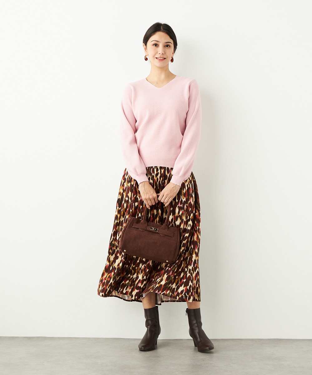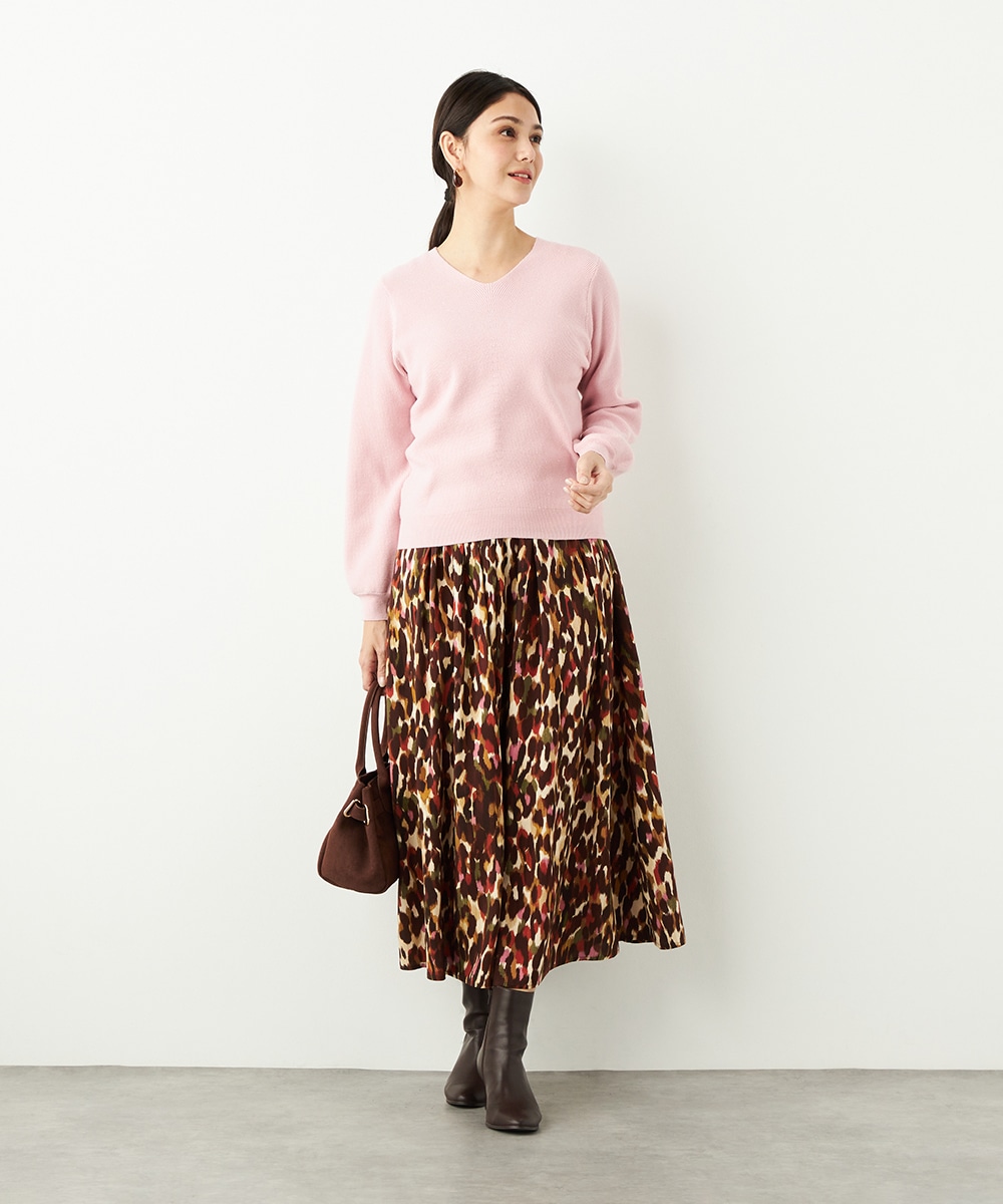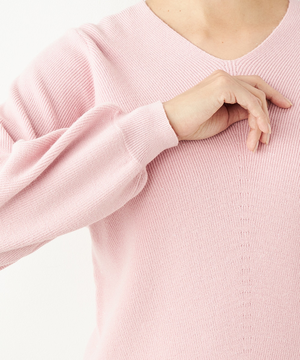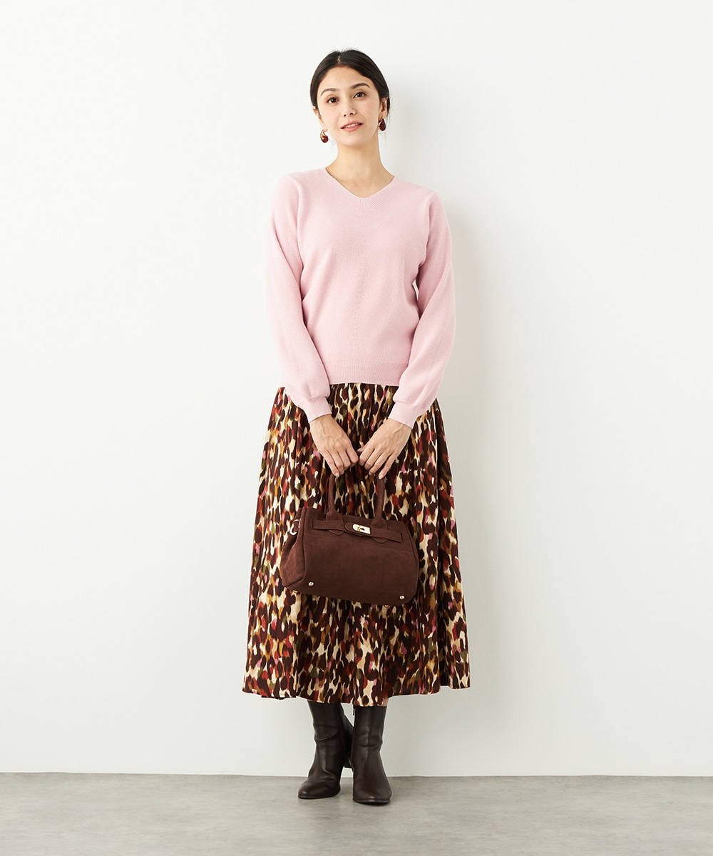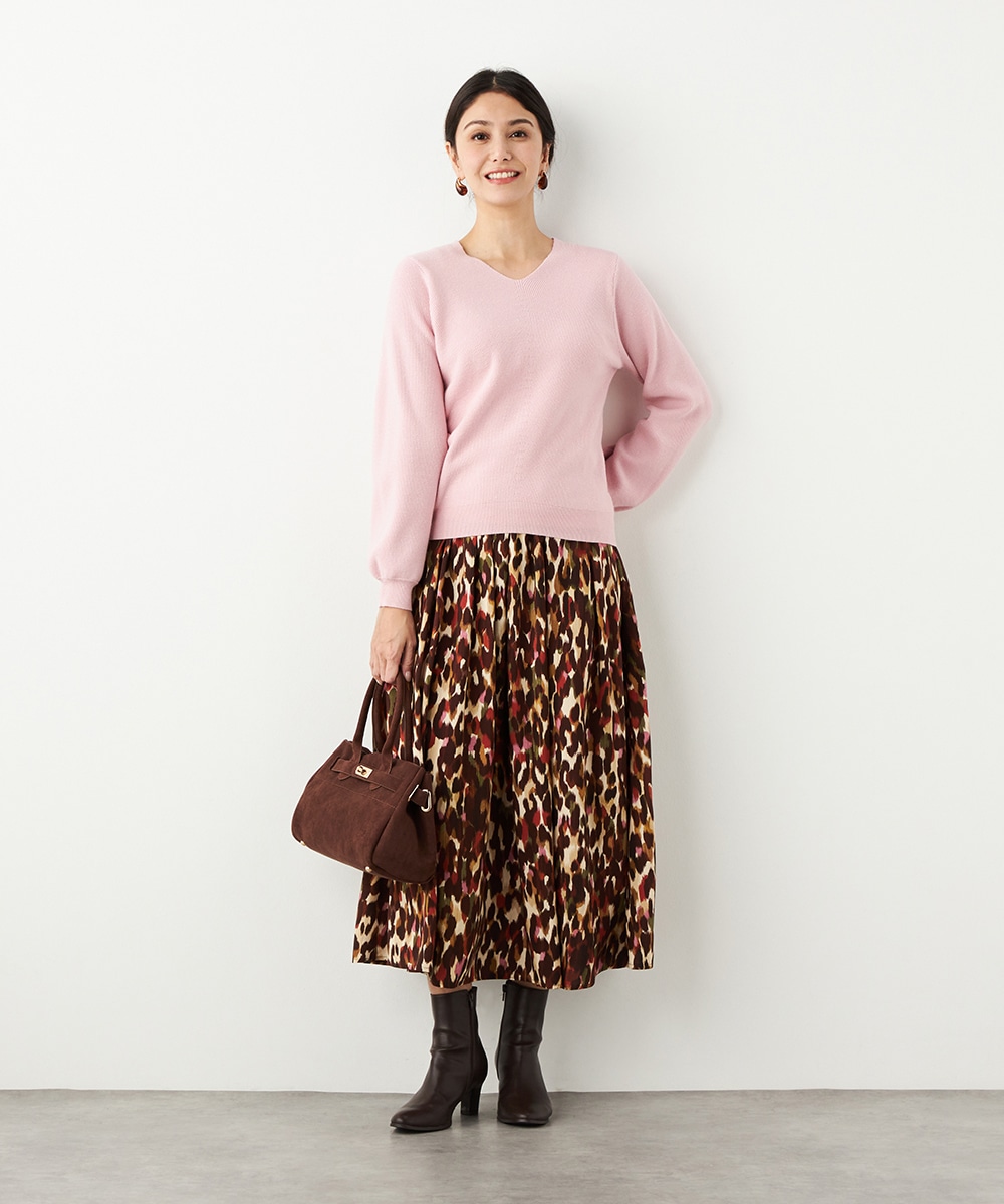 ソフトな風合いで繊細な煌めきが見られる糸を使用しています。シンプルなデザインが素材の持ち味を引き立てるポイントです。一部カラーはスカートと同カラーでご用意していますので、トップスインでベルトをするとワンピース風のセットアップコーディネートを楽しめます。