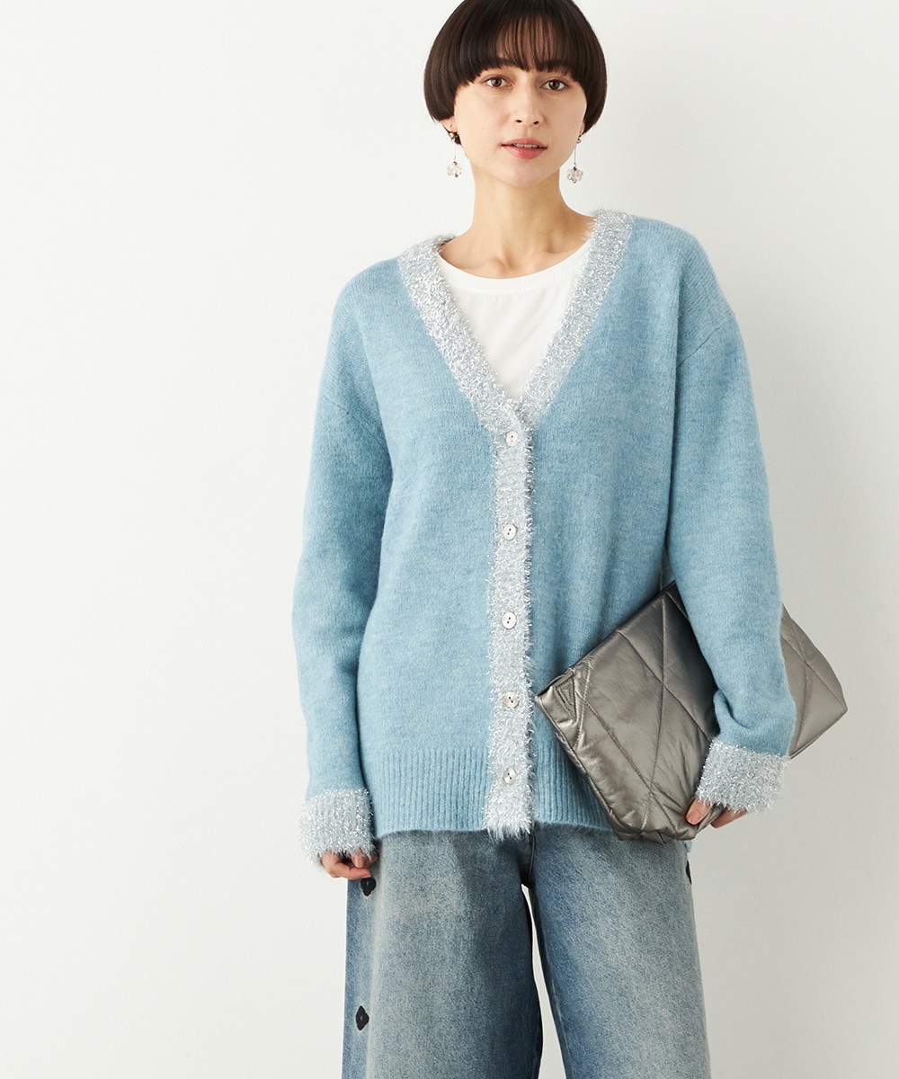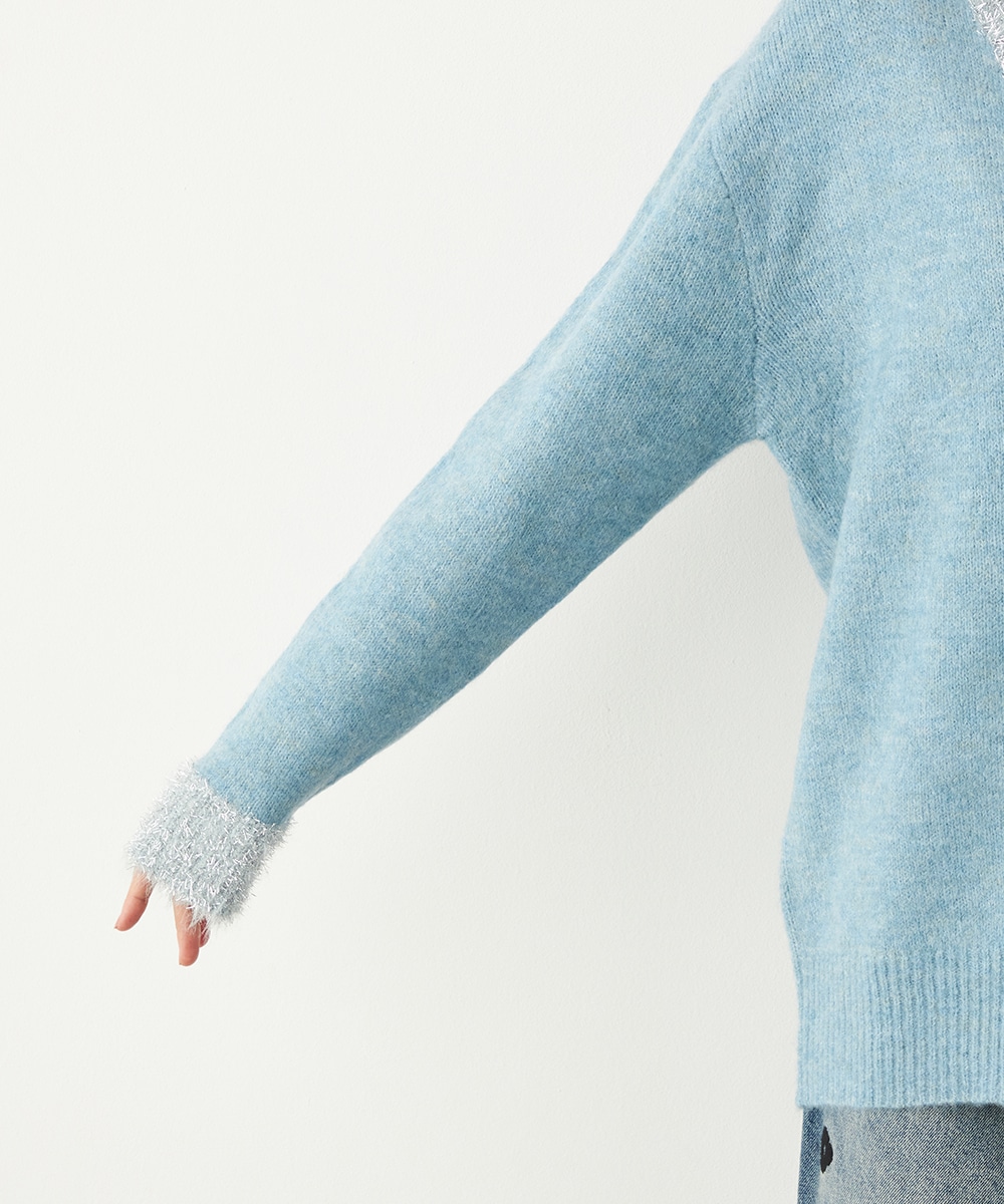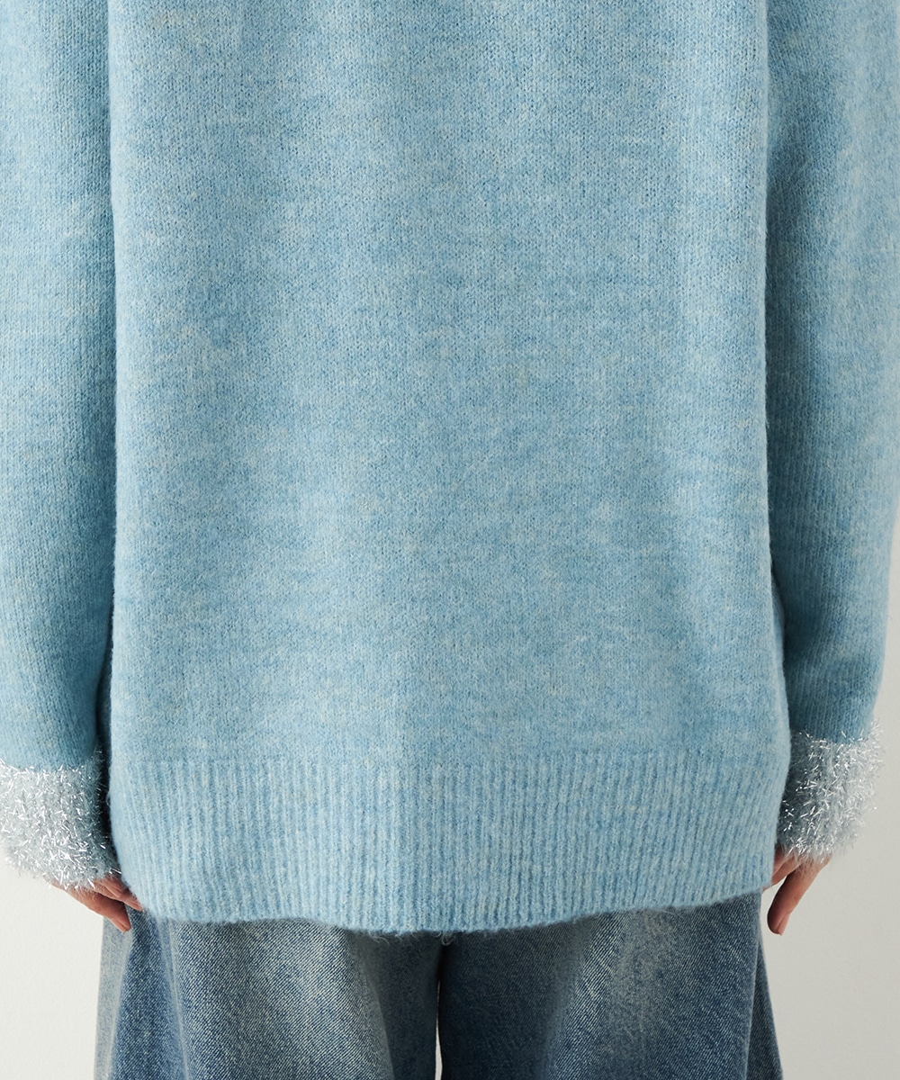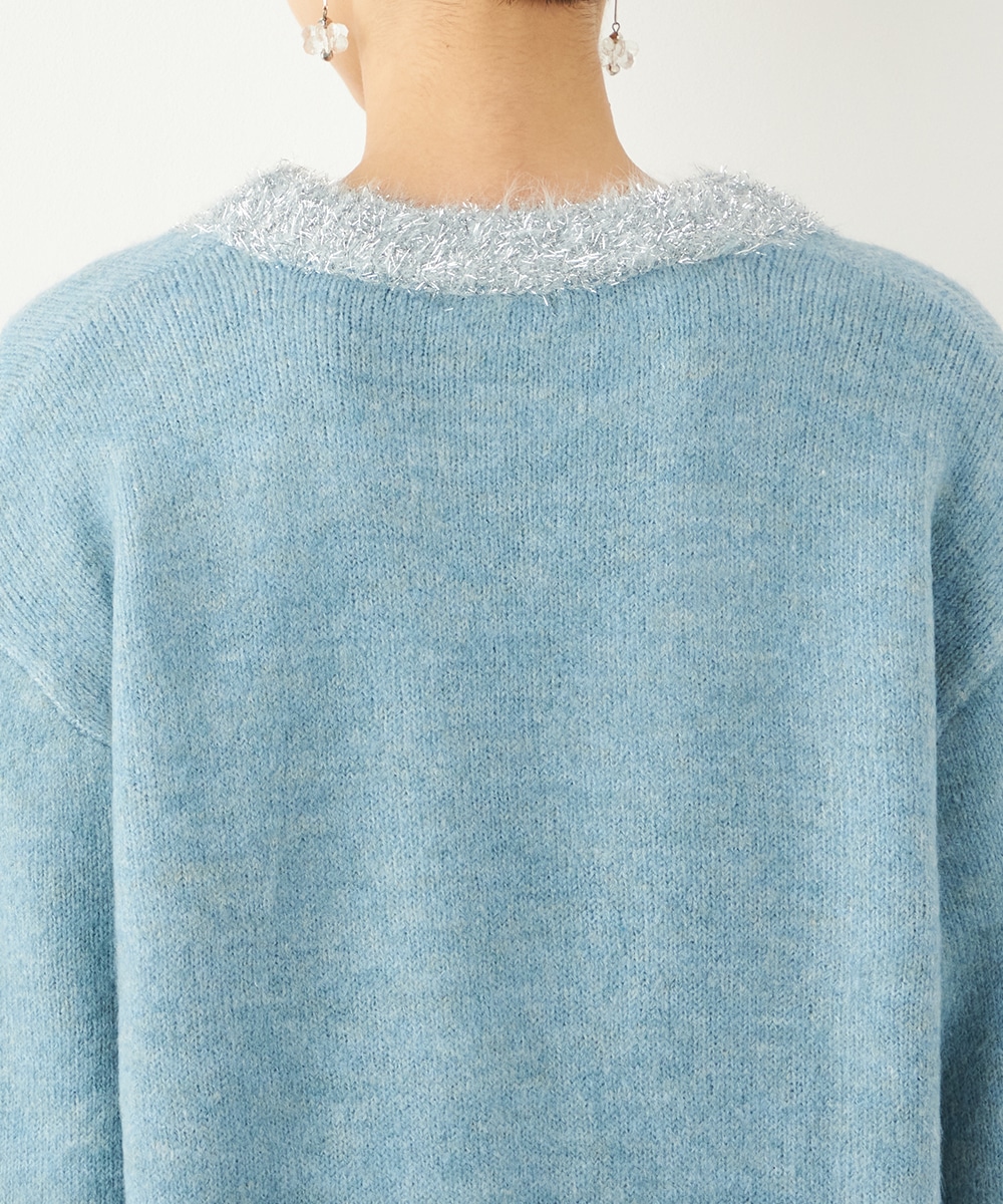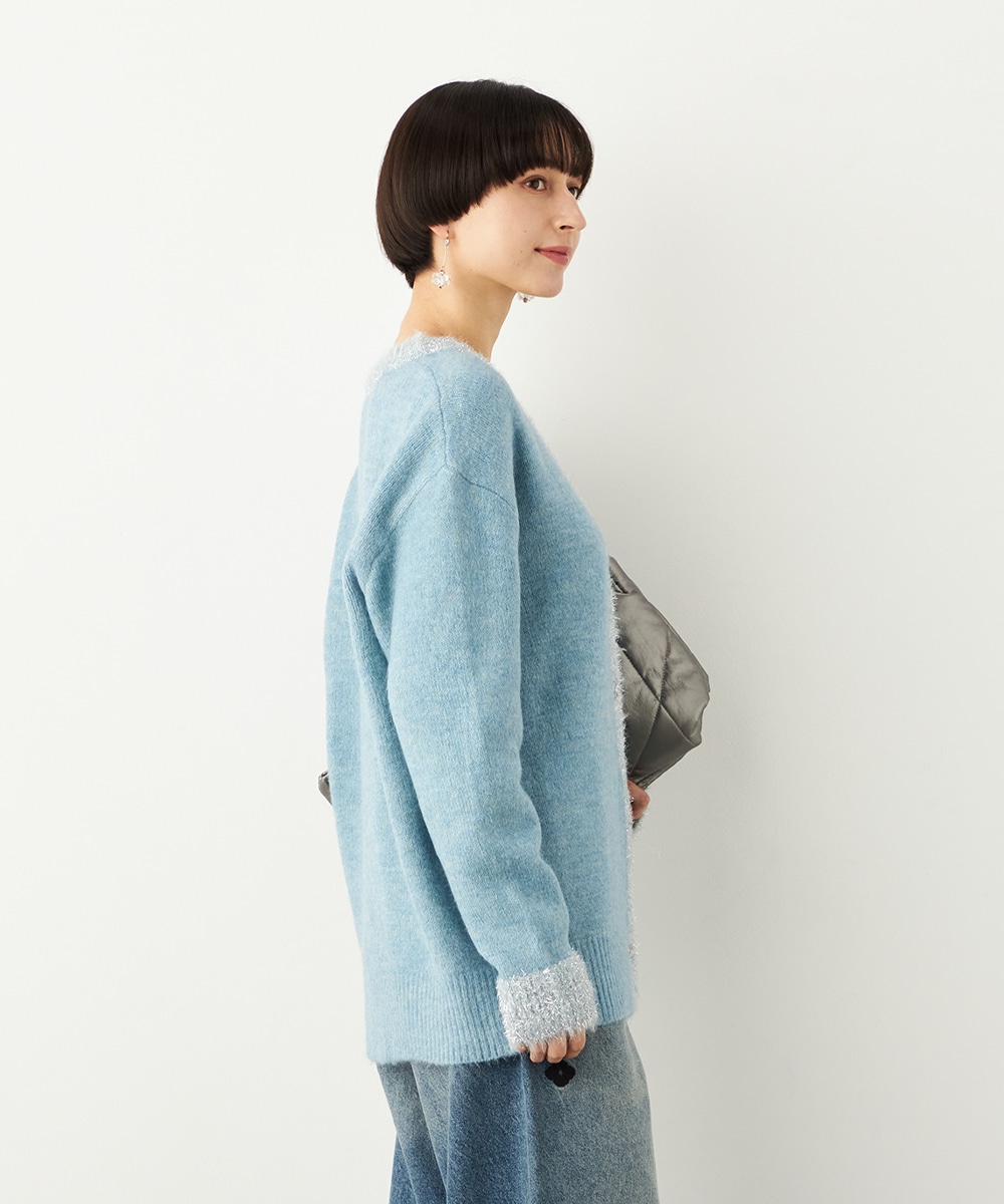 ベースはヘアリーな表情と、深みのある色合いが魅力の素材です。ネックから前立てと袖口には、ラメ入りでフェザー感のある糸を取り入れています。ドロップショルダーのゆったりとしたシルエットと長めの着丈がリラックス感のポイント。着こなしやすいスタンダードなVネックのデザインです。