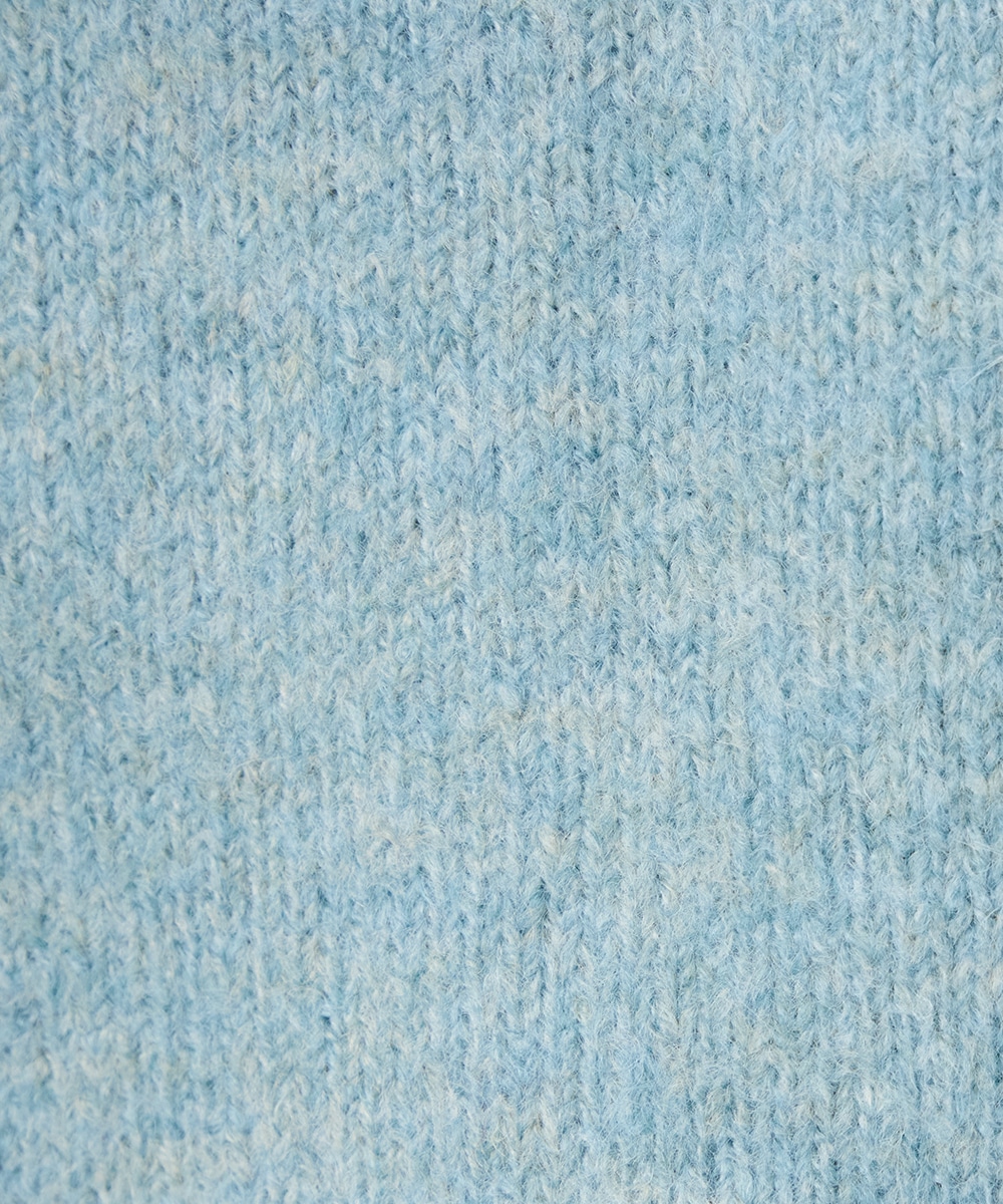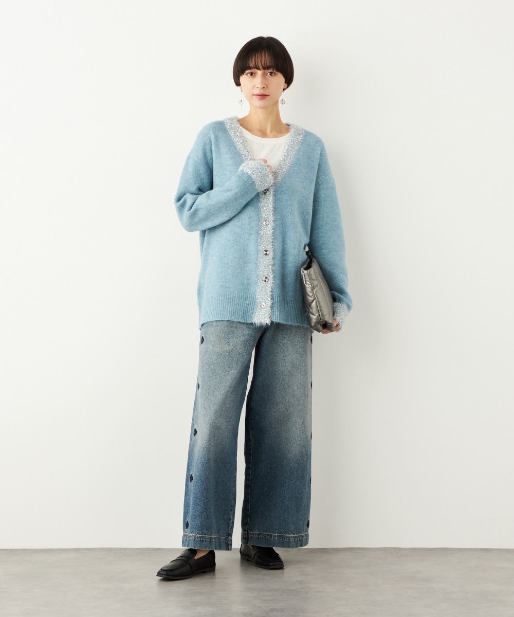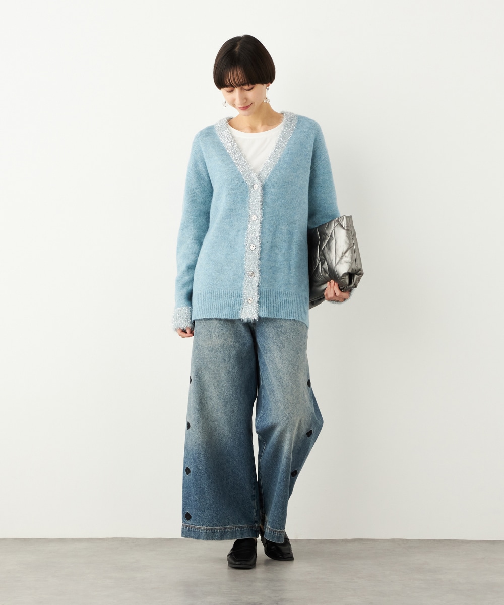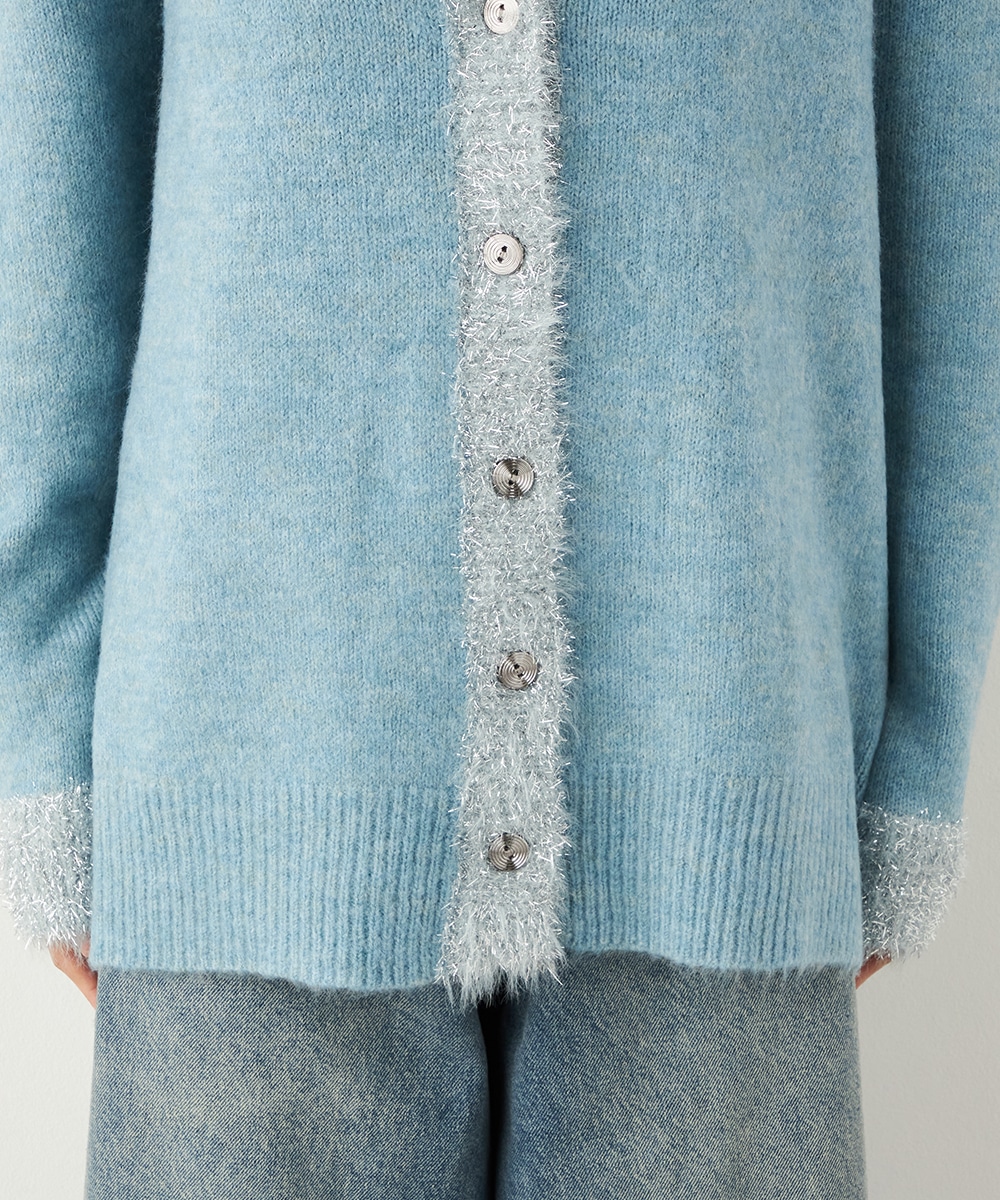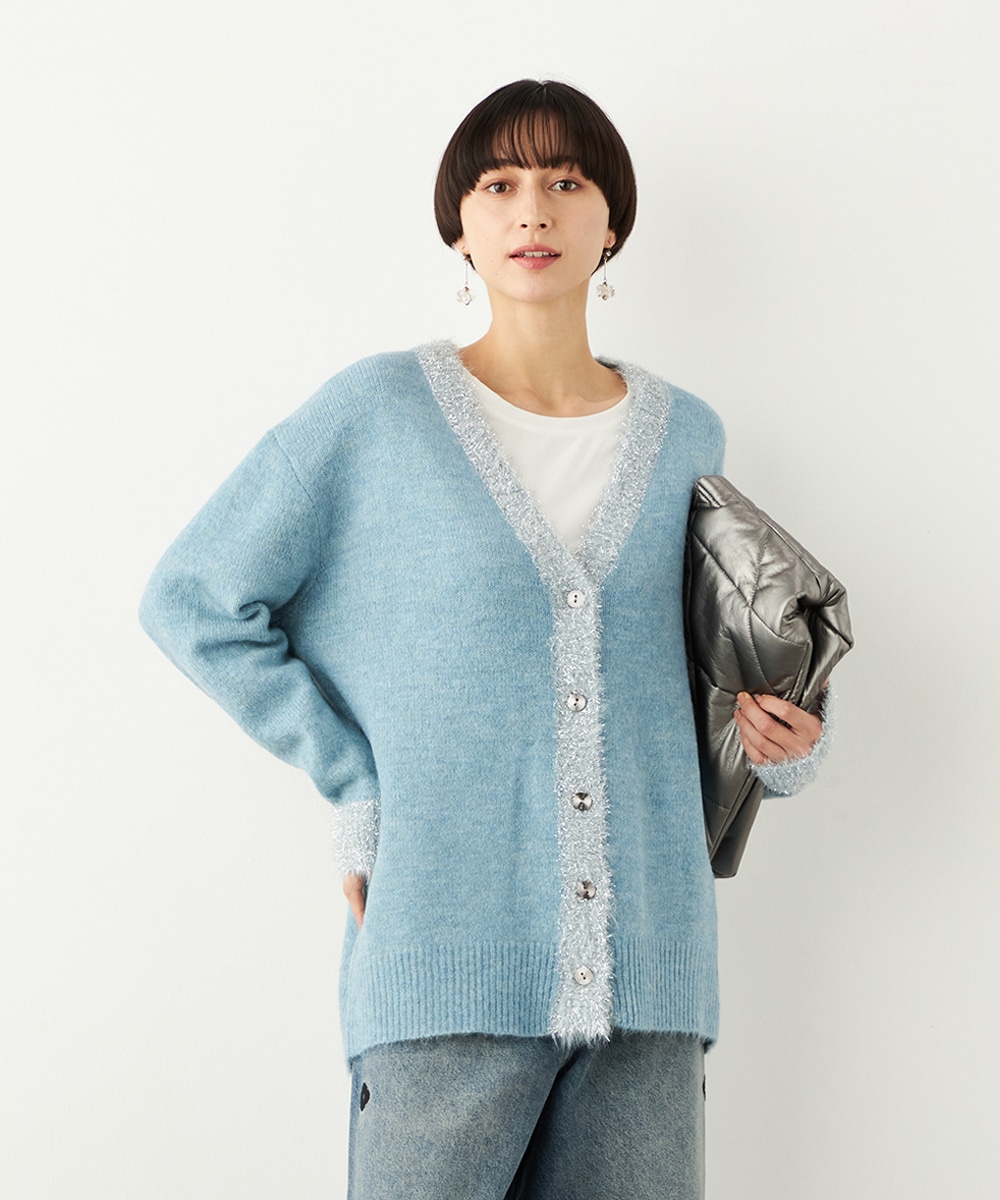 ベースはヘアリーな表情と、深みのある色合いが魅力の素材です。ネックから前立てと袖口には、ラメ入りでフェザー感のある糸を取り入れています。ドロップショルダーのゆったりとしたシルエットと長めの着丈がリラックス感のポイント。着こなしやすいスタンダードなVネックのデザインです。