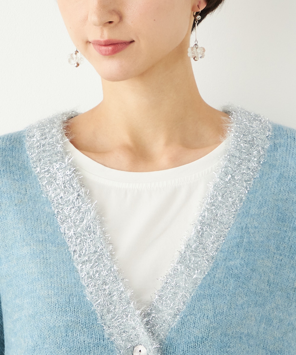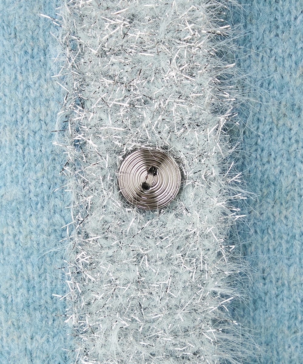 - 本体/アクリル74%, ポリエステル22%, ポリウレタン4%, 襟・袖口部分/フェザー糸 ナイロン100%, ラメ糸 ポリエステル100%