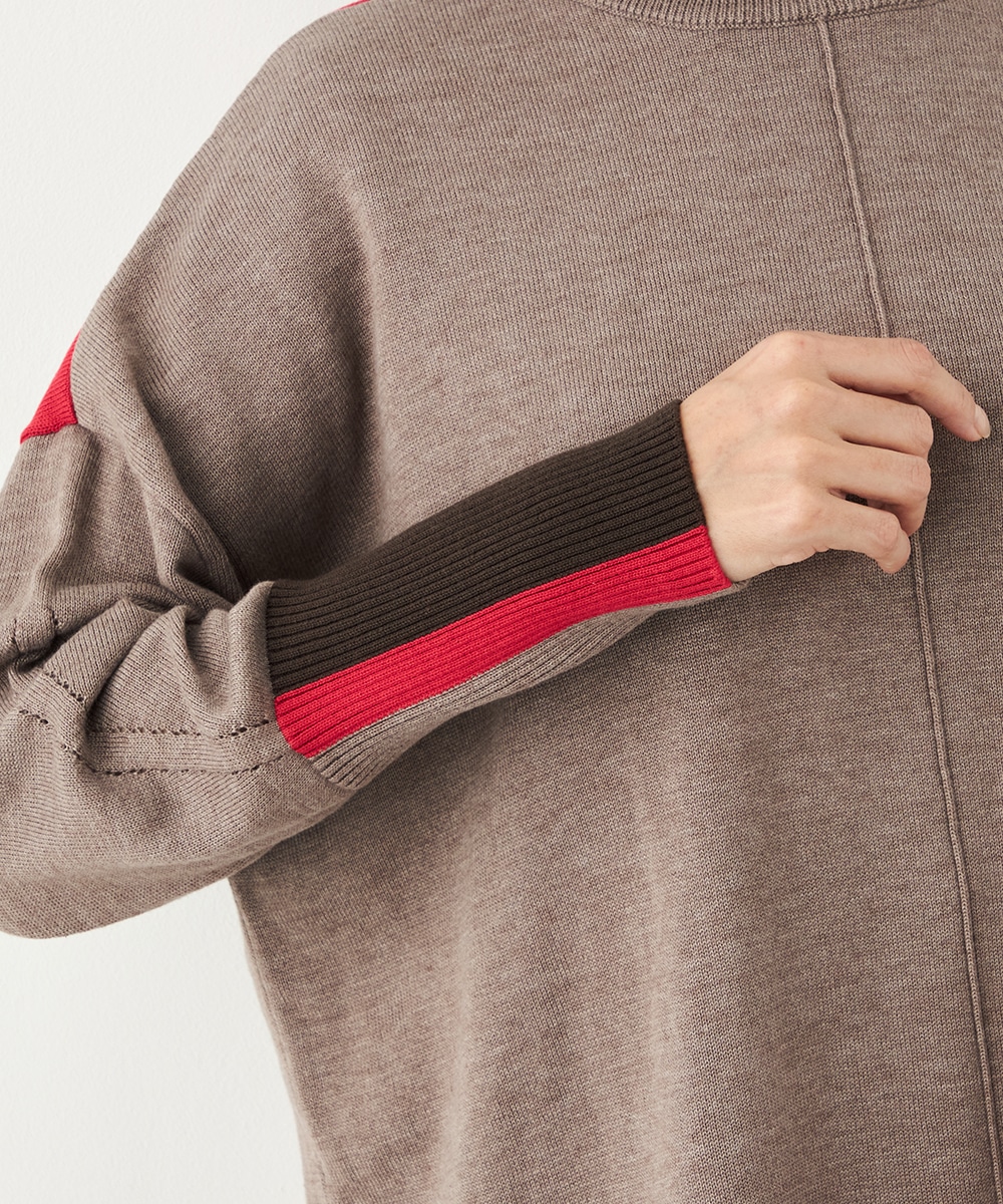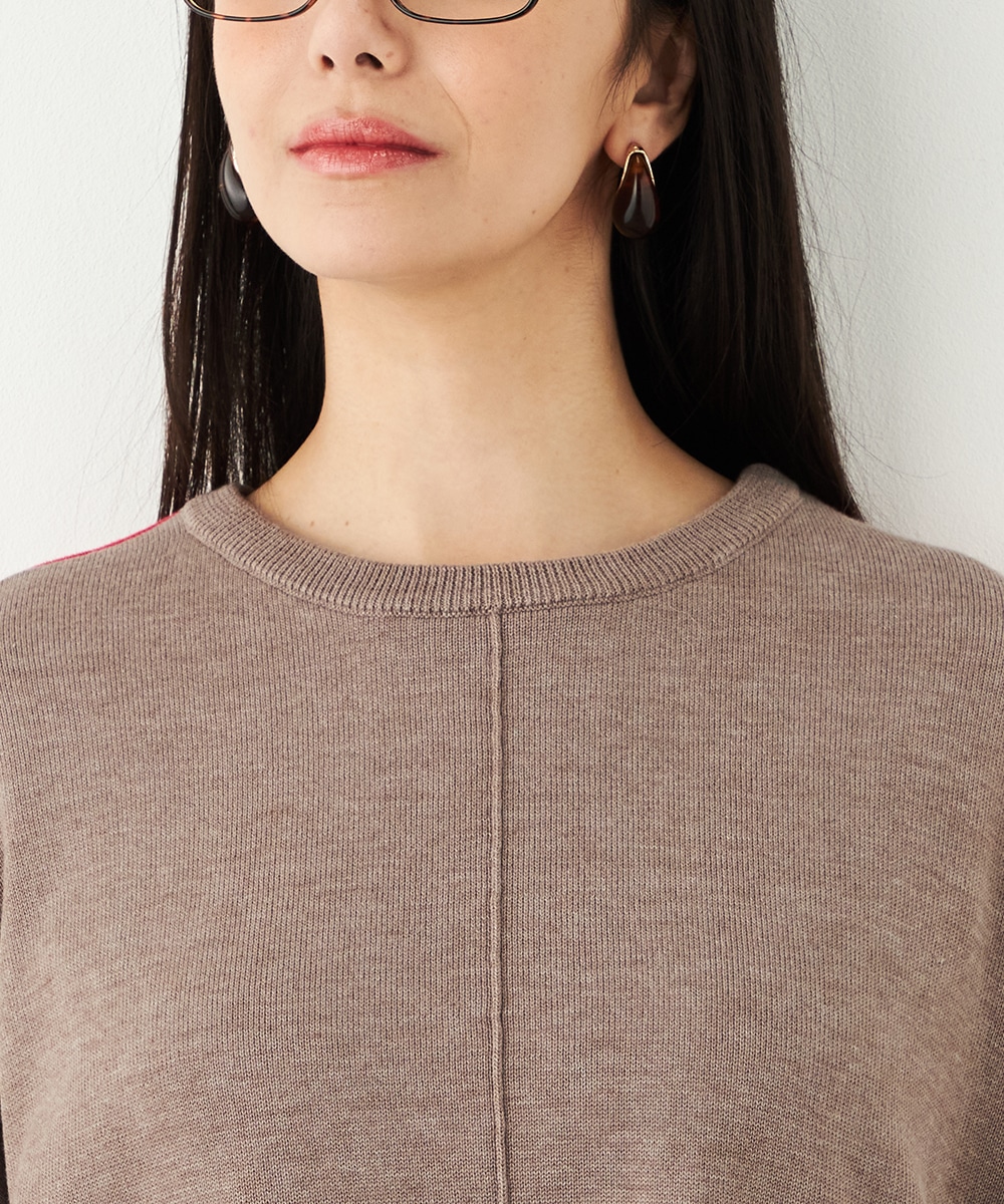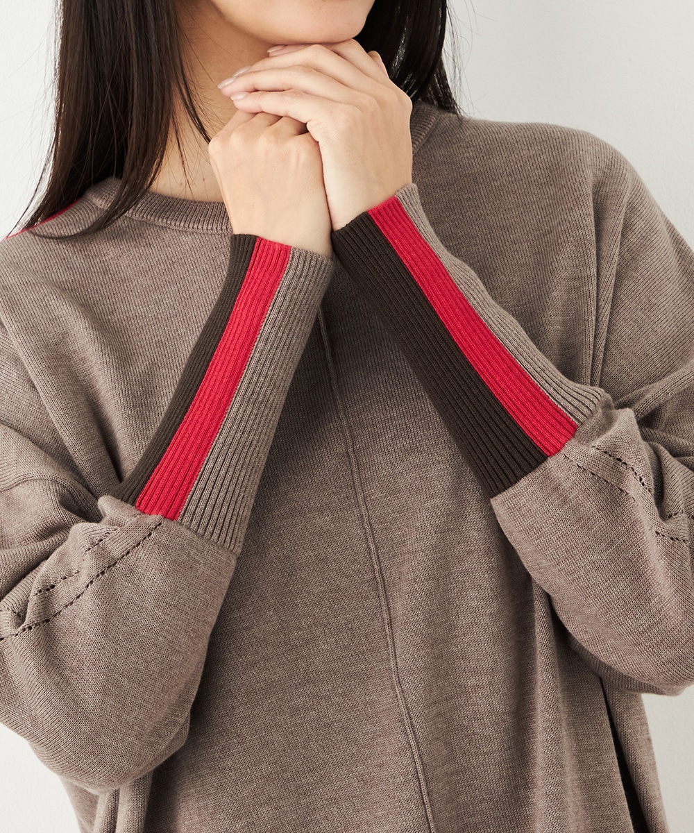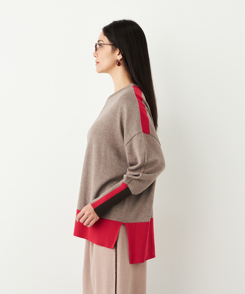 ベーシックカラーをベースに、部分的にアクセントカラーを取り入れています。存在感がありながらも主張しすぎず、品良く着こなせるデザインです。袖口のリブは長めにしたことで、手首の細さが強調されて女性らしさが際立ちます。着丈の前後差やサイドスリットもこだわりのポイントです。