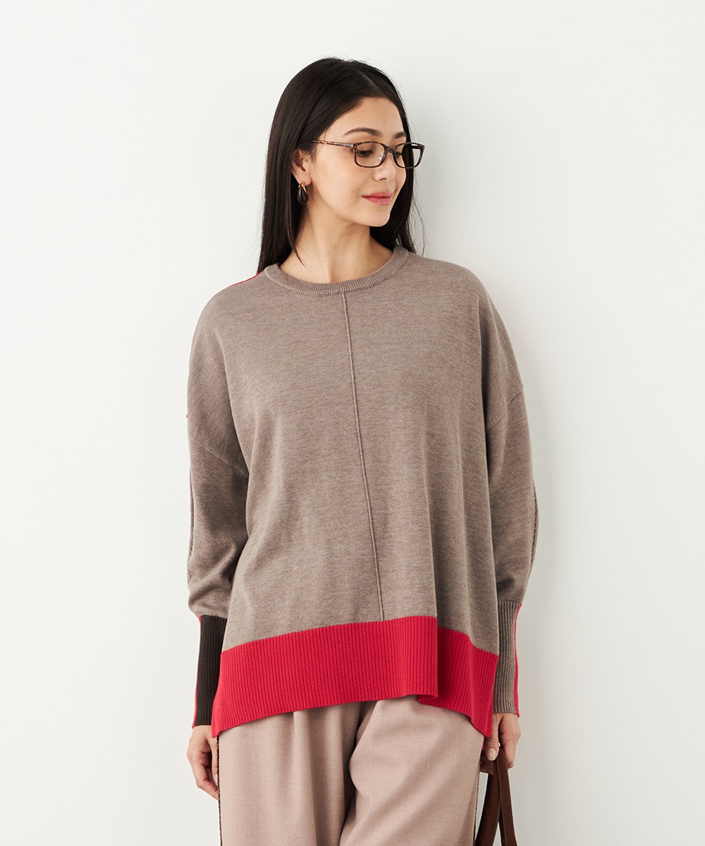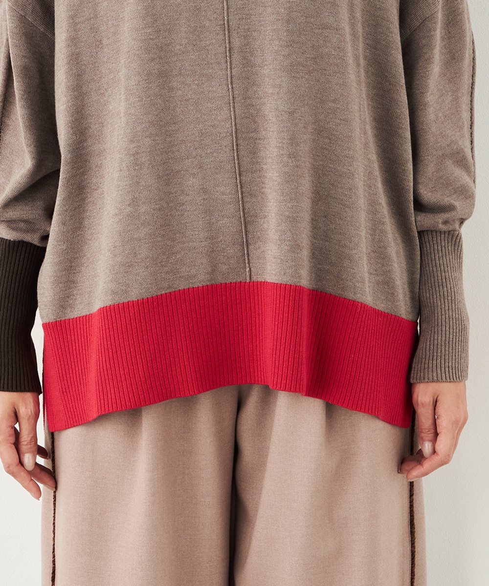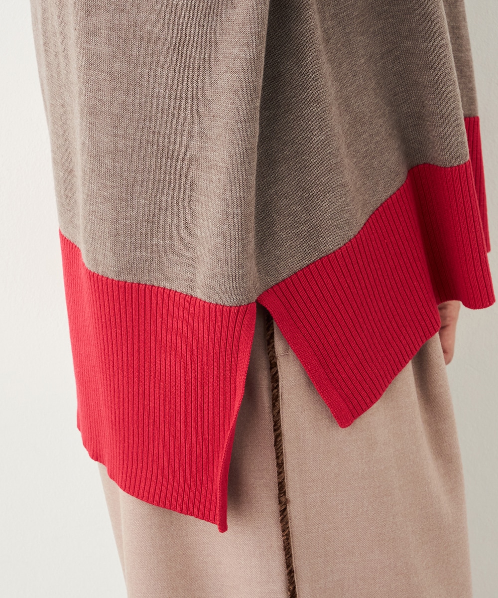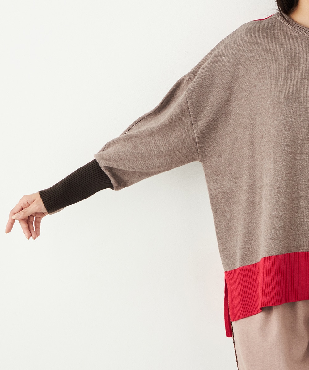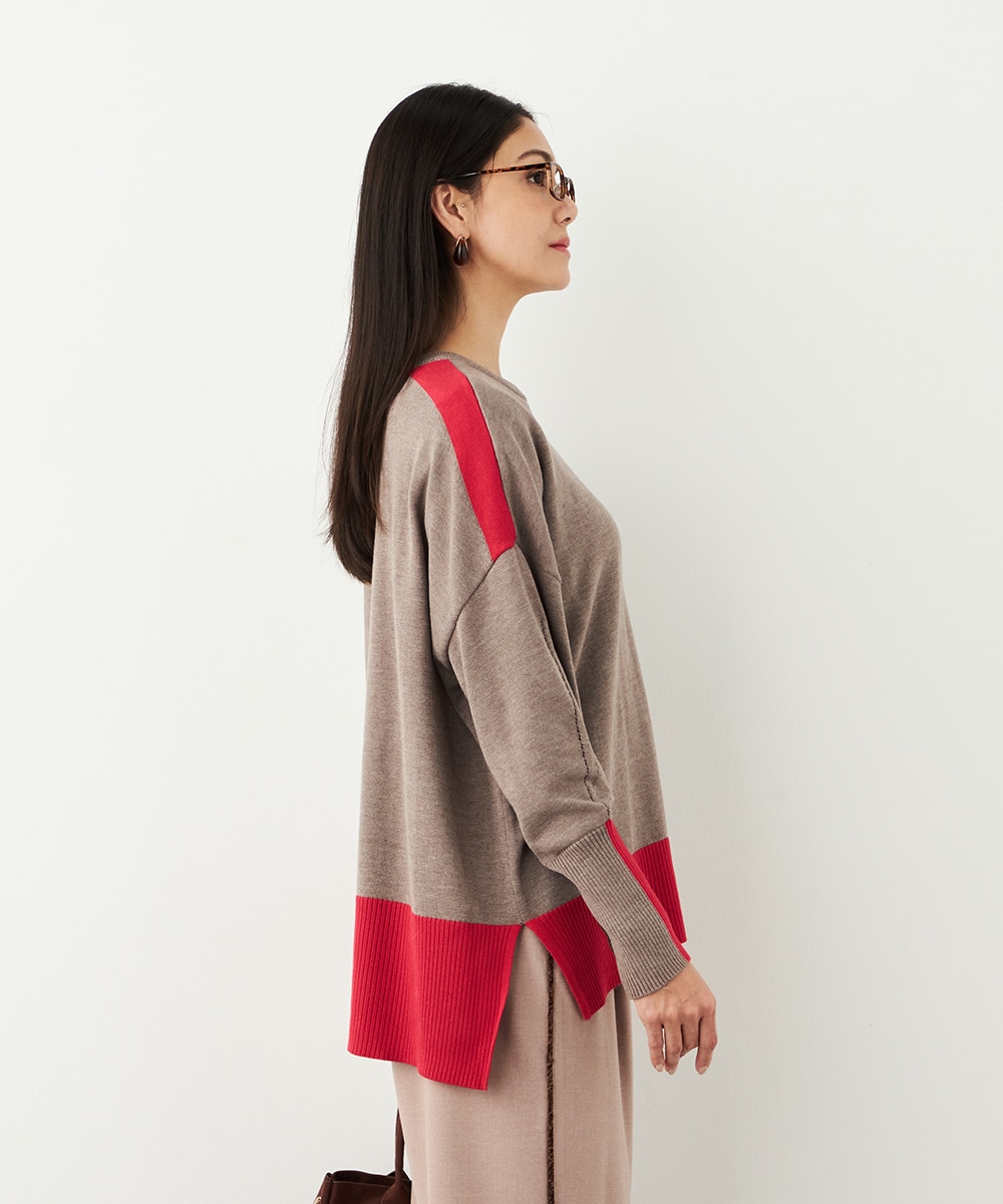 ベーシックカラーをベースに、部分的にアクセントカラーを取り入れています。存在感がありながらも主張しすぎず、品良く着こなせるデザインです。袖口のリブは長めにしたことで、手首の細さが強調されて女性らしさが際立ちます。着丈の前後差やサイドスリットもこだわりのポイントです。
