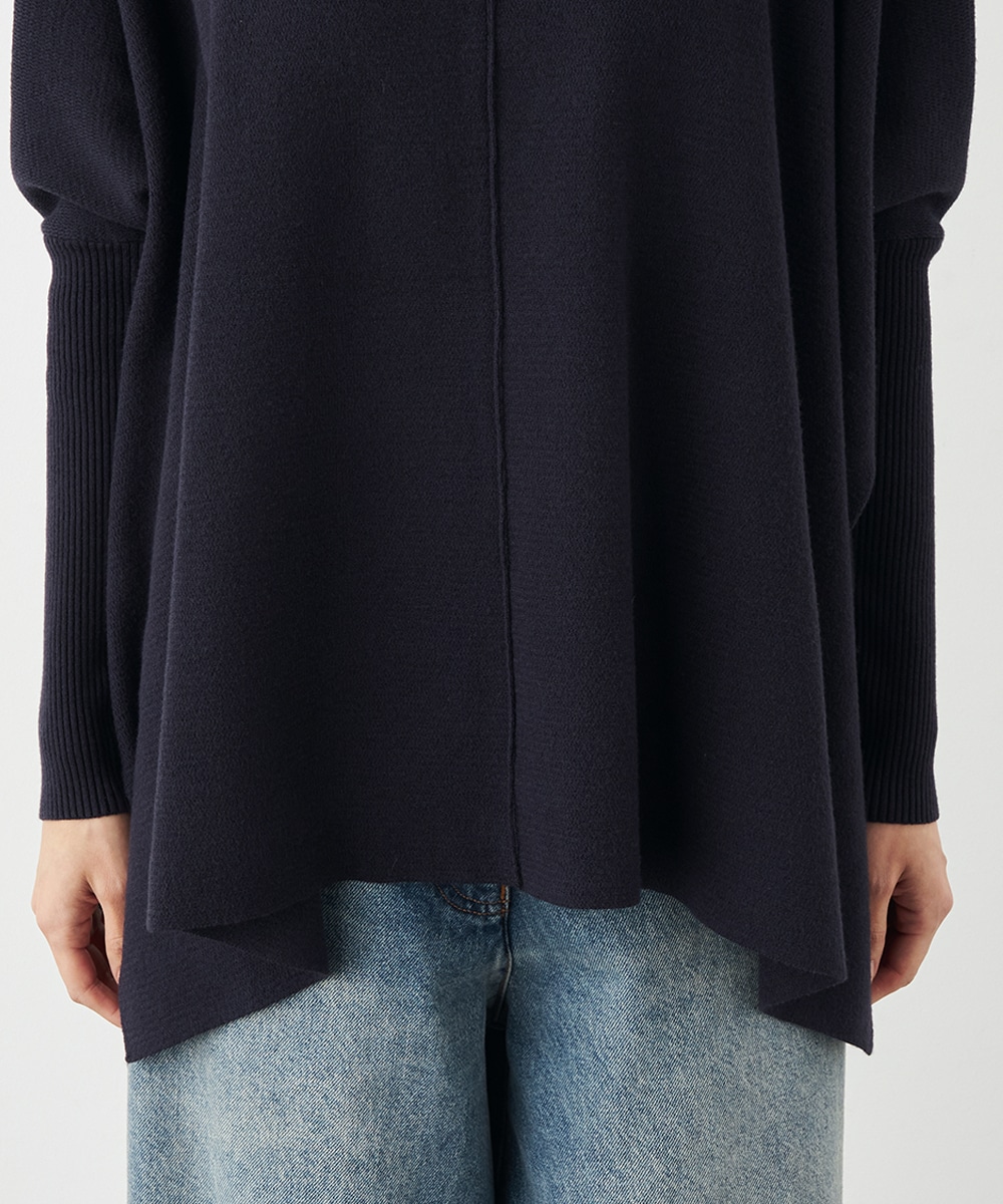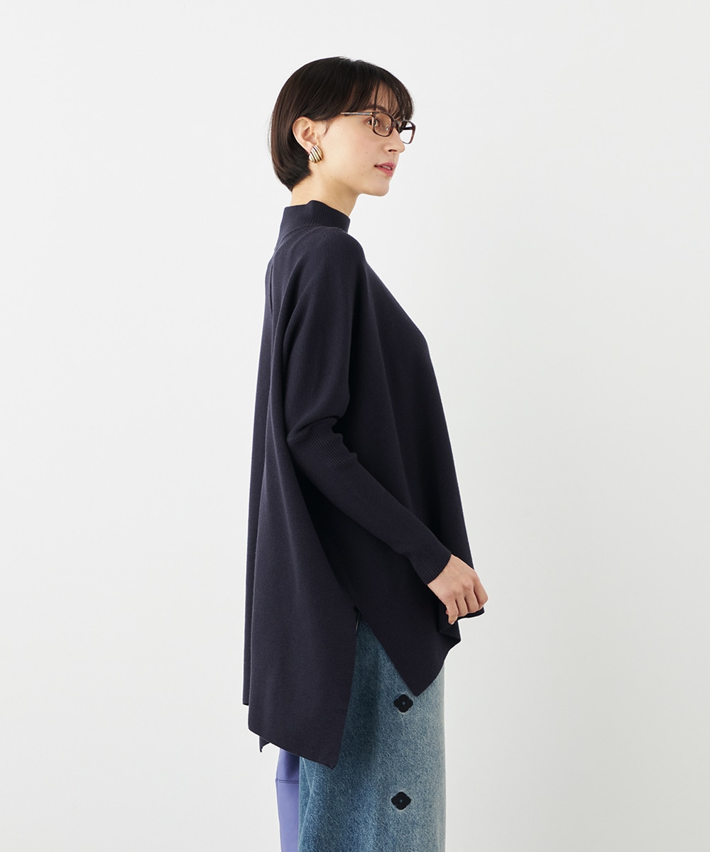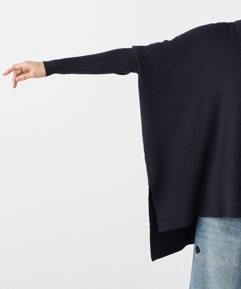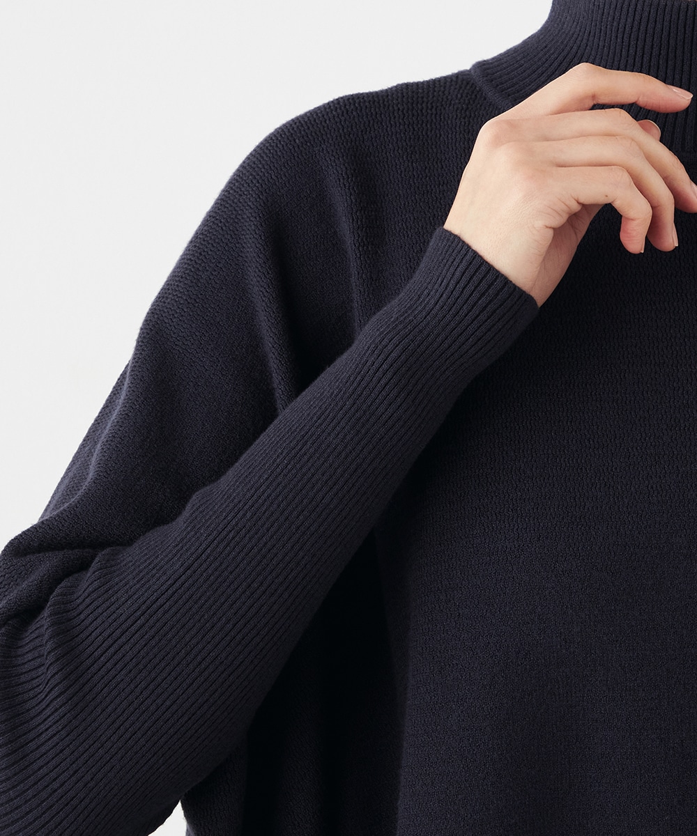 袖のリブを長めにしたことにより、すっきりと着こなせてコートのインに合わせやすいのもポイントです。ソフトな編み地で動いた際の揺れ感がきれいに現れて、エレガントに着こなせます。顔映りの良いレッドと大人っぽくシックなネイビーのカラー。ボトムスはパンツを選ぶのがおすすめです。