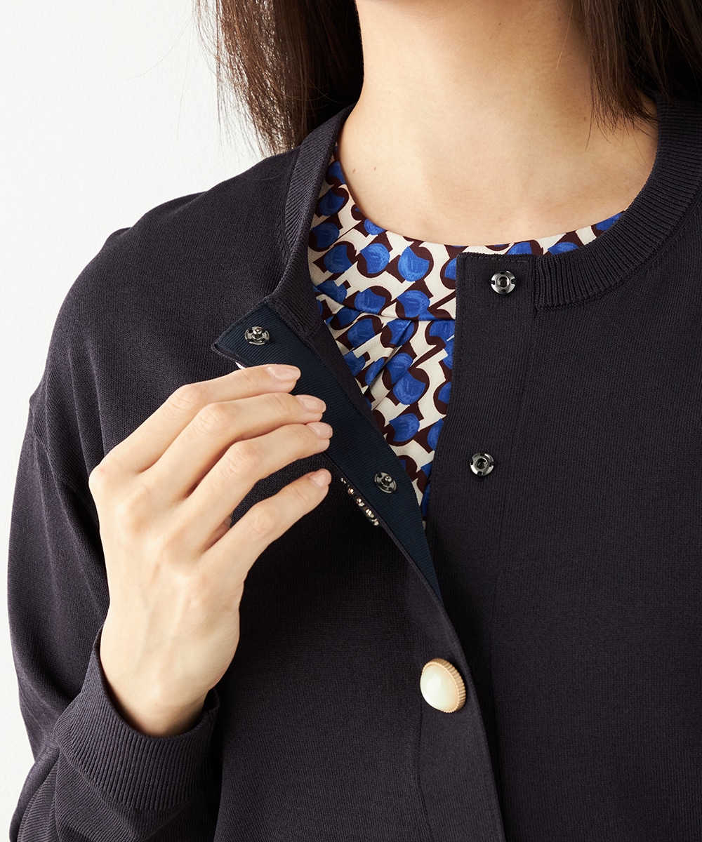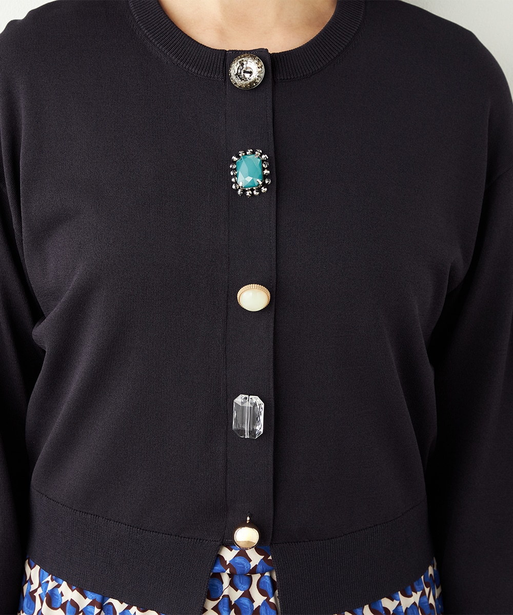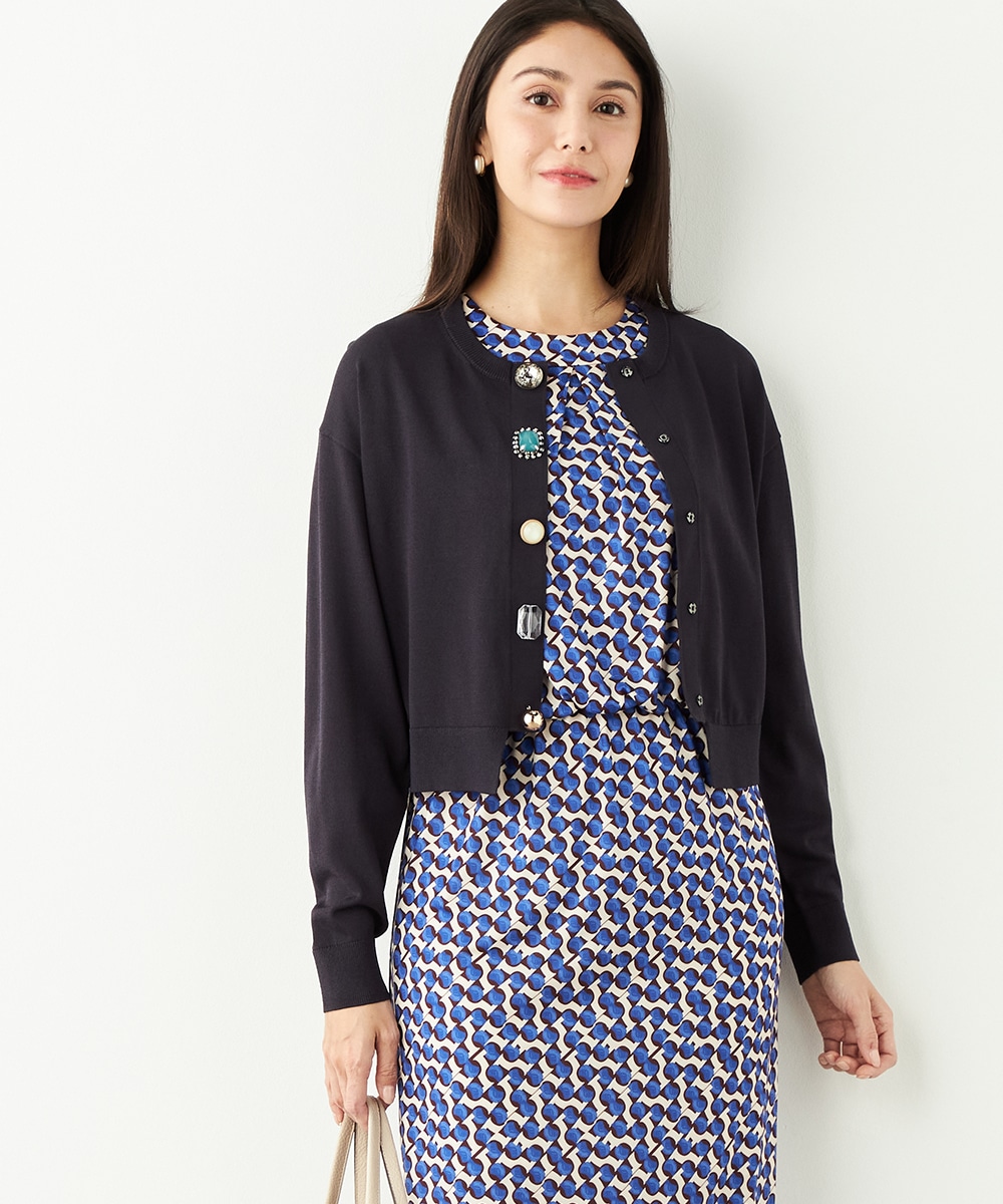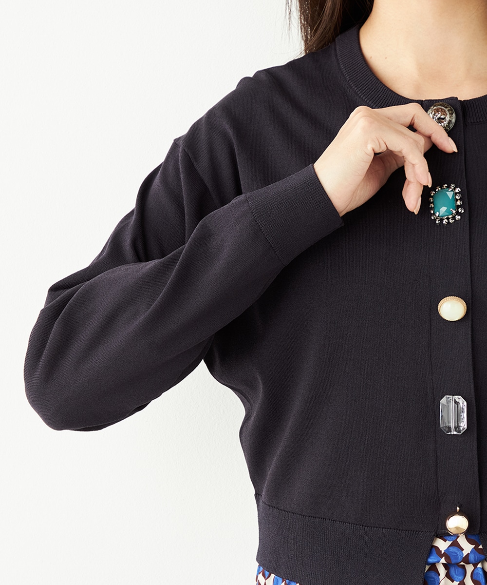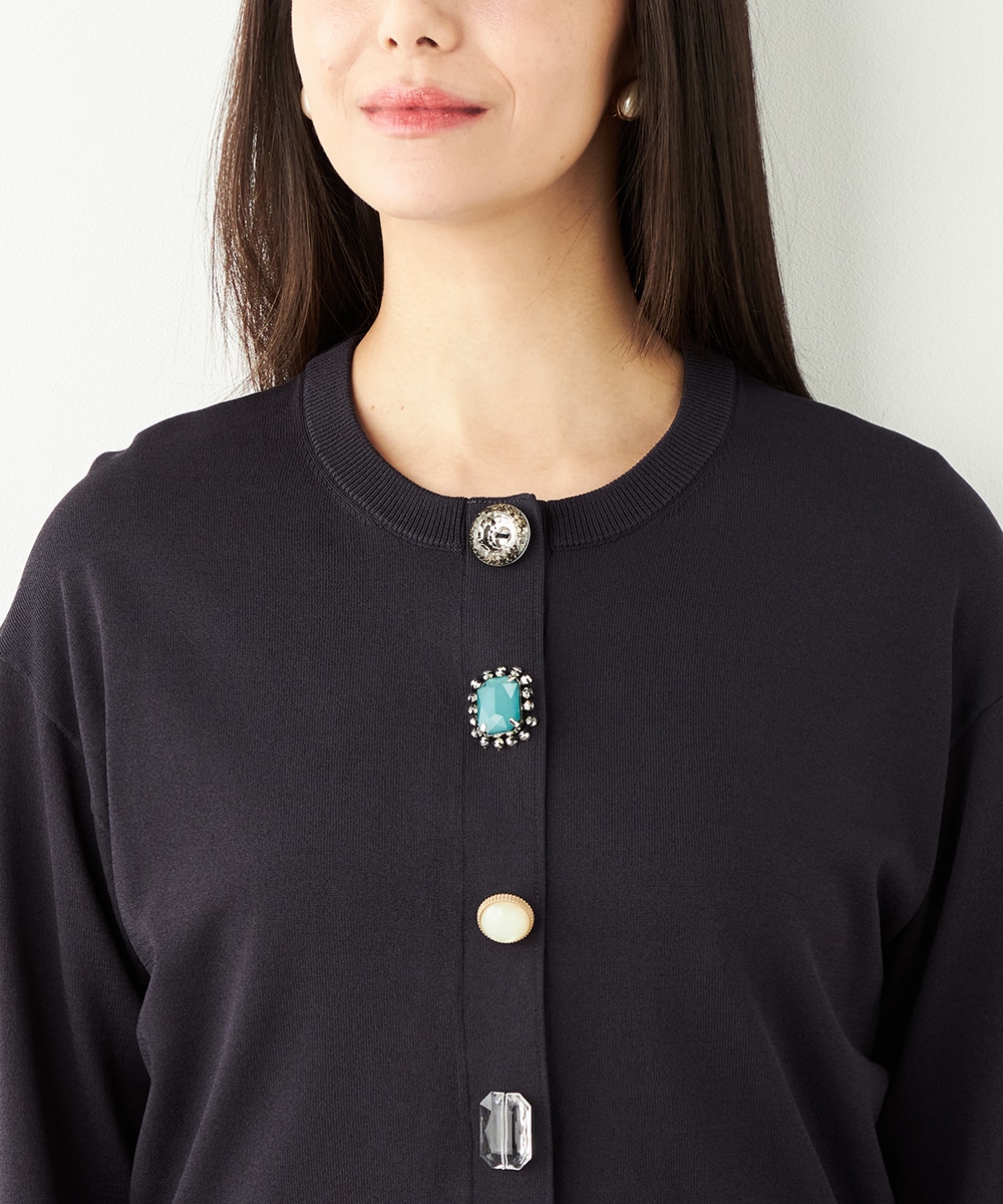 フロントに大ぶりのビジューボタンが並び、華やかさを印象付けます。女性らしく優しい雰囲気があるラウンドネックのデザインです。少し短めの丈感ですっきりと着こなせ、合わせるボトムスを選びません。シルエットはゆったりとして、トレンド感がさりげなく加わっています。