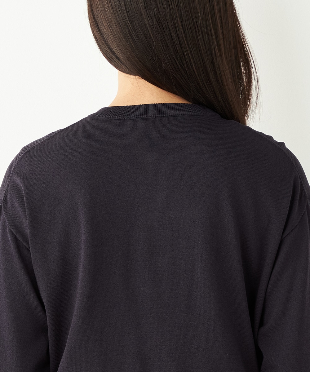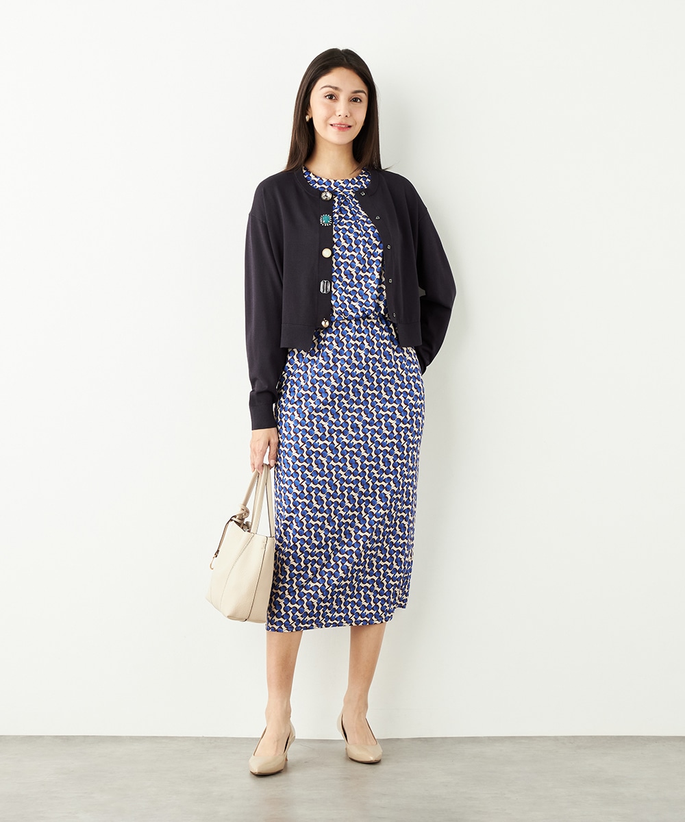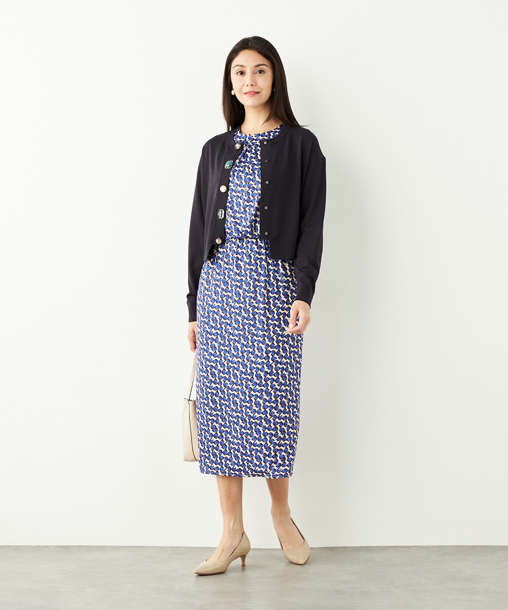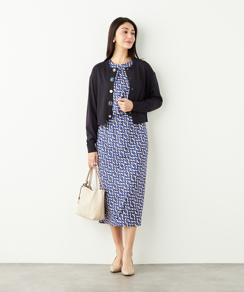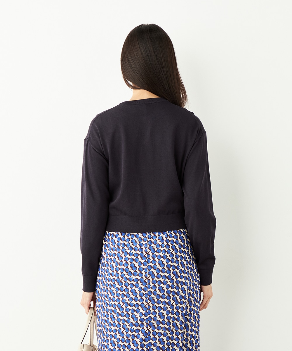 フロントに大ぶりのビジューボタンが並び、華やかさを印象付けます。女性らしく優しい雰囲気があるラウンドネックのデザインです。少し短めの丈感ですっきりと着こなせ、合わせるボトムスを選びません。シルエットはゆったりとして、トレンド感がさりげなく加わっています。