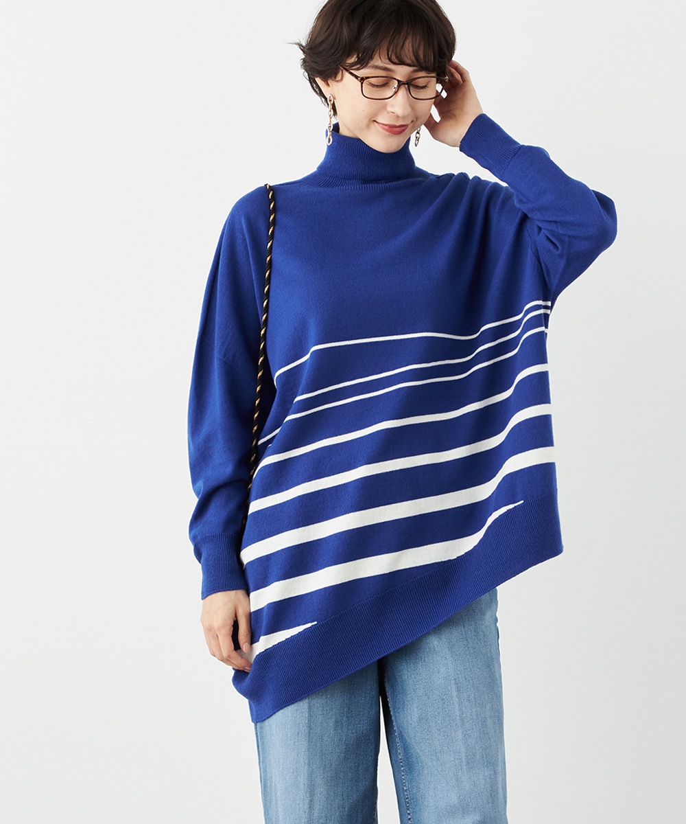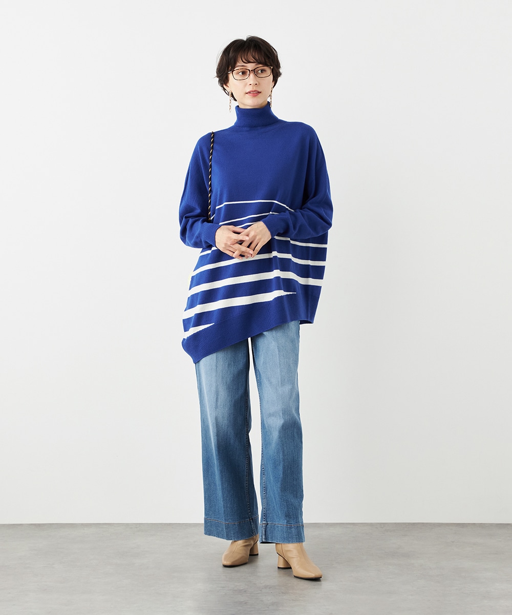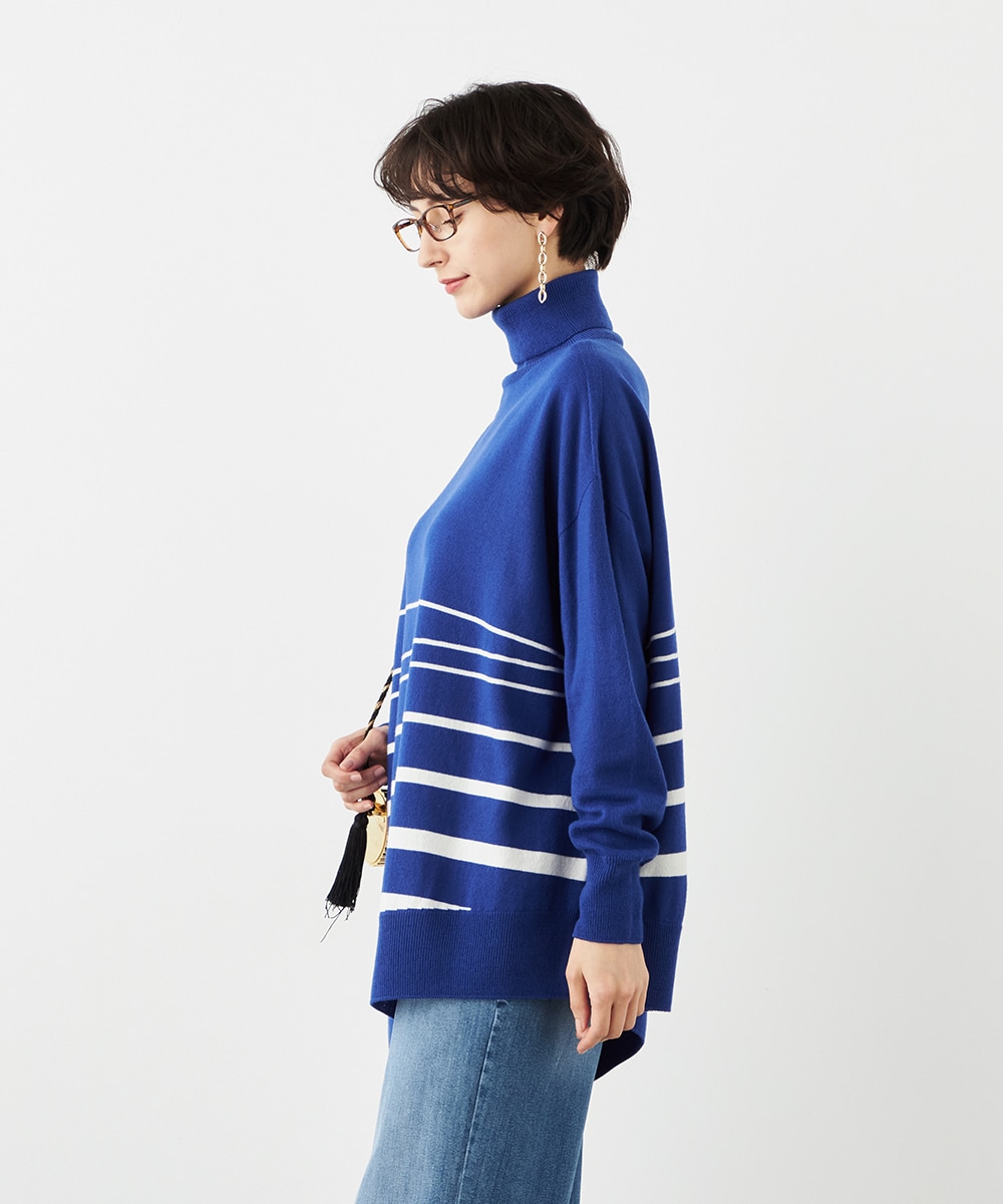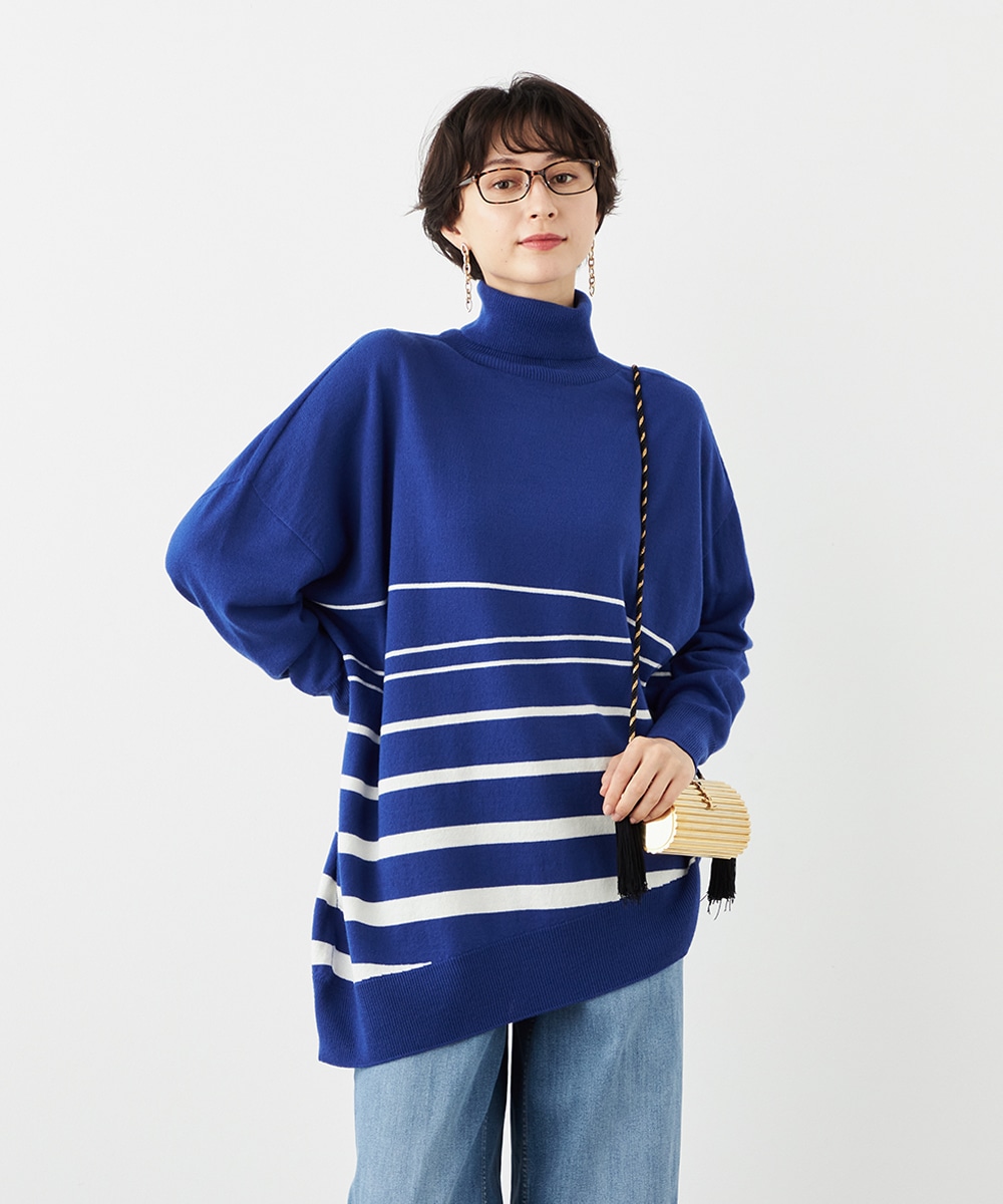 ビッグシルエットや部分的なボーダー、アシンメトリーなデザインなど、こだわりがたっぷりの1枚です。見た目も着心地も暖かなタートルネックを採用しており、秋冬シーズンらしいコーディネートを楽しめます。パンツはもちろん、タイトスカートと合わせるのもおすすめです。