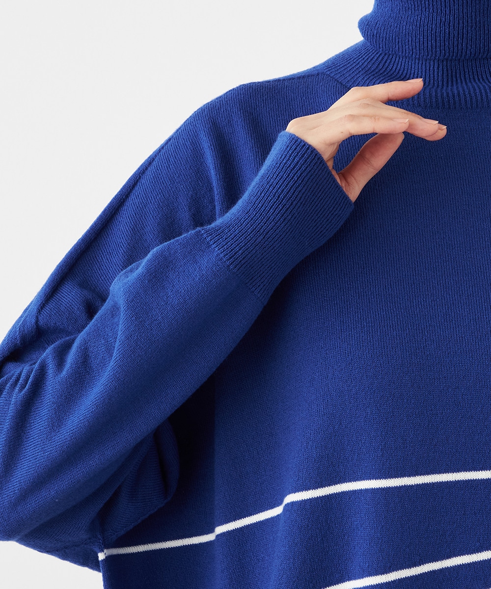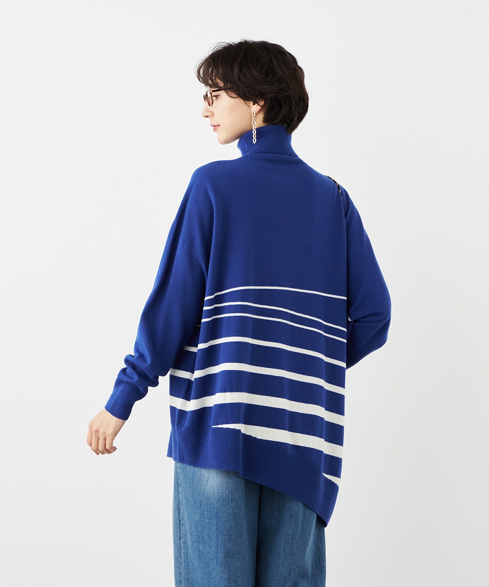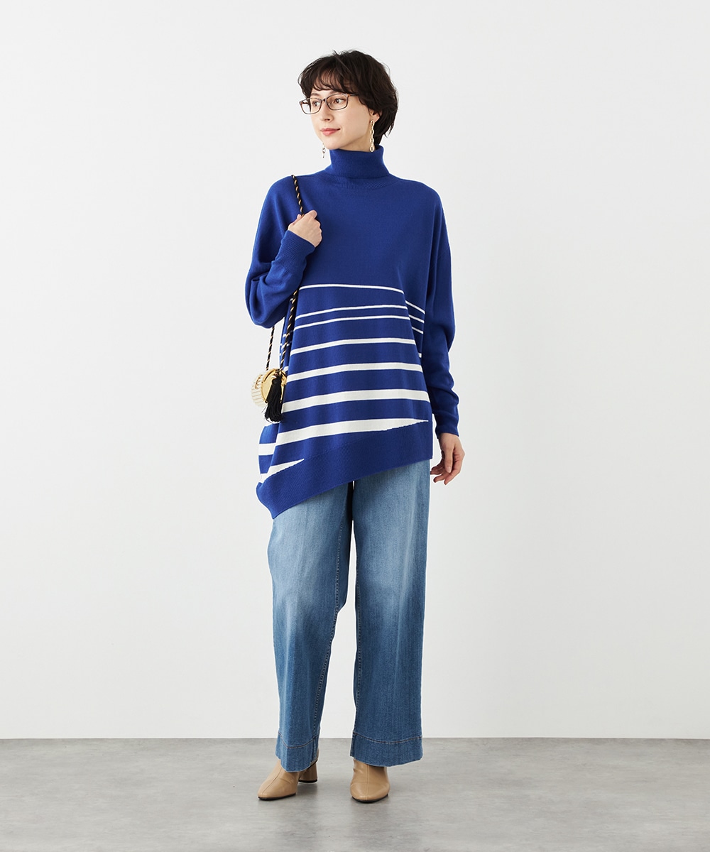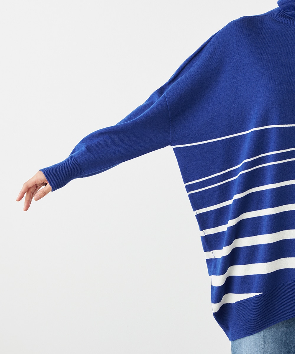 ビッグシルエットや部分的なボーダー、アシンメトリーなデザインなど、こだわりがたっぷりの1枚です。見た目も着心地も暖かなタートルネックを採用しており、秋冬シーズンらしいコーディネートを楽しめます。パンツはもちろん、タイトスカートと合わせるのもおすすめです。
