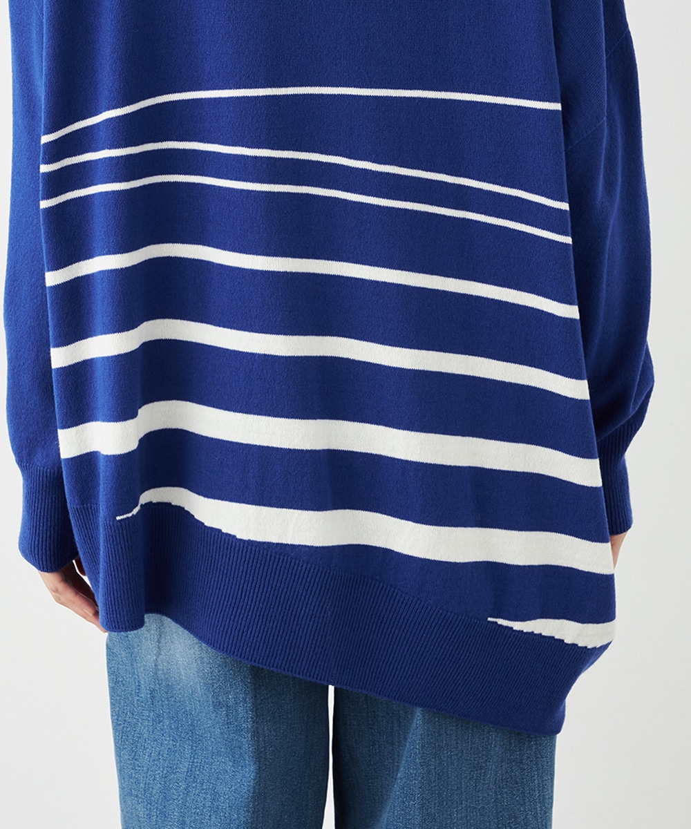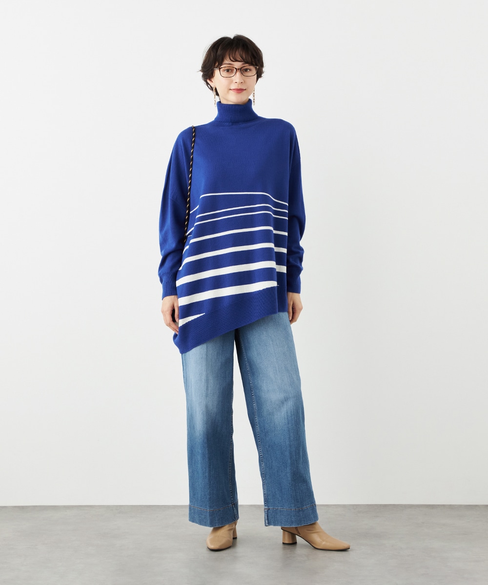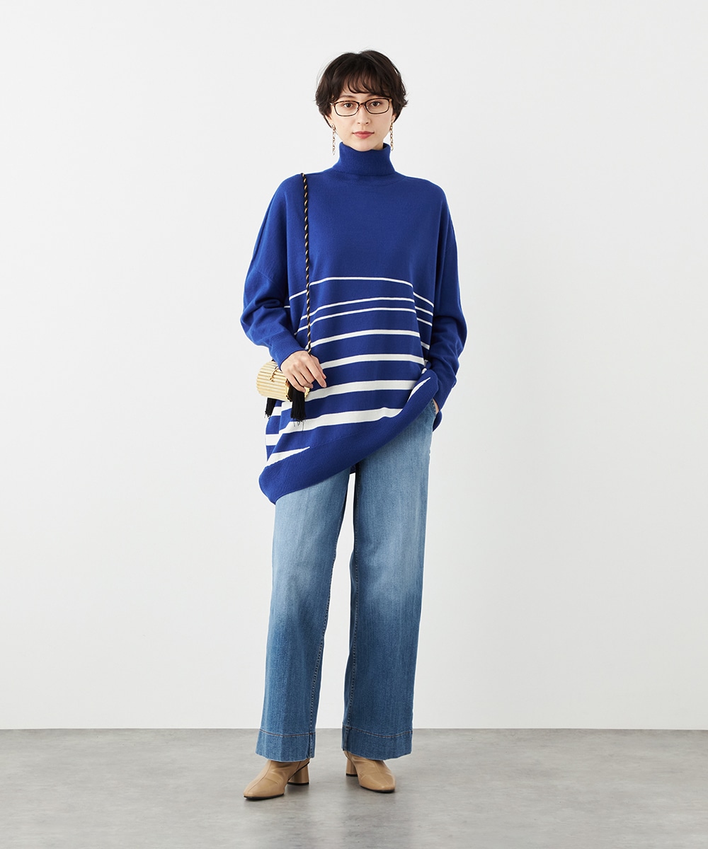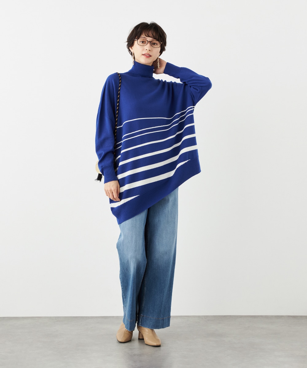 ビッグシルエットや部分的なボーダー、アシンメトリーなデザインなど、こだわりがたっぷりの1枚です。見た目も着心地も暖かなタートルネックを採用しており、秋冬シーズンらしいコーディネートを楽しめます。パンツはもちろん、タイトスカートと合わせるのもおすすめです。