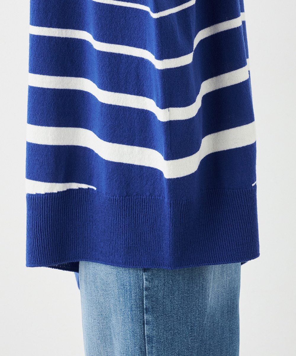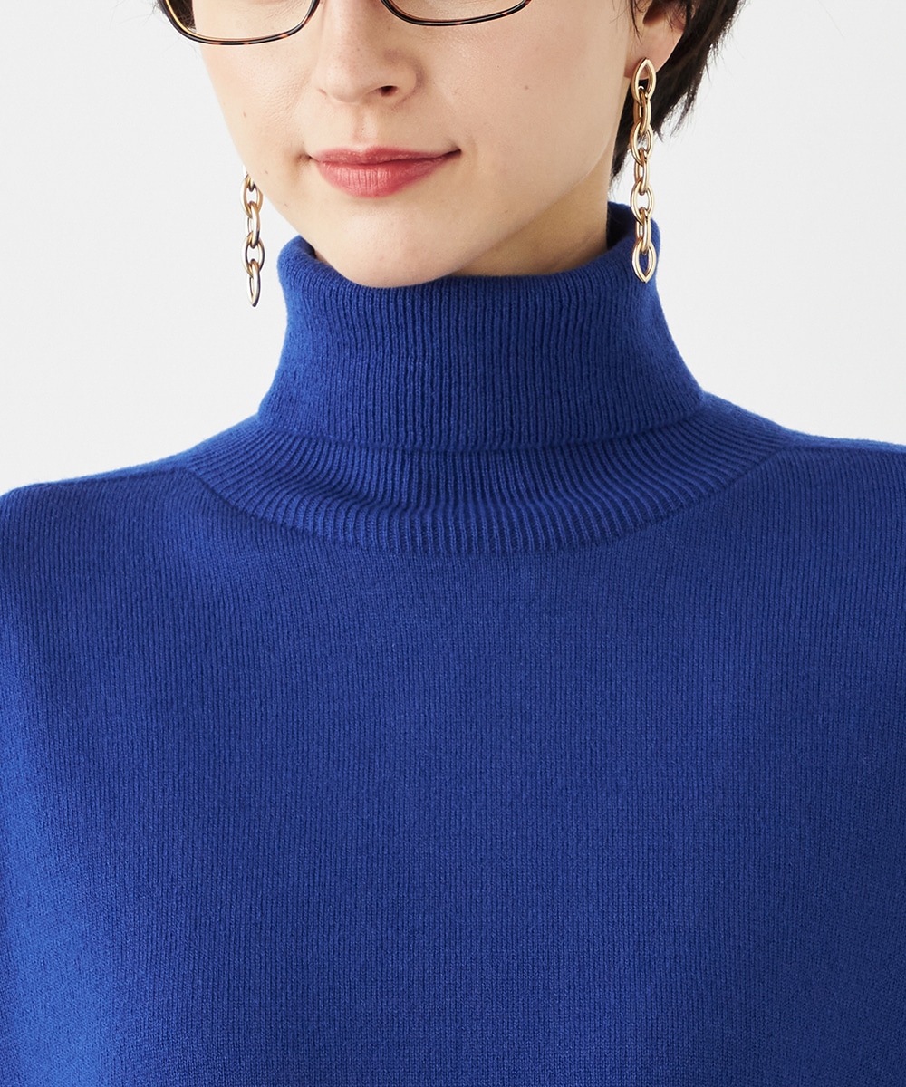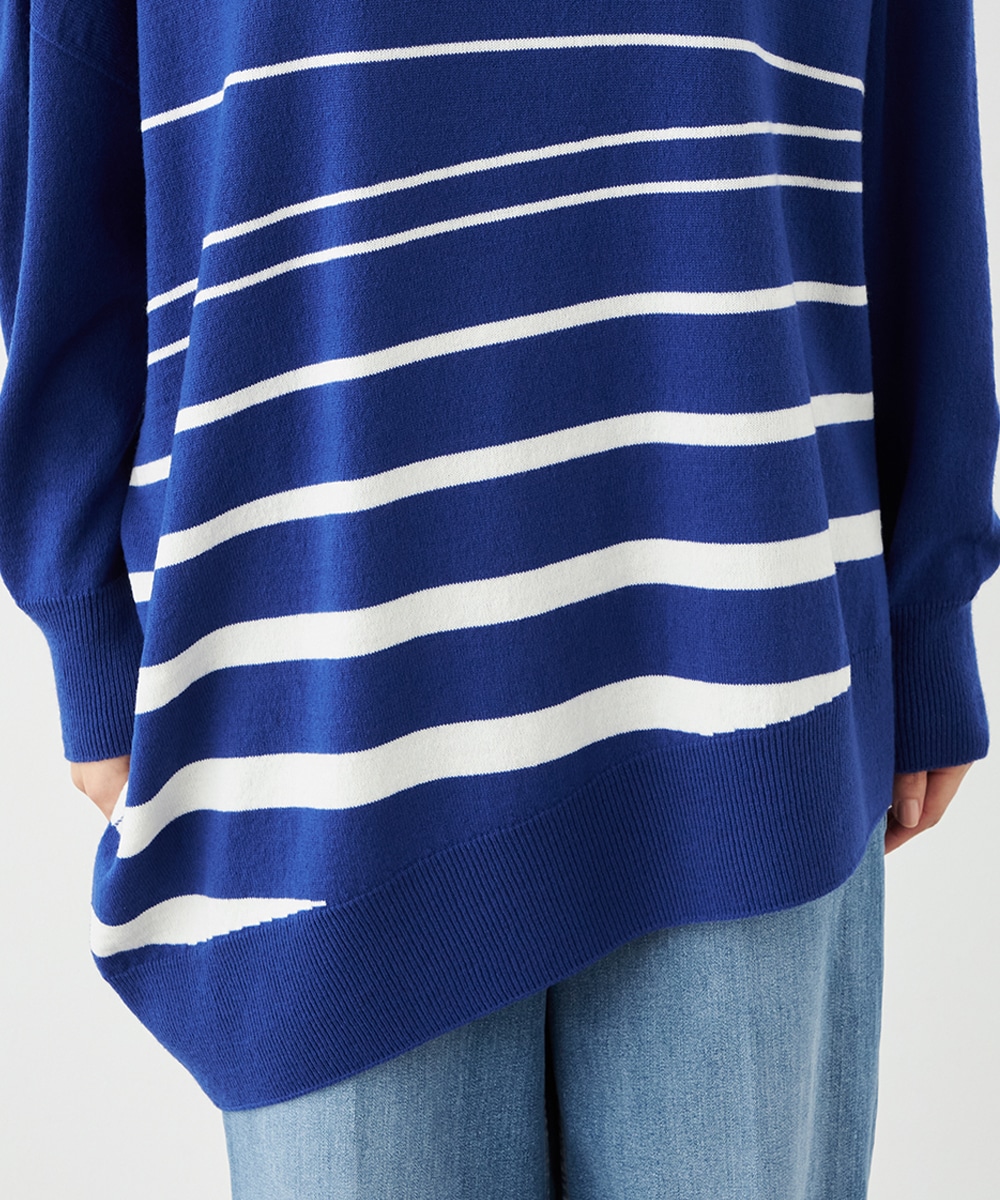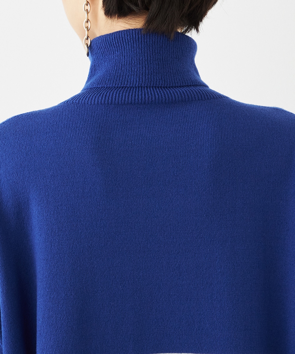 ビッグシルエットや部分的なボーダー、アシンメトリーなデザインなど、こだわりがたっぷりの1枚です。見た目も着心地も暖かなタートルネックを採用しており、秋冬シーズンらしいコーディネートを楽しめます。パンツはもちろん、タイトスカートと合わせるのもおすすめです。
