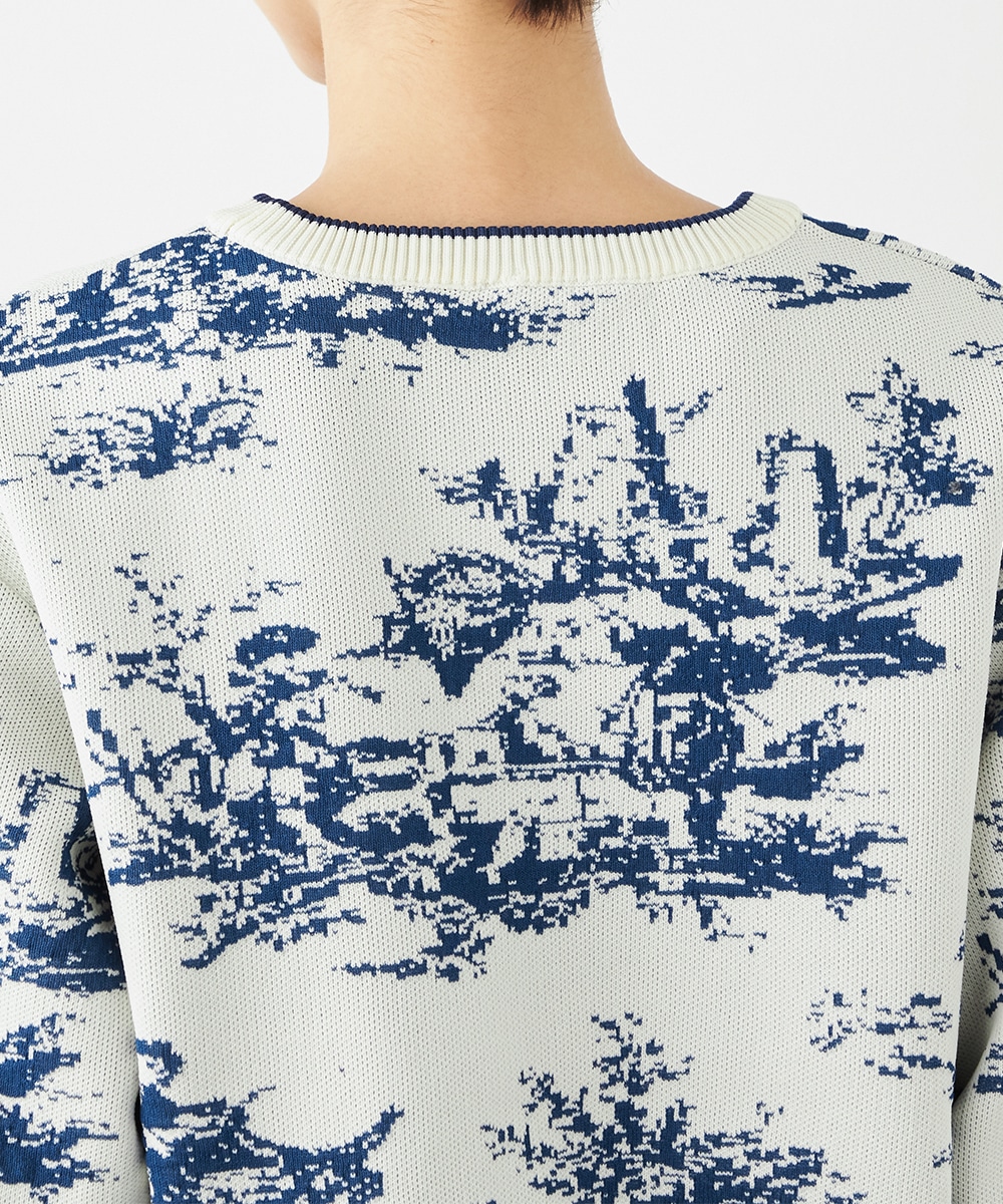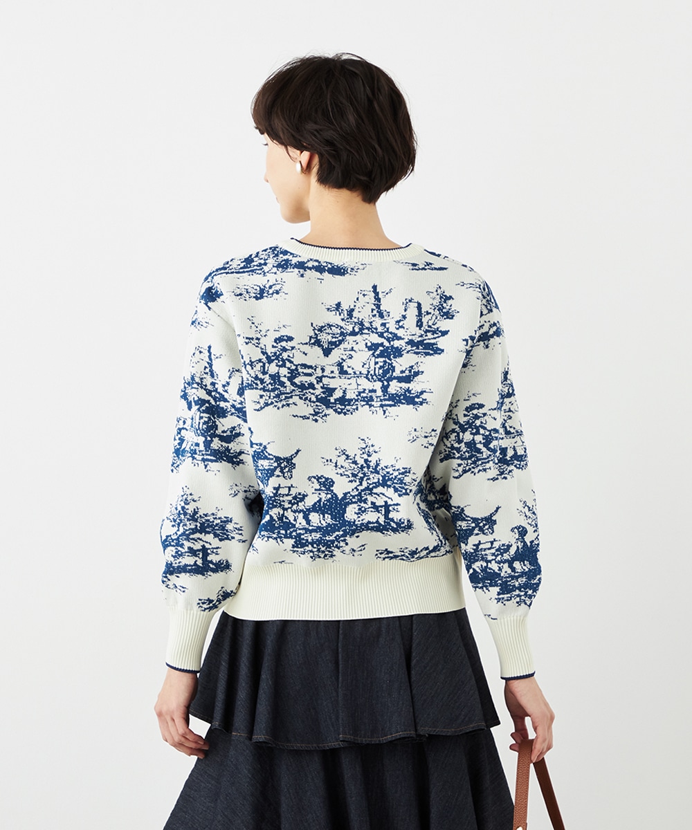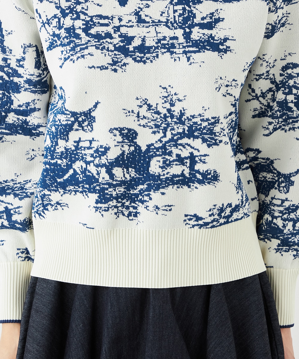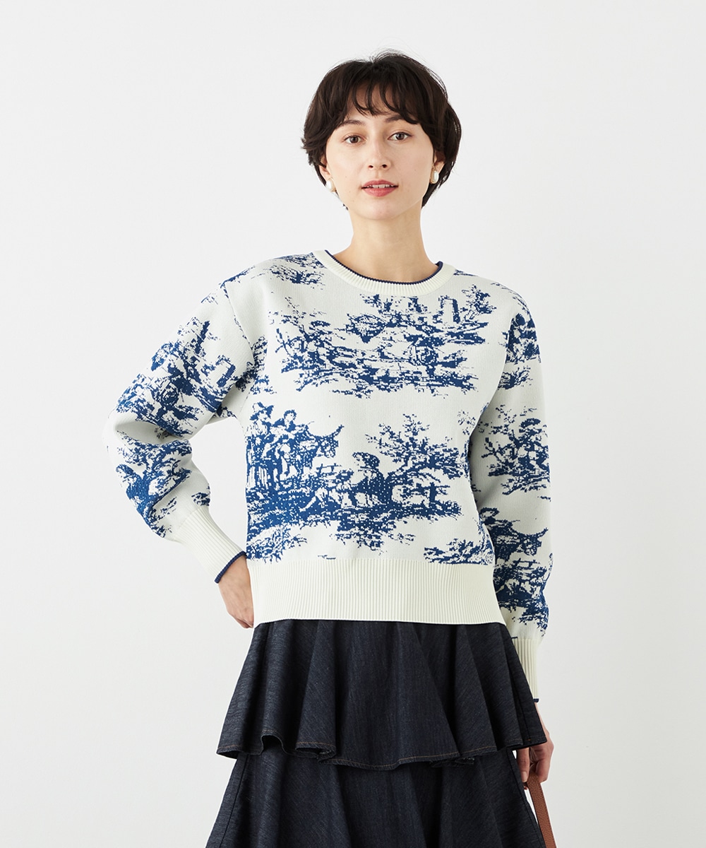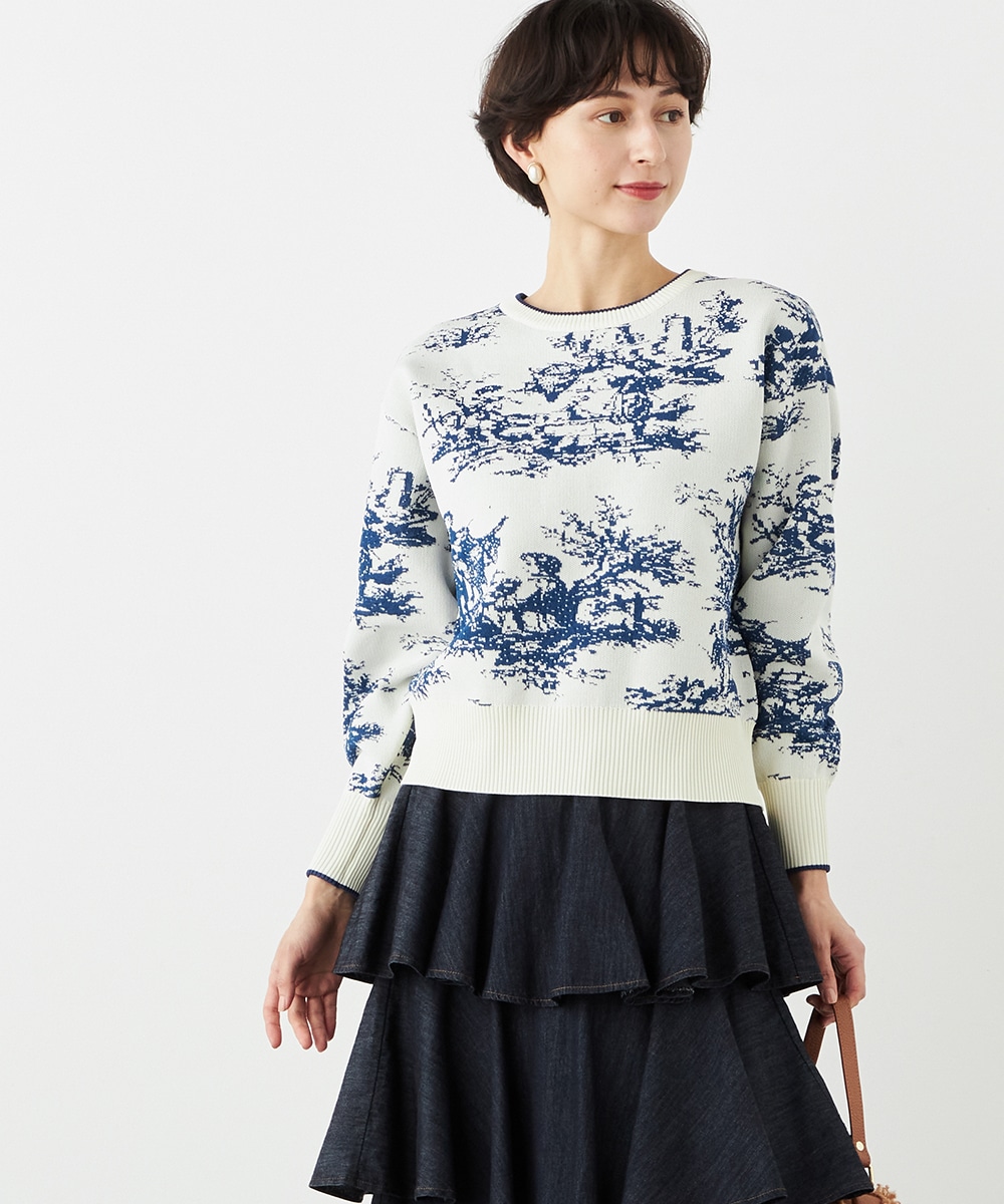 フランスの伝統的な雰囲気が漂うトワルドジュイ柄を丁寧に編み入れたプルオーバー。