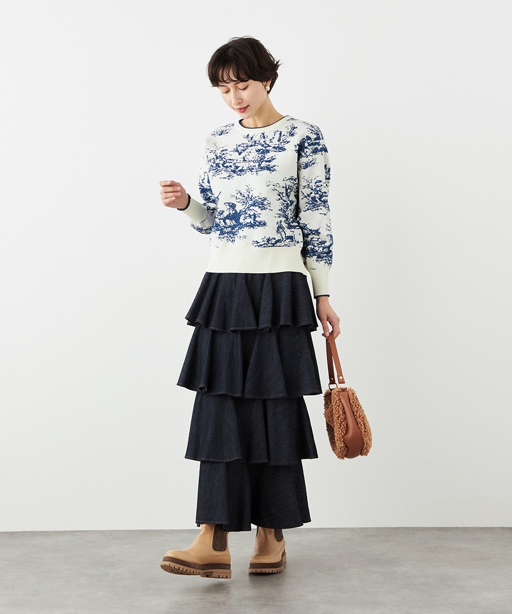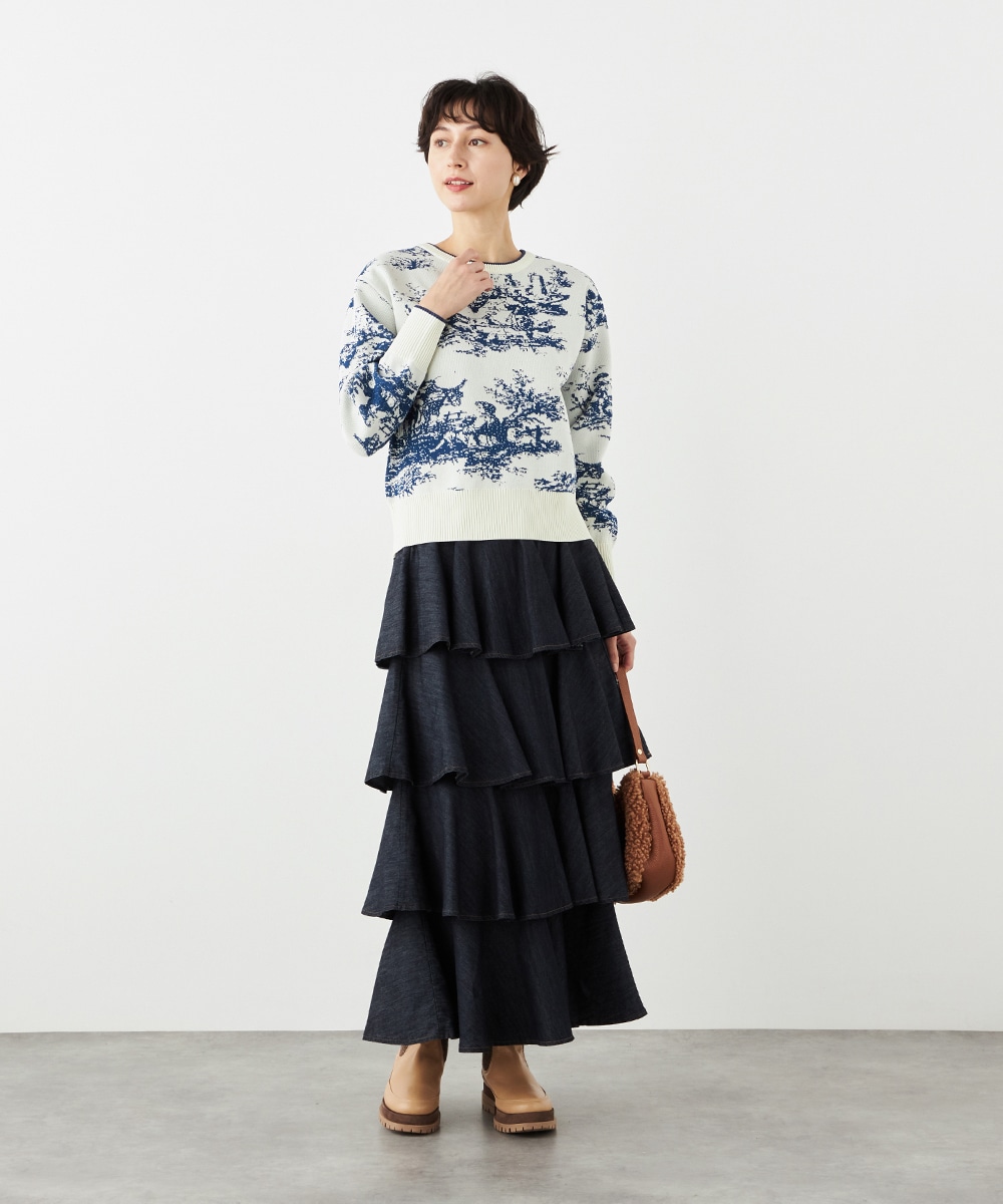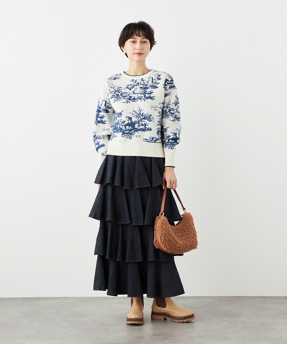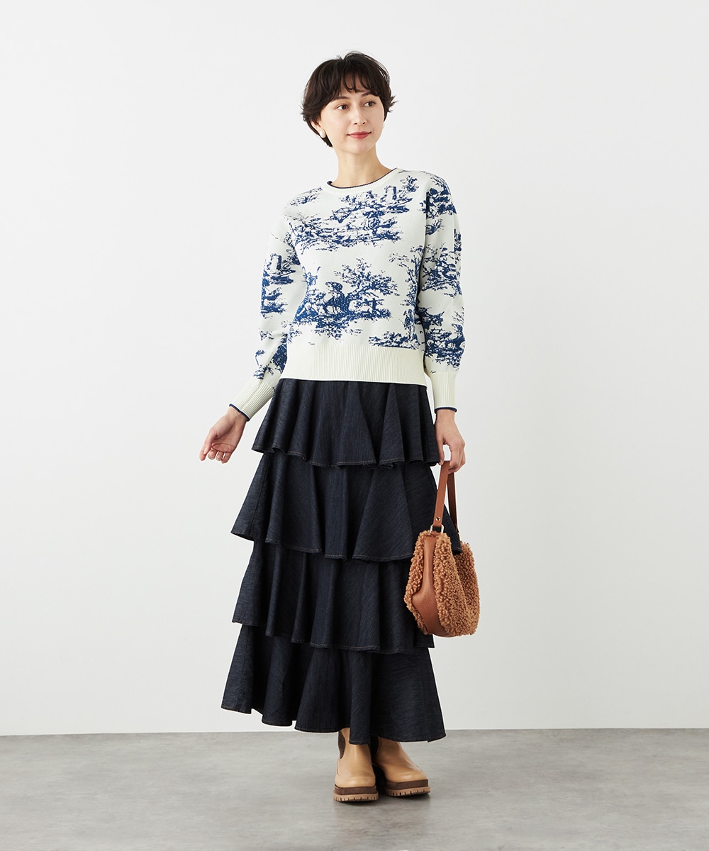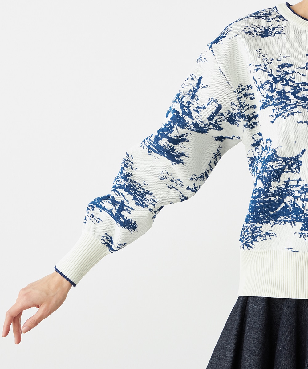 フランスの伝統的な雰囲気が漂うトワルドジュイ柄を丁寧に編み入れたプルオーバー。