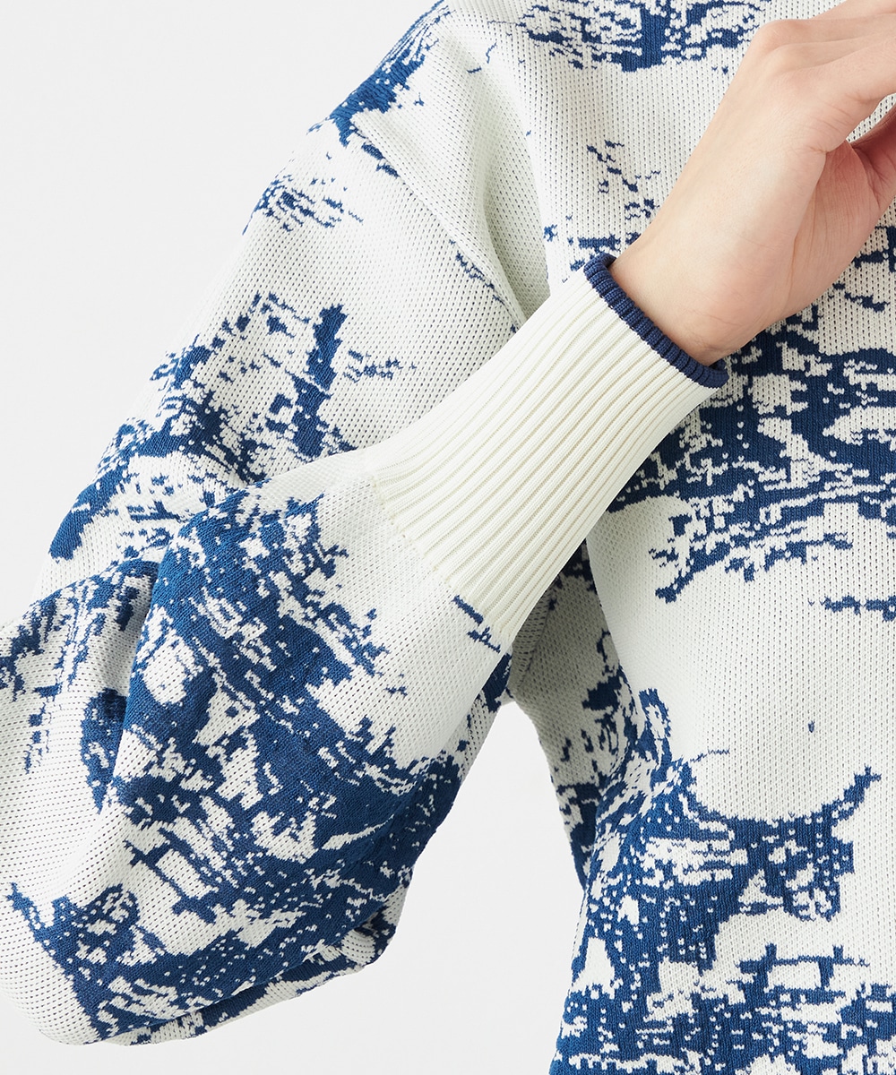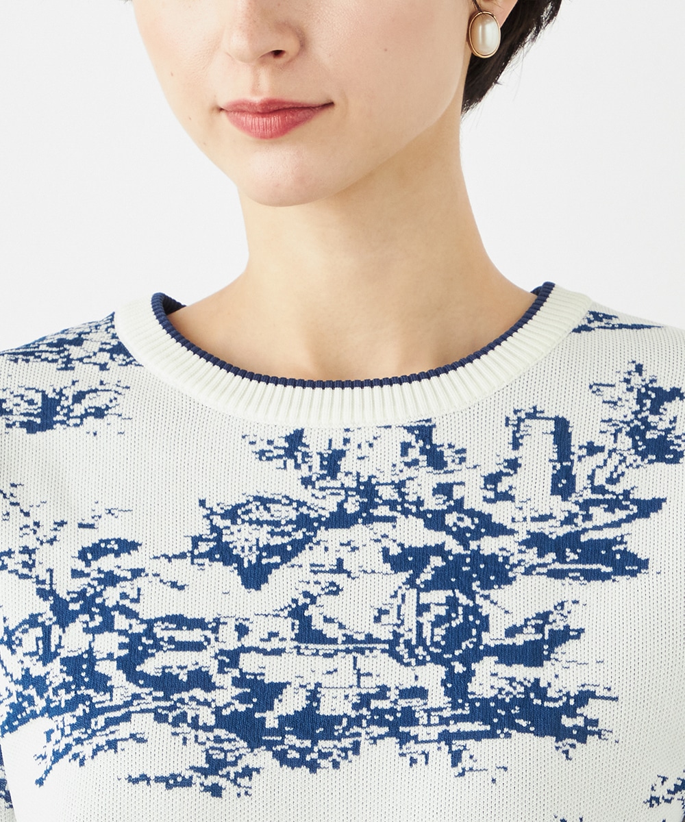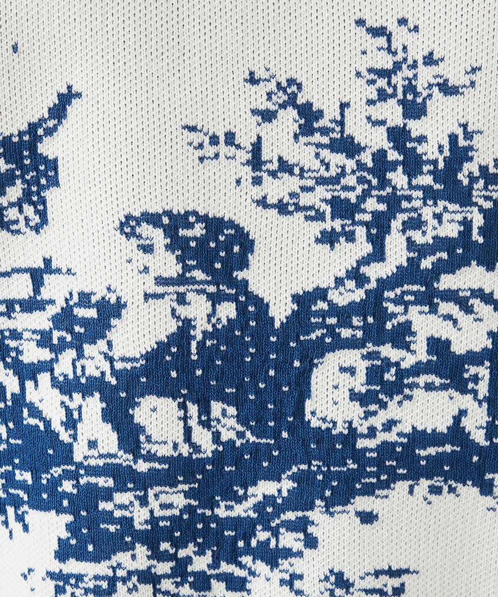 ロココ調の絵画を思わせるようなエレガントな柄使いです。ネックと袖口のリブ端にはラインをデザインして、アクセントを効かせています。ポリエステル糸を使用しており、軽やかな着心地も魅力。ボトムスは無地を選び、トップスを主役にするコーディネートがおすすめです。
