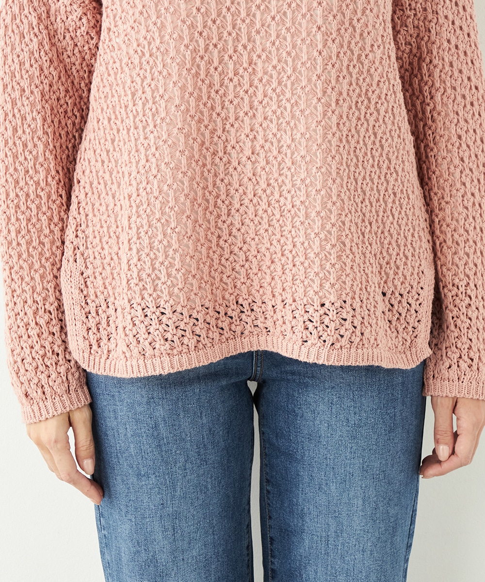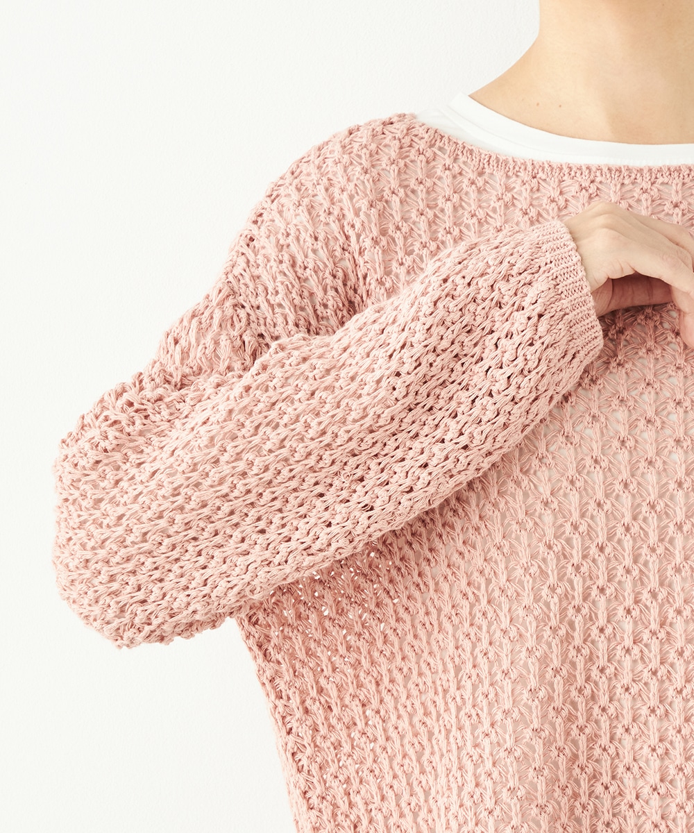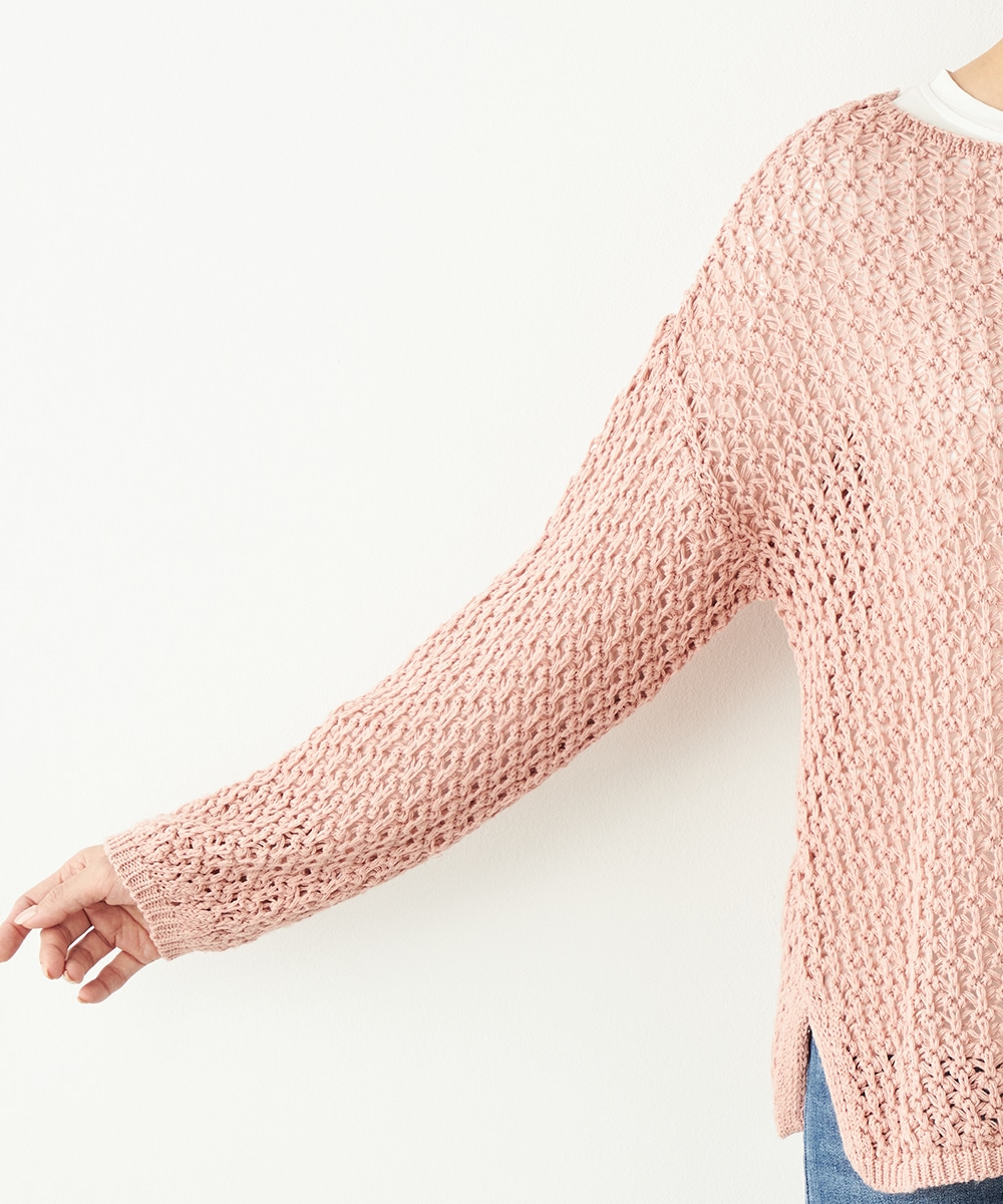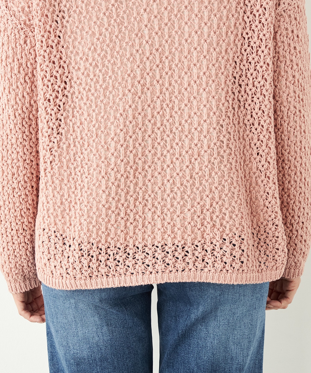 ざっくりとして透け感のある編み地が印象的です。デコルテはほどよく開き、女性らしく着こなせます。フェイスラインがすっきりと見えるのも特徴です。ドロップショルダーのゆったりとしたシルエット。リラックス感が十分でデイリーカジュアルにもぴったりなアイテムです。
