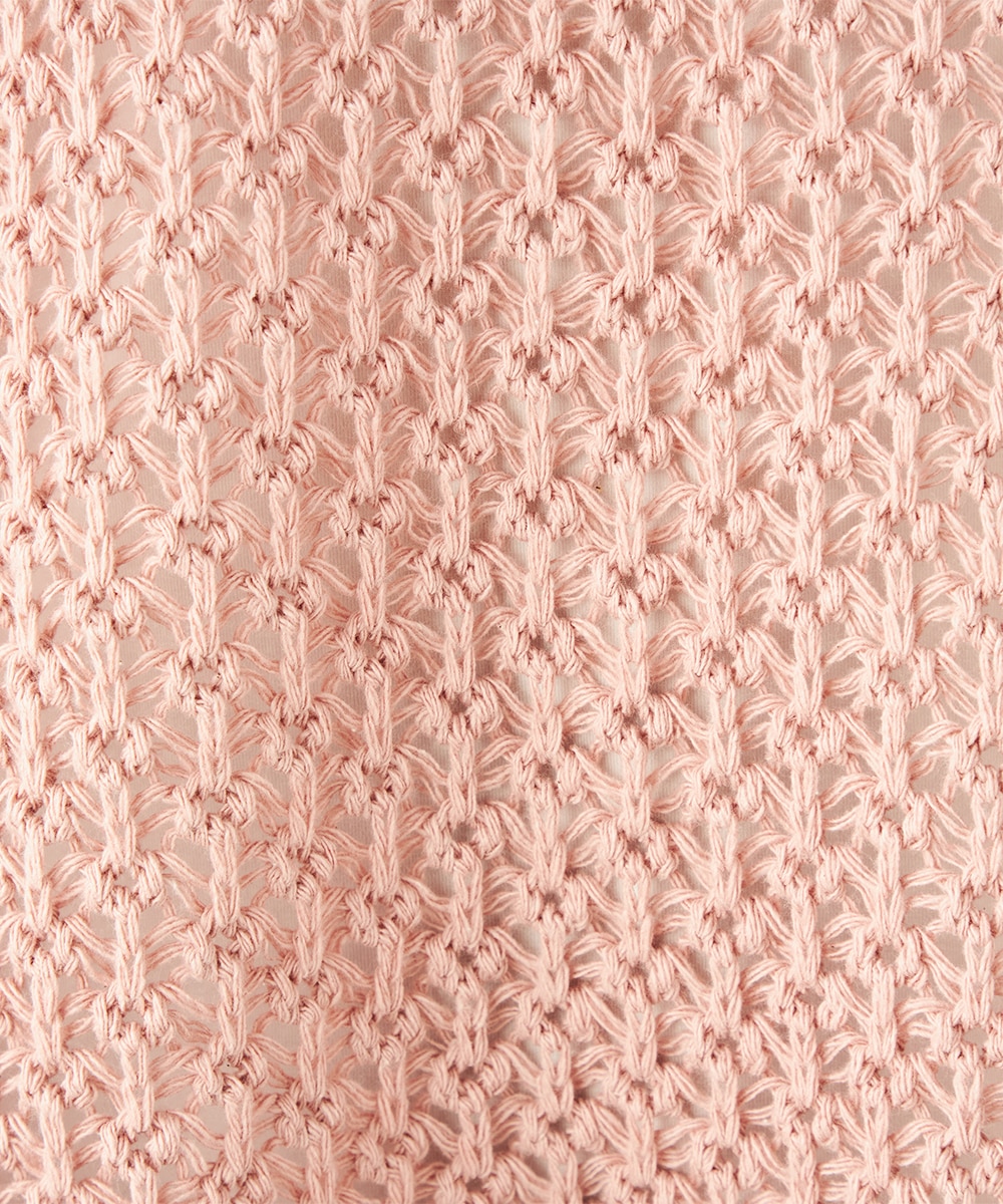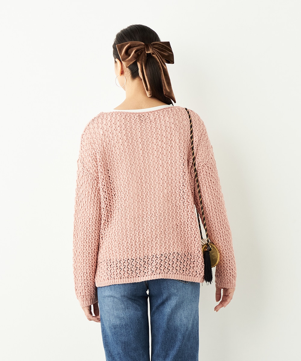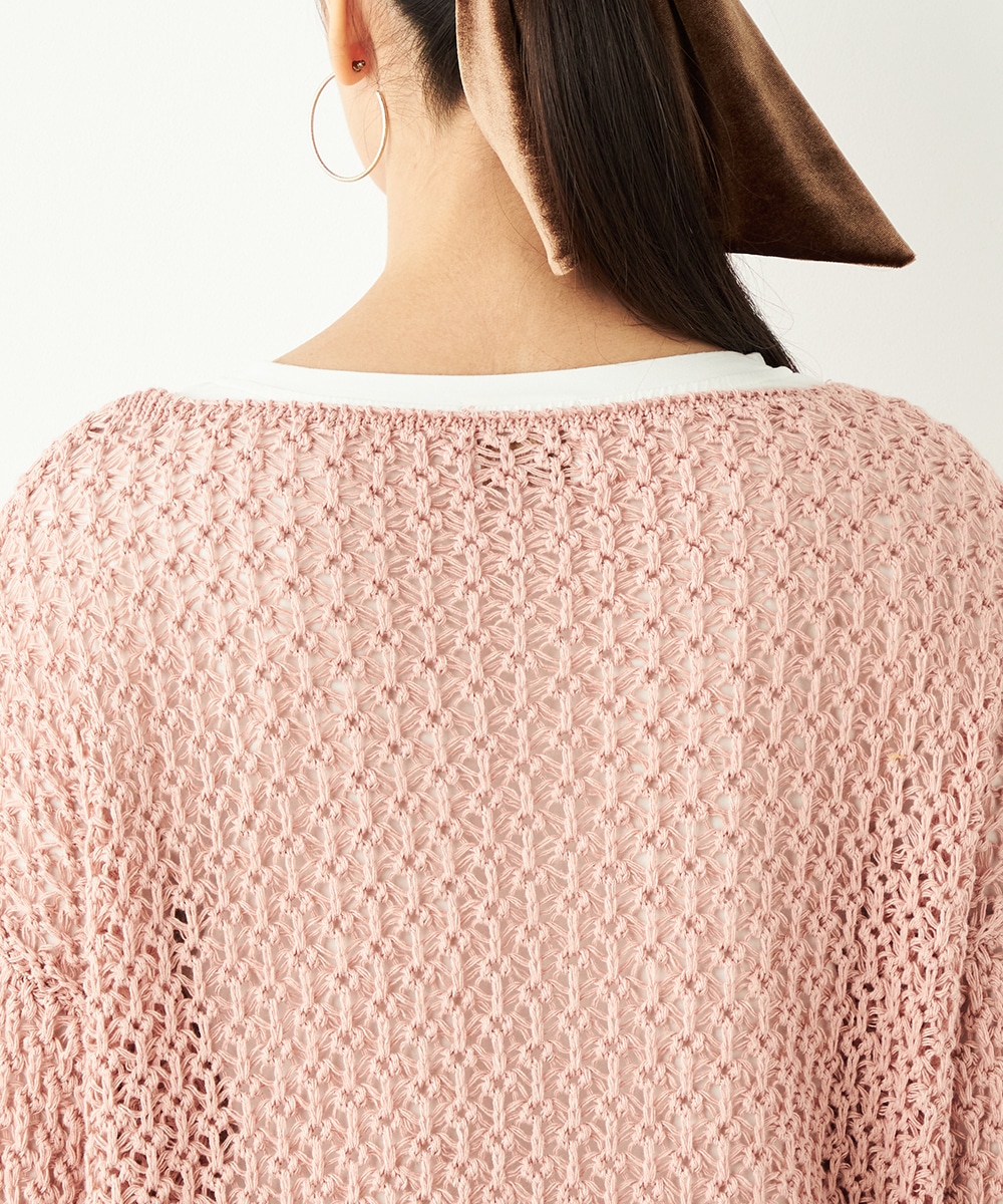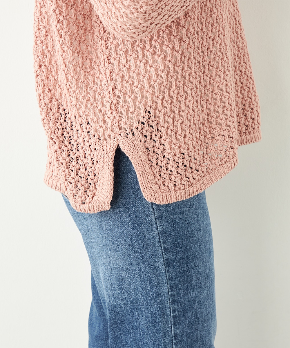 ざっくりとして透け感のある編み地が印象的です。デコルテはほどよく開き、女性らしく着こなせます。フェイスラインがすっきりと見えるのも特徴です。ドロップショルダーのゆったりとしたシルエット。リラックス感が十分でデイリーカジュアルにもぴったりなアイテムです。