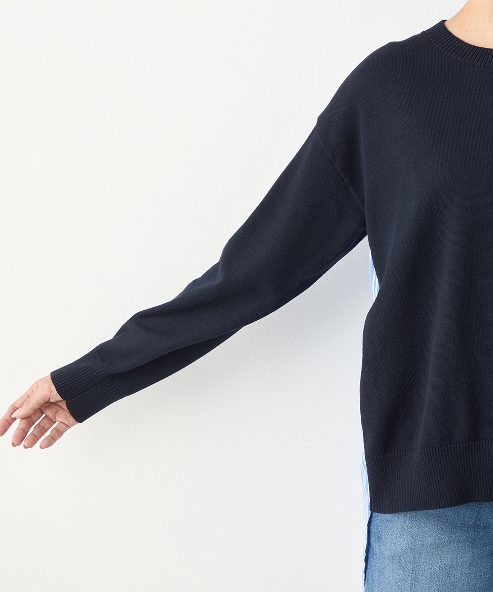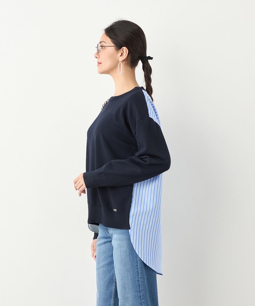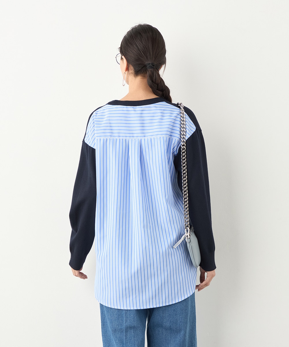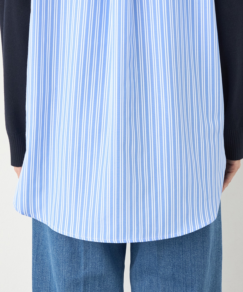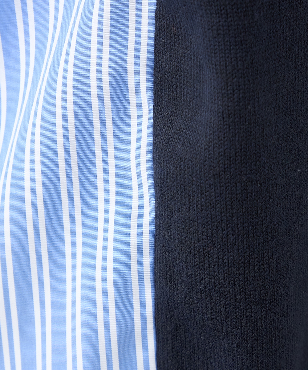 ハイゲージニット素材とストライプの生地のコントラストが印象的なアイテムです。フロントはメタルパーツをワンポイントに、シンプルにまとめています。バックは切り替えとセンタータックを取り入れたシャツ風のルック。コーディネートのポイントとしても活躍します。