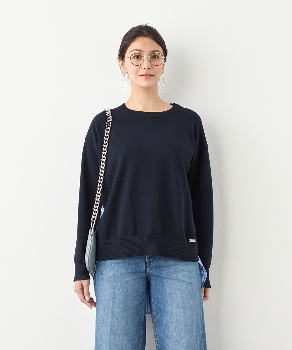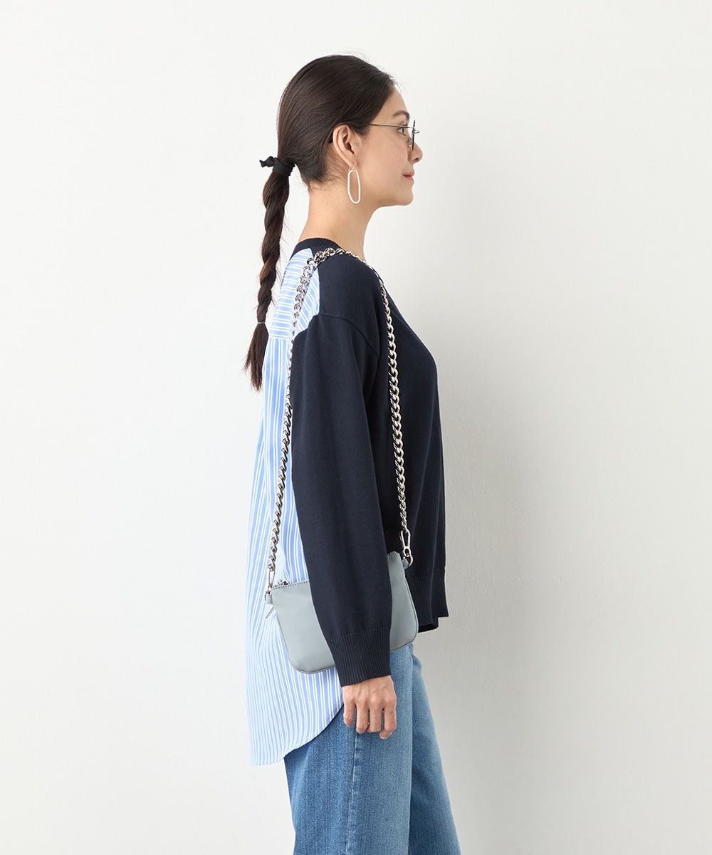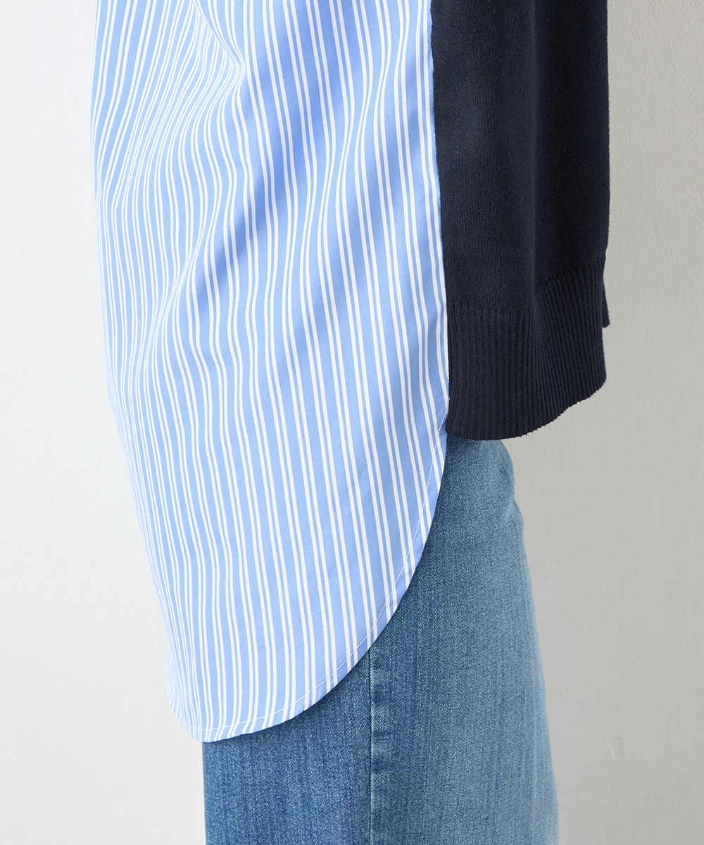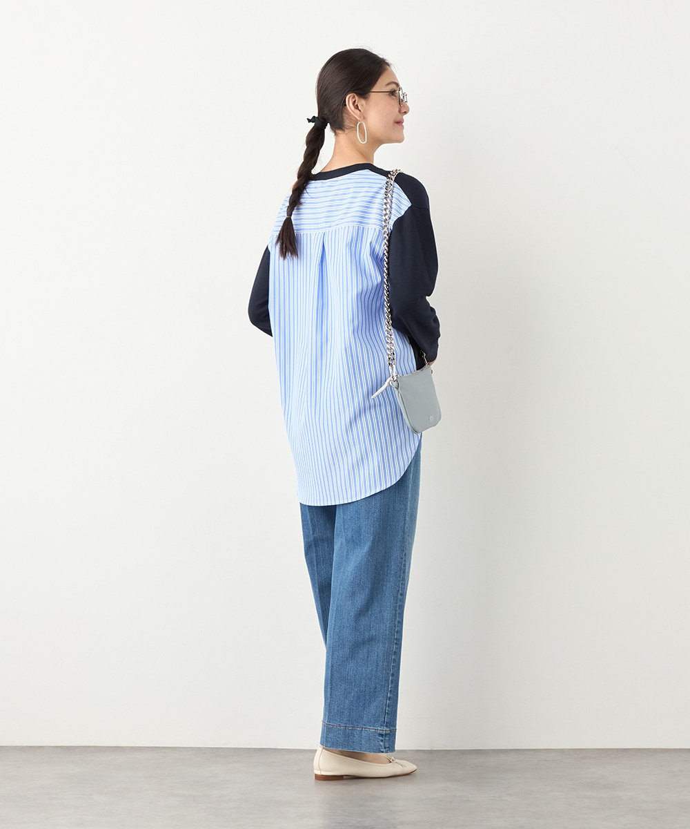 ハイゲージニット素材とストライプの生地のコントラストが印象的なアイテムです。フロントはメタルパーツをワンポイントに、シンプルにまとめています。バックは切り替えとセンタータックを取り入れたシャツ風のルック。コーディネートのポイントとしても活躍します。