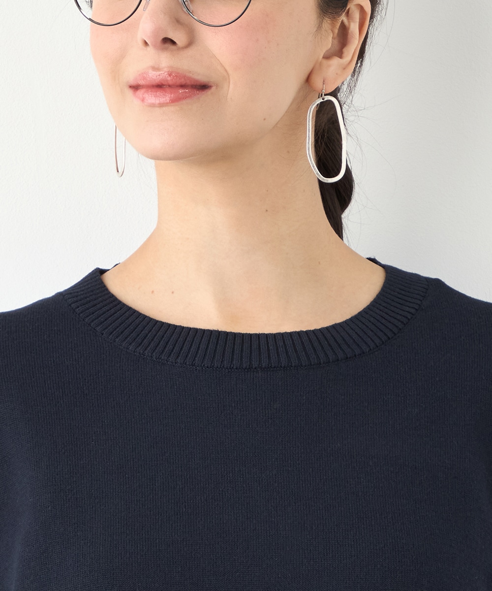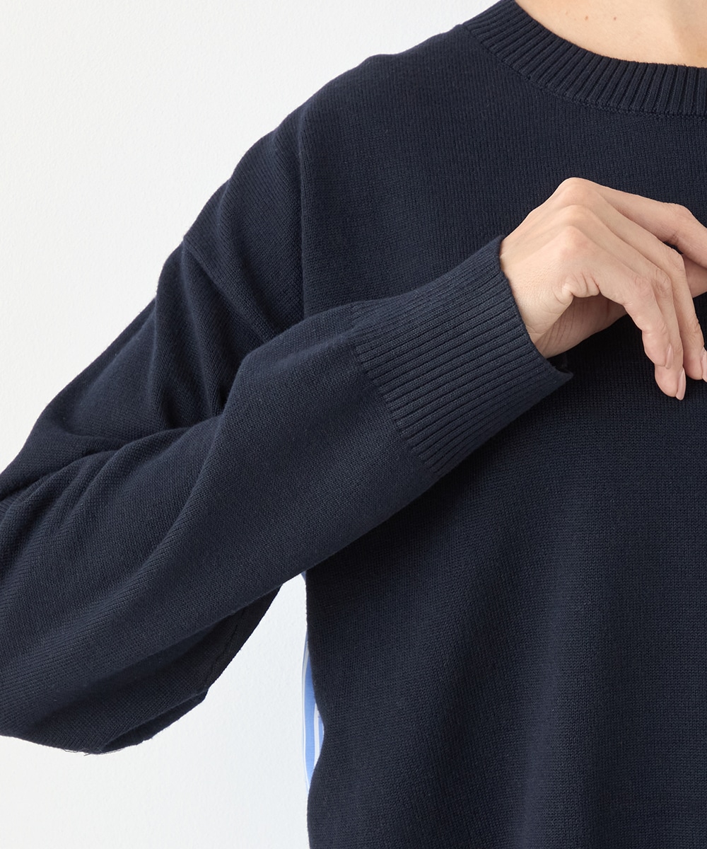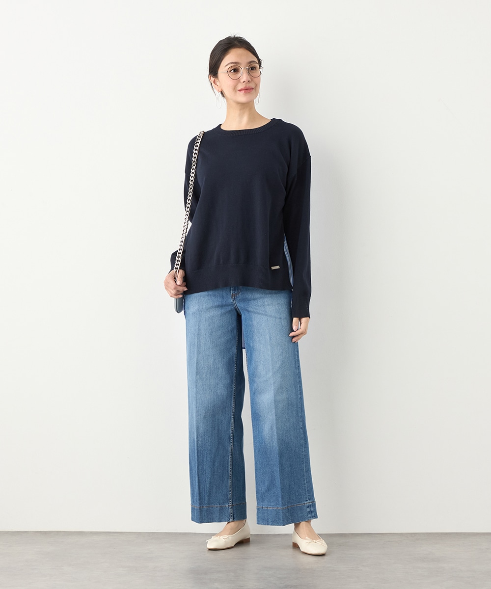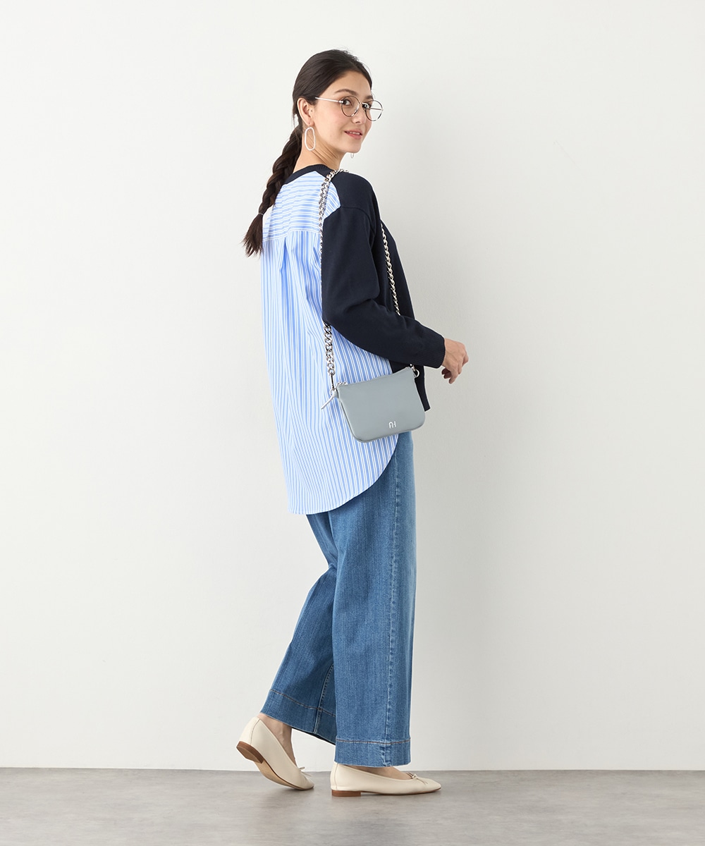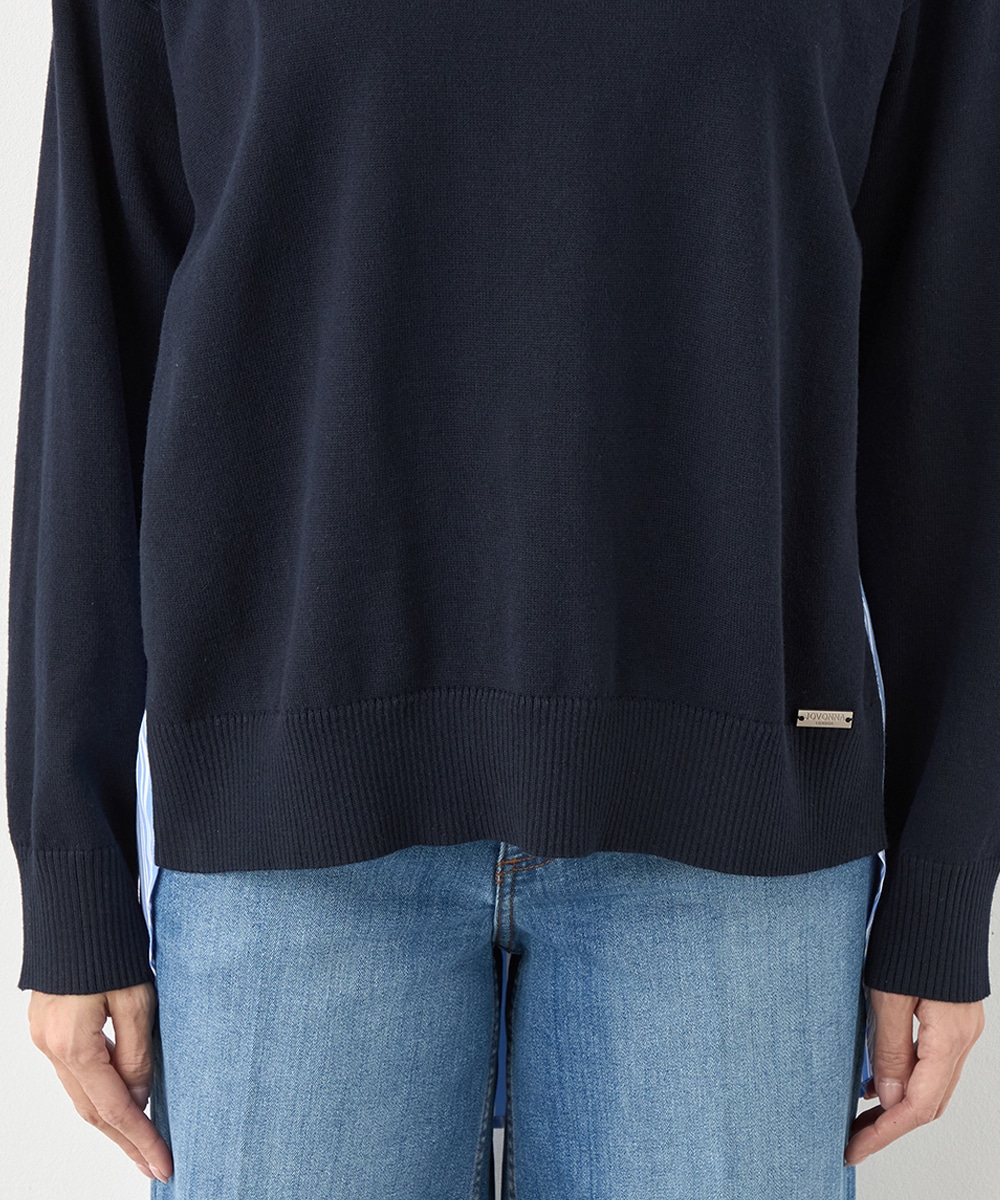 ハイゲージニット素材とストライプの生地のコントラストが印象的なアイテムです。フロントはメタルパーツをワンポイントに、シンプルにまとめています。バックは切り替えとセンタータックを取り入れたシャツ風のルック。コーディネートのポイントとしても活躍します。