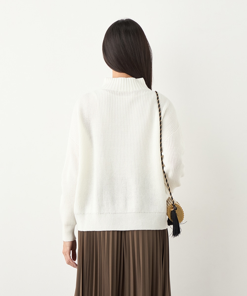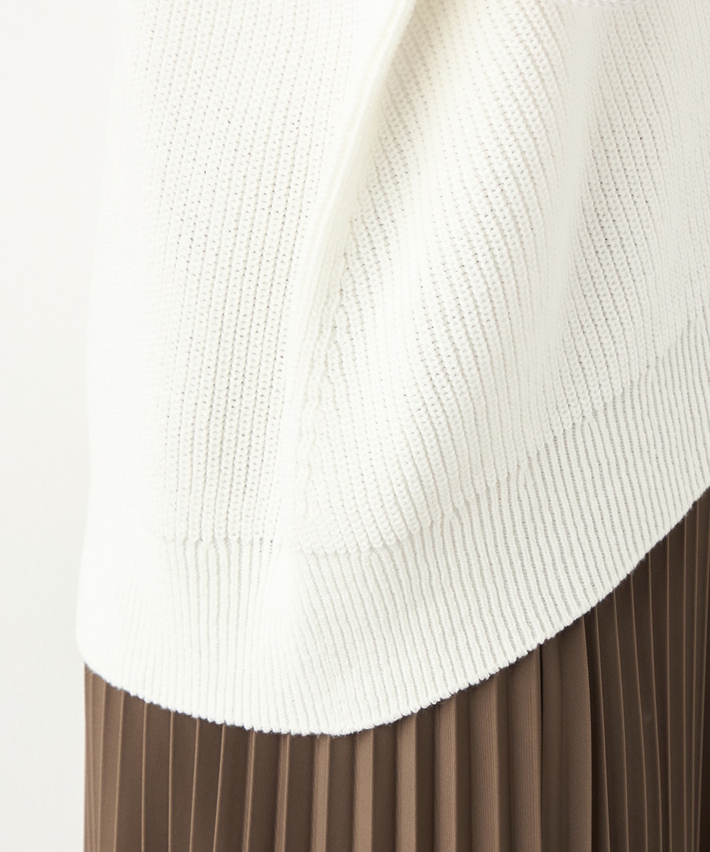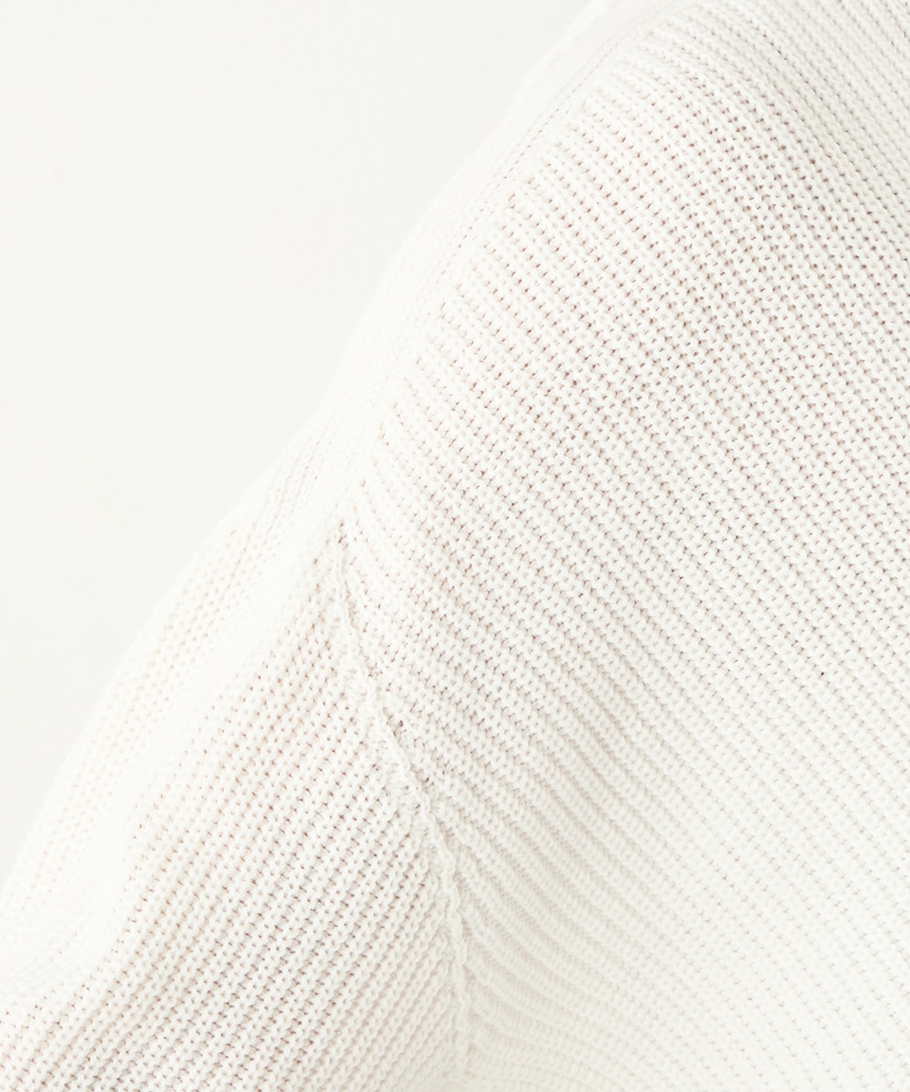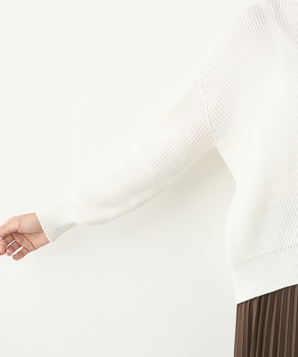 綿混糸を表情豊かに編み上げています。魚沼産ならではのソフトな風合いも魅力です。装飾は省き、着こなしやすいシンプルなデザインに仕上げました。シルエットはゆったりとしてリラックス感があり、トレンドにもマッチ。定番のオフホワイトはもちろん、ややスモーキーなミントやラベンダーのきれいなカラーもおすすめです。