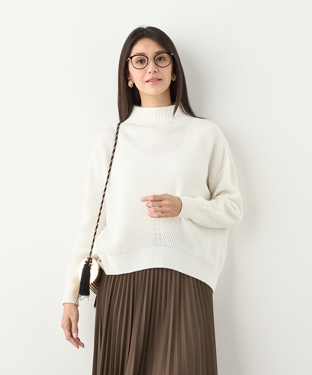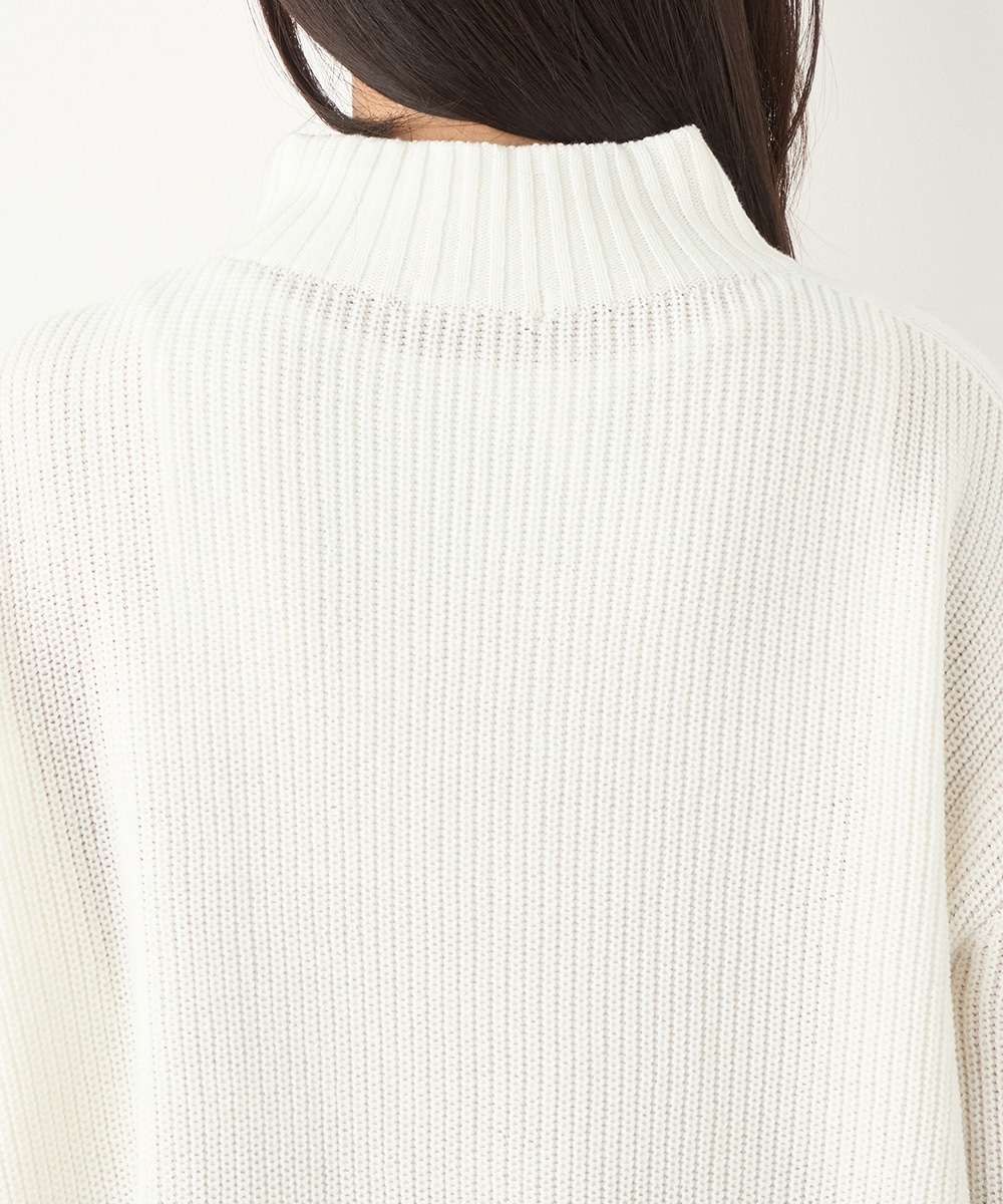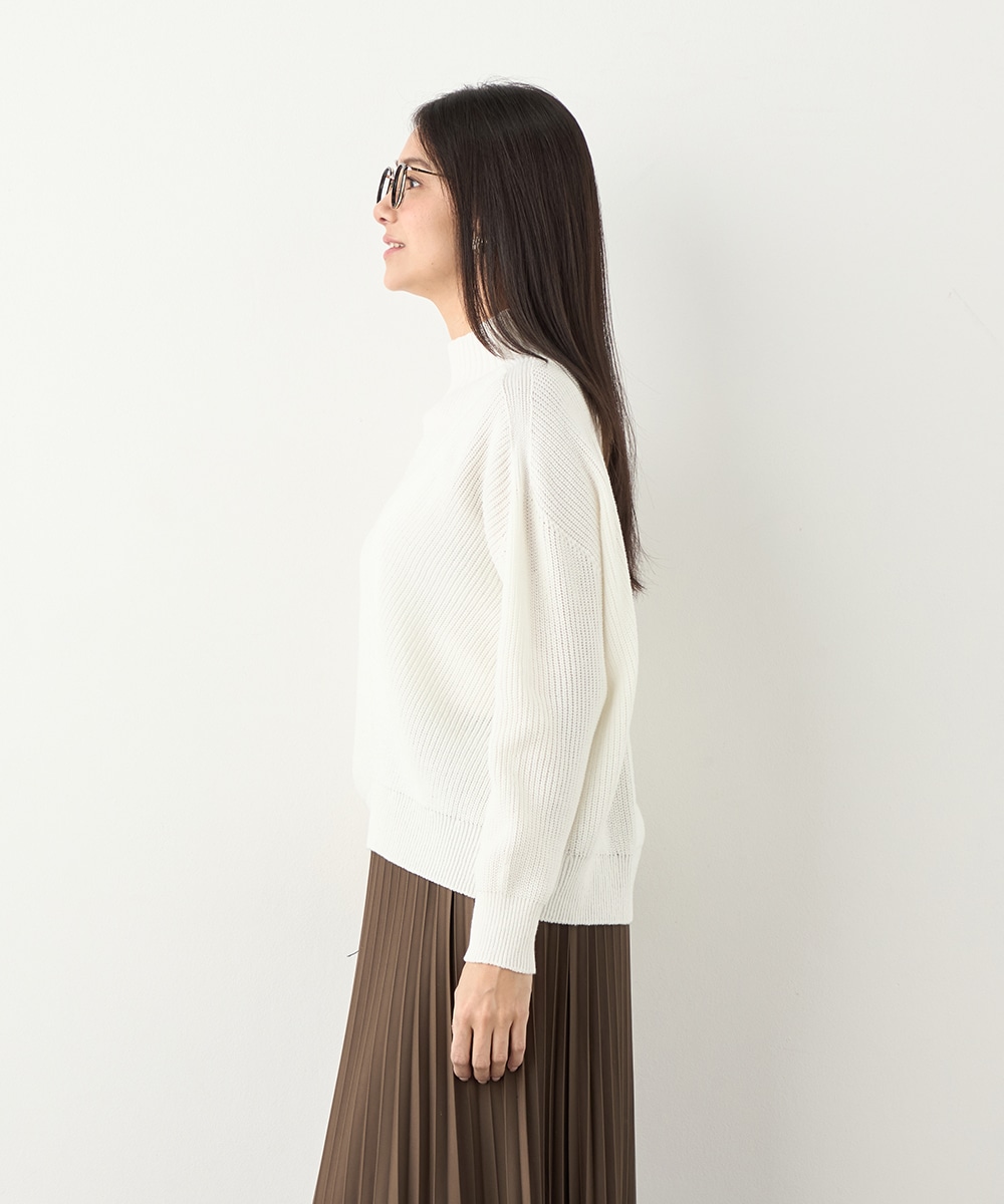 綿混糸を表情豊かに編み上げています。魚沼産ならではのソフトな風合いも魅力です。装飾は省き、着こなしやすいシンプルなデザインに仕上げました。シルエットはゆったりとしてリラックス感があり、トレンドにもマッチ。定番のオフホワイトはもちろん、ややスモーキーなミントやラベンダーのきれいなカラーもおすすめです。