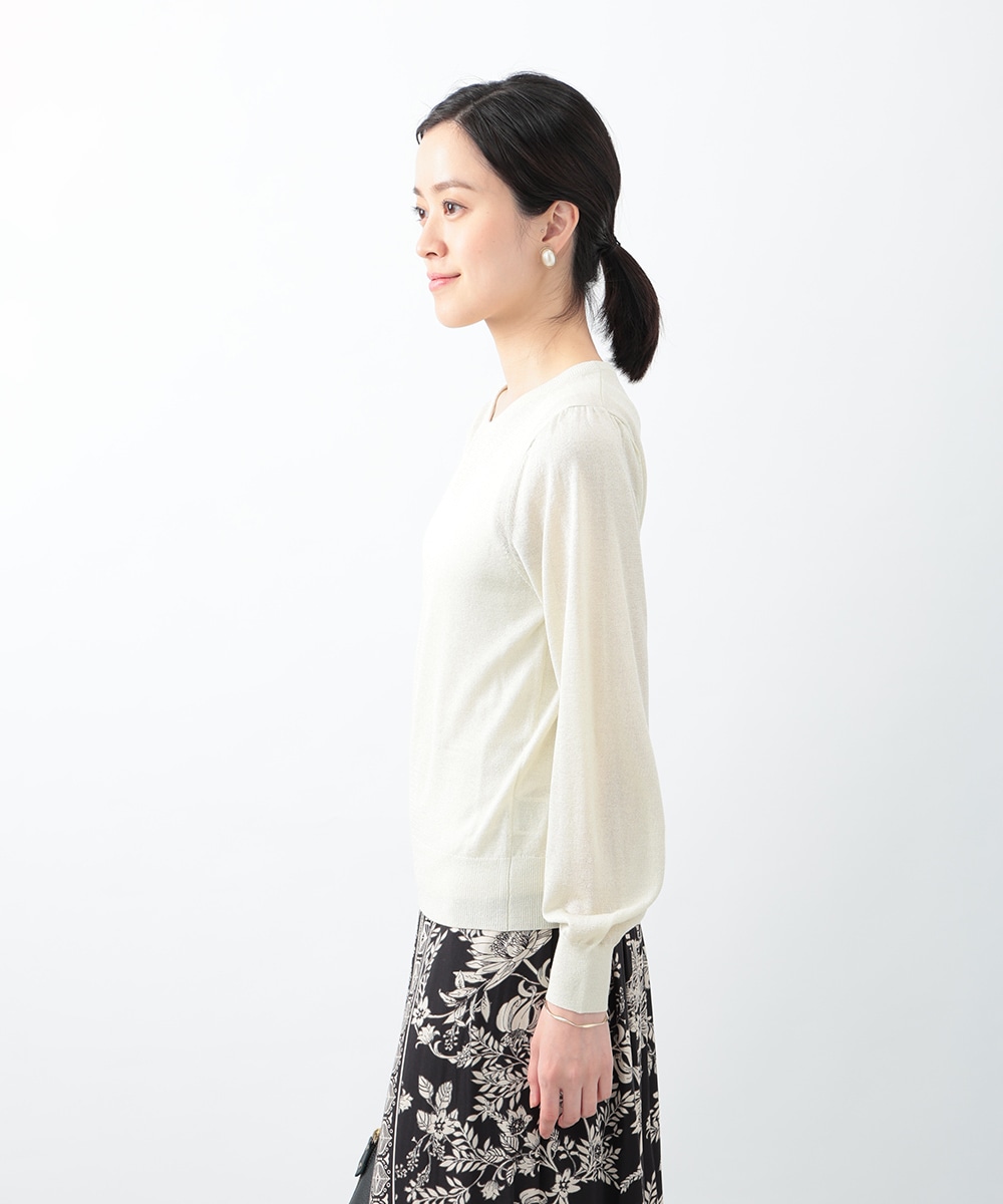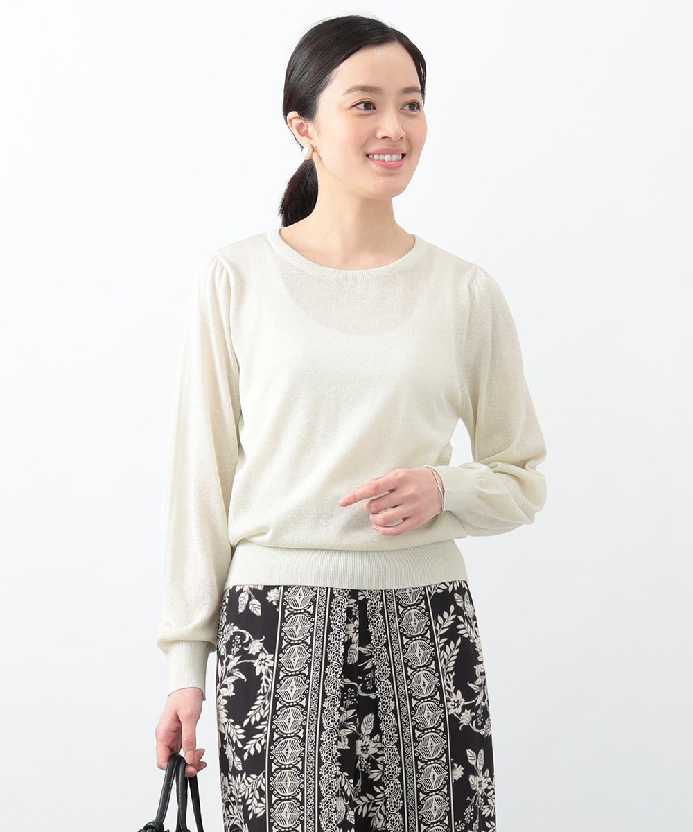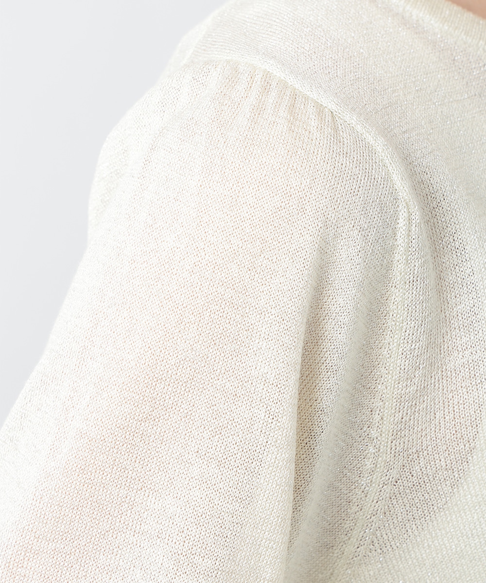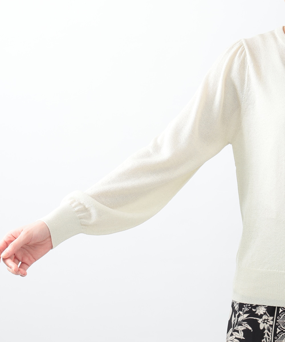 キメの細かいラメ糸を引き揃えたパフデザインニット。リラックス感のあるパフスリーブが立体的なシルエットを演出します。生地にはほんのり透け感があり、涼しげに着用できるのもポイント。どんなスタイリングにも取り入れやすい定番のデザインで、季節の変わり目に重宝します。