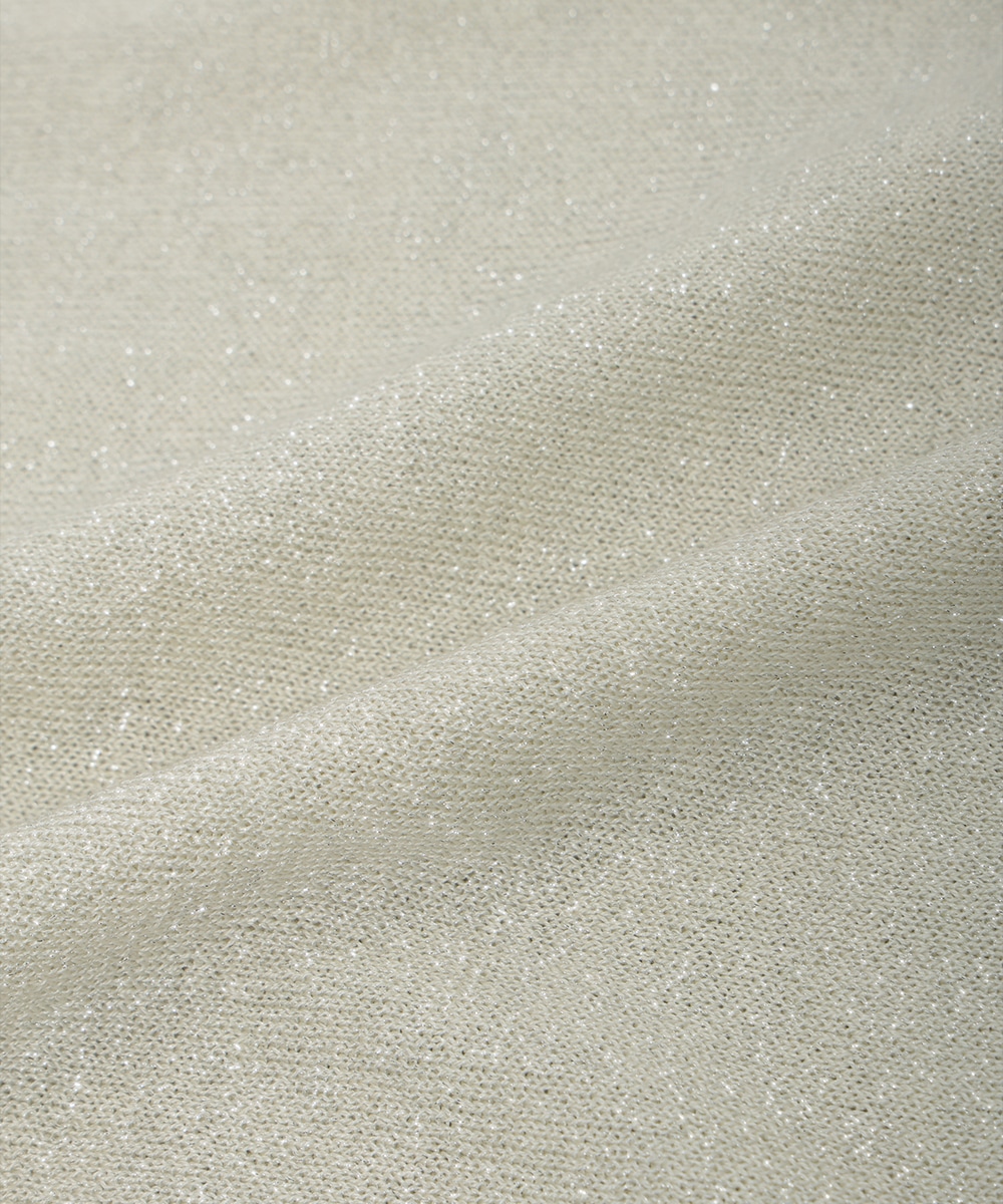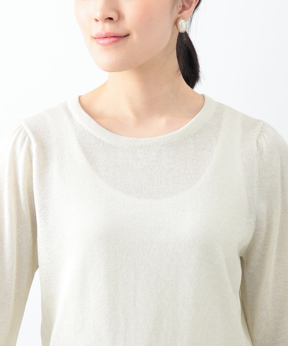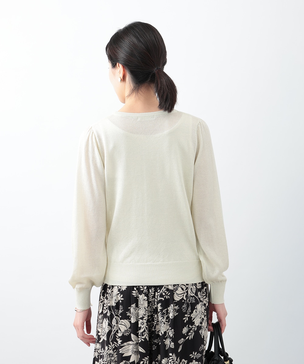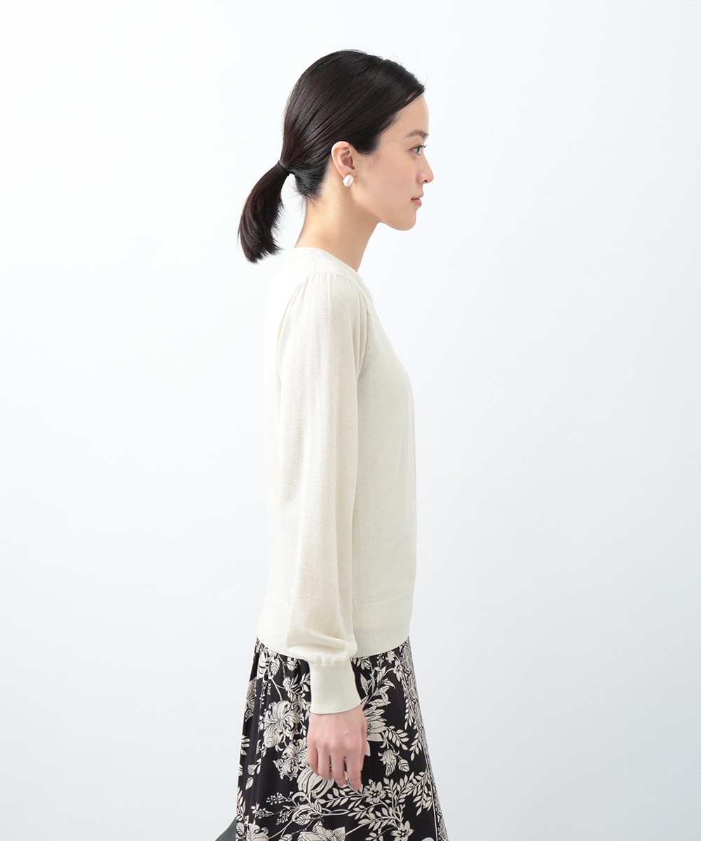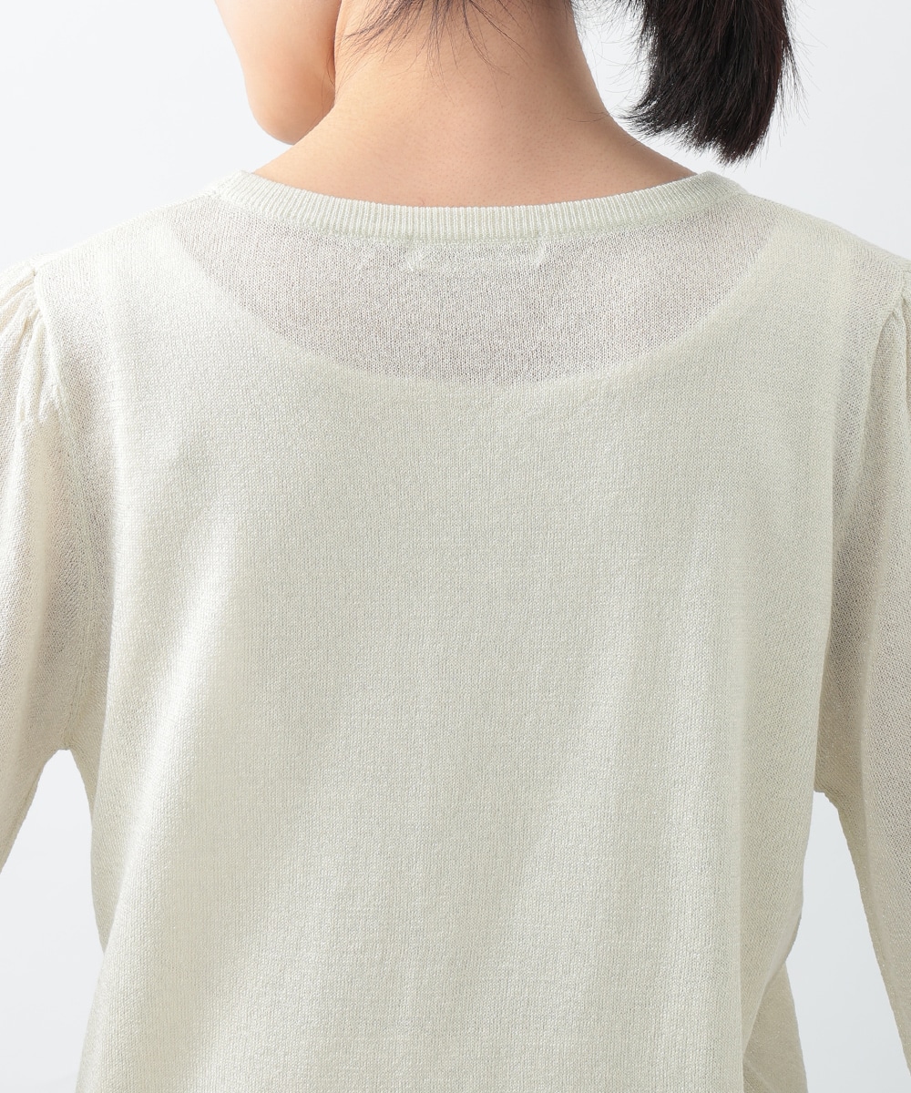キメの細かいラメ糸を引き揃えたパフデザインニット。リラックス感のあるパフスリーブが立体的なシルエットを演出します。生地にはほんのり透け感があり、涼しげに着用できるのもポイント。どんなスタイリングにも取り入れやすい定番のデザインで、季節の変わり目に重宝します。