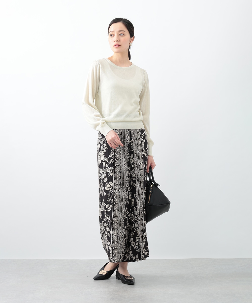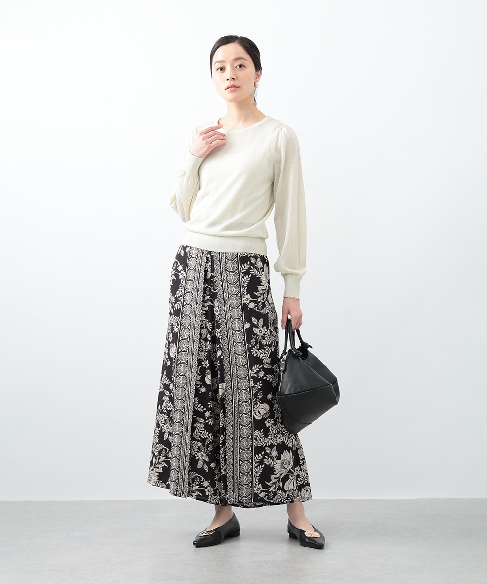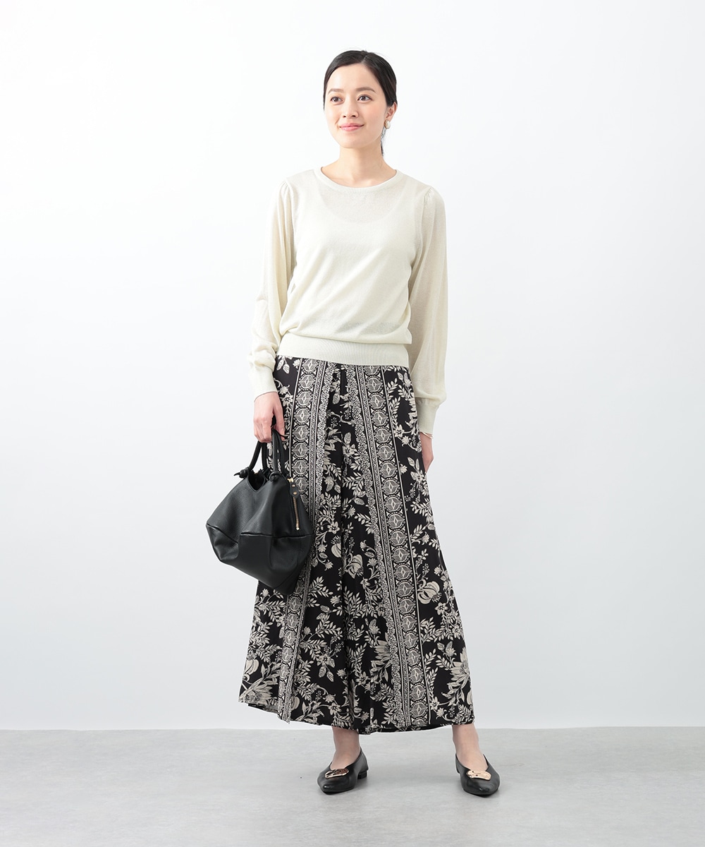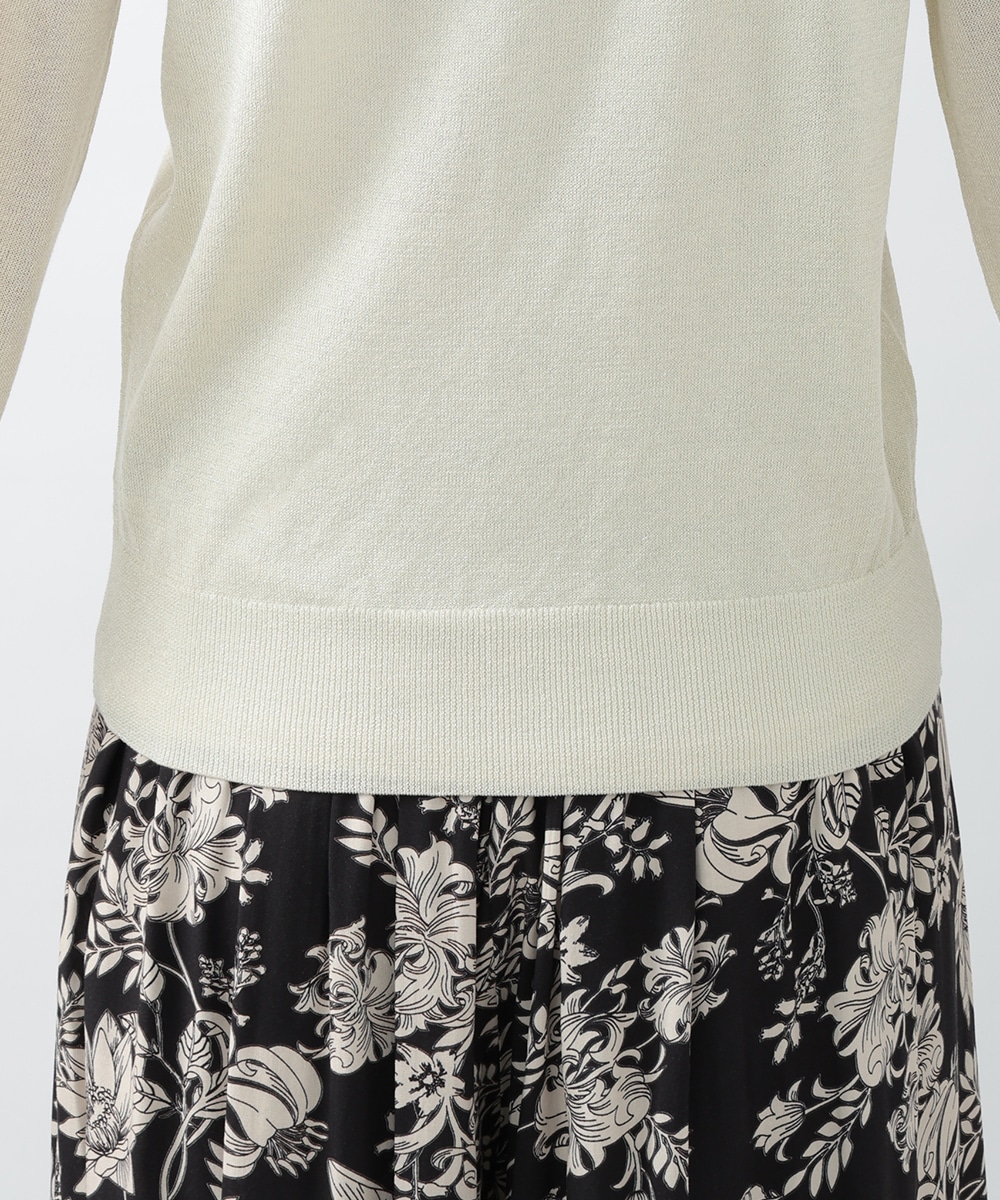 キメの細かいラメ糸を引き揃えたパフデザインニット。リラックス感のあるパフスリーブが立体的なシルエットを演出します。生地にはほんのり透け感があり、涼しげに着用できるのもポイント。どんなスタイリングにも取り入れやすい定番のデザインで、季節の変わり目に重宝します。